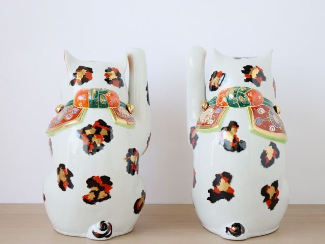 一般的な招き猫の耳は前を向きお座りしているスタイルですが、九谷焼の招き猫は、耳は横向きに反っていたり、鈴が首元の横についていたり、横座りをしているなど他とは違ったデザインも魅力のひとつです。