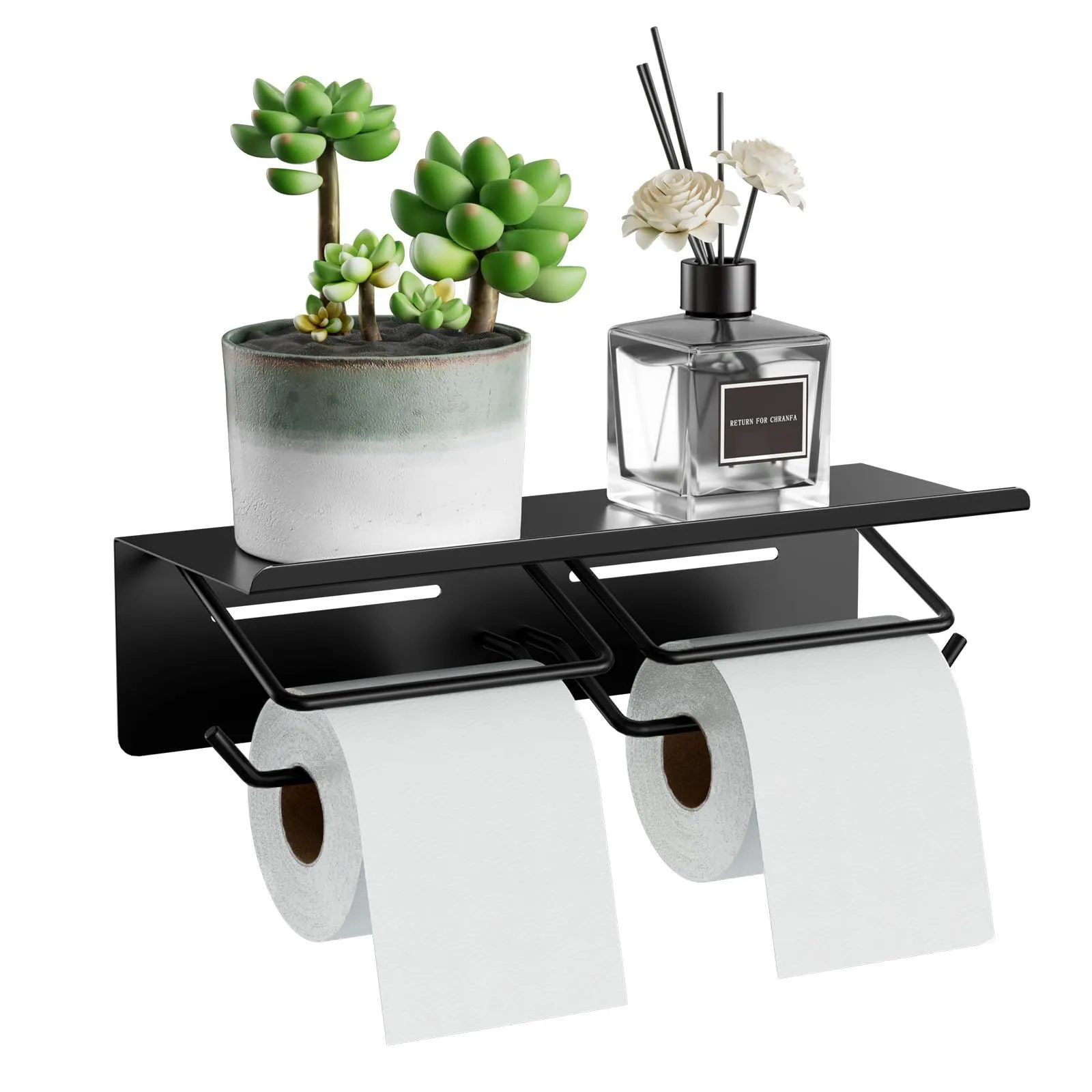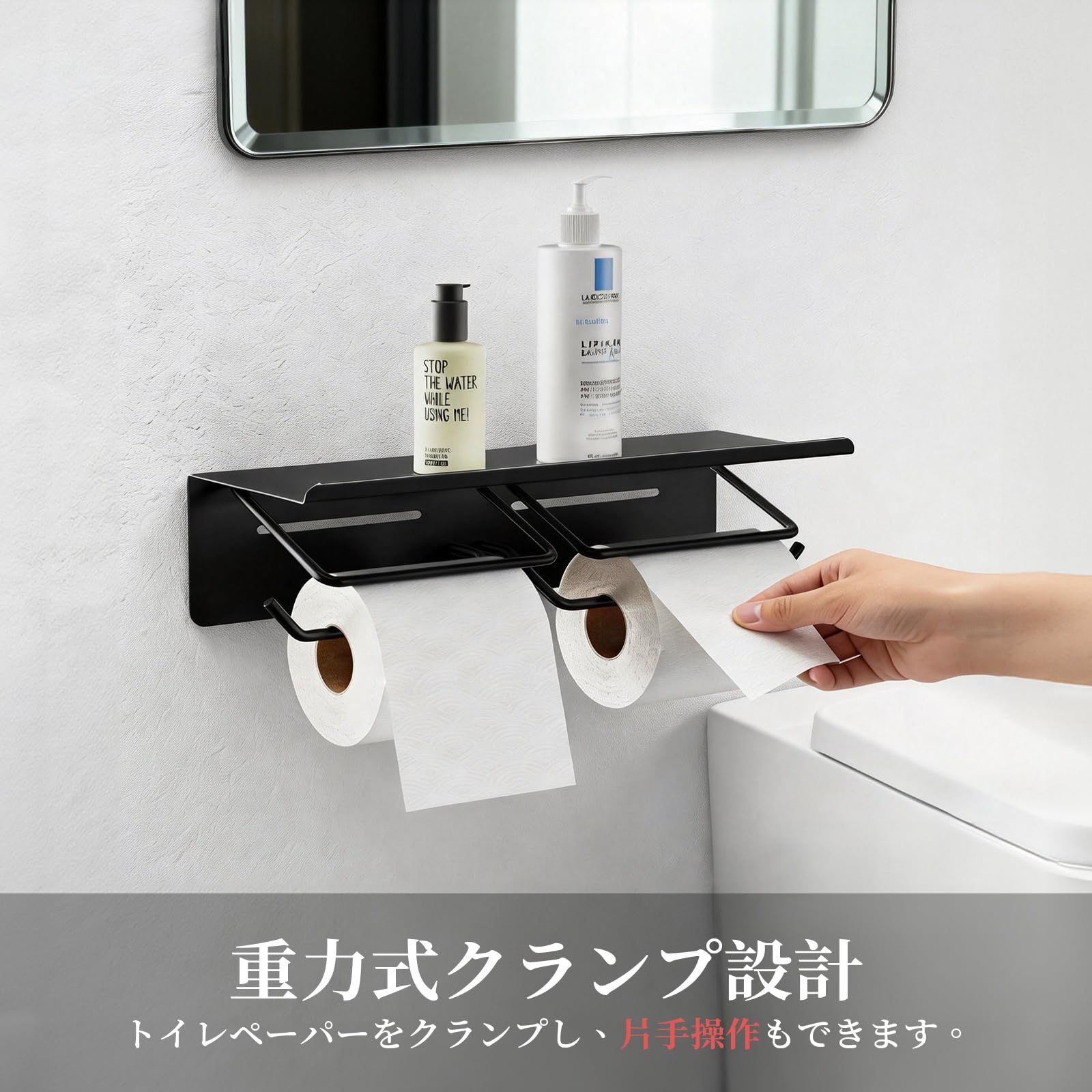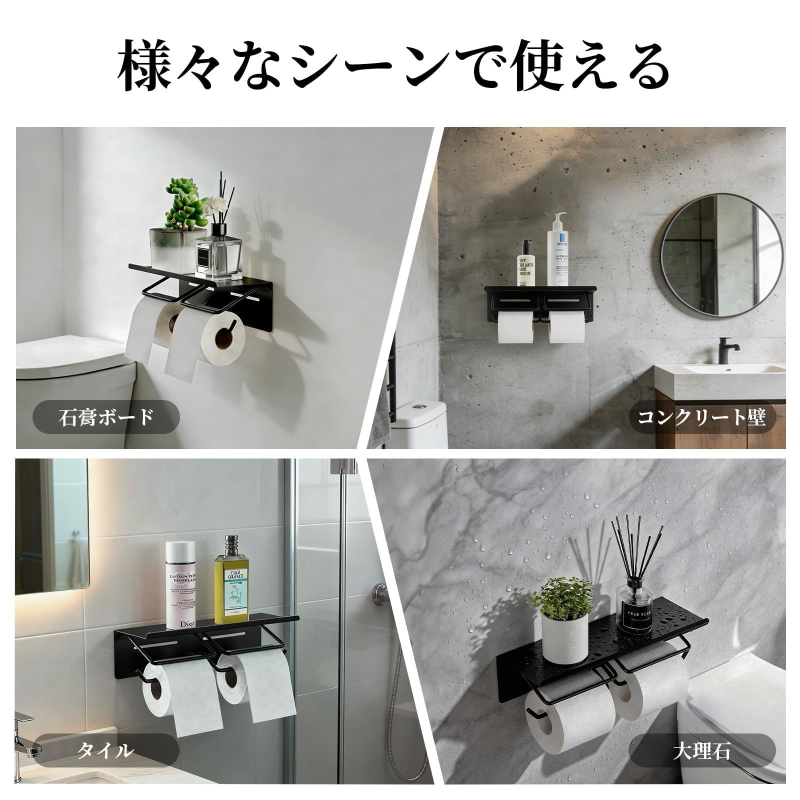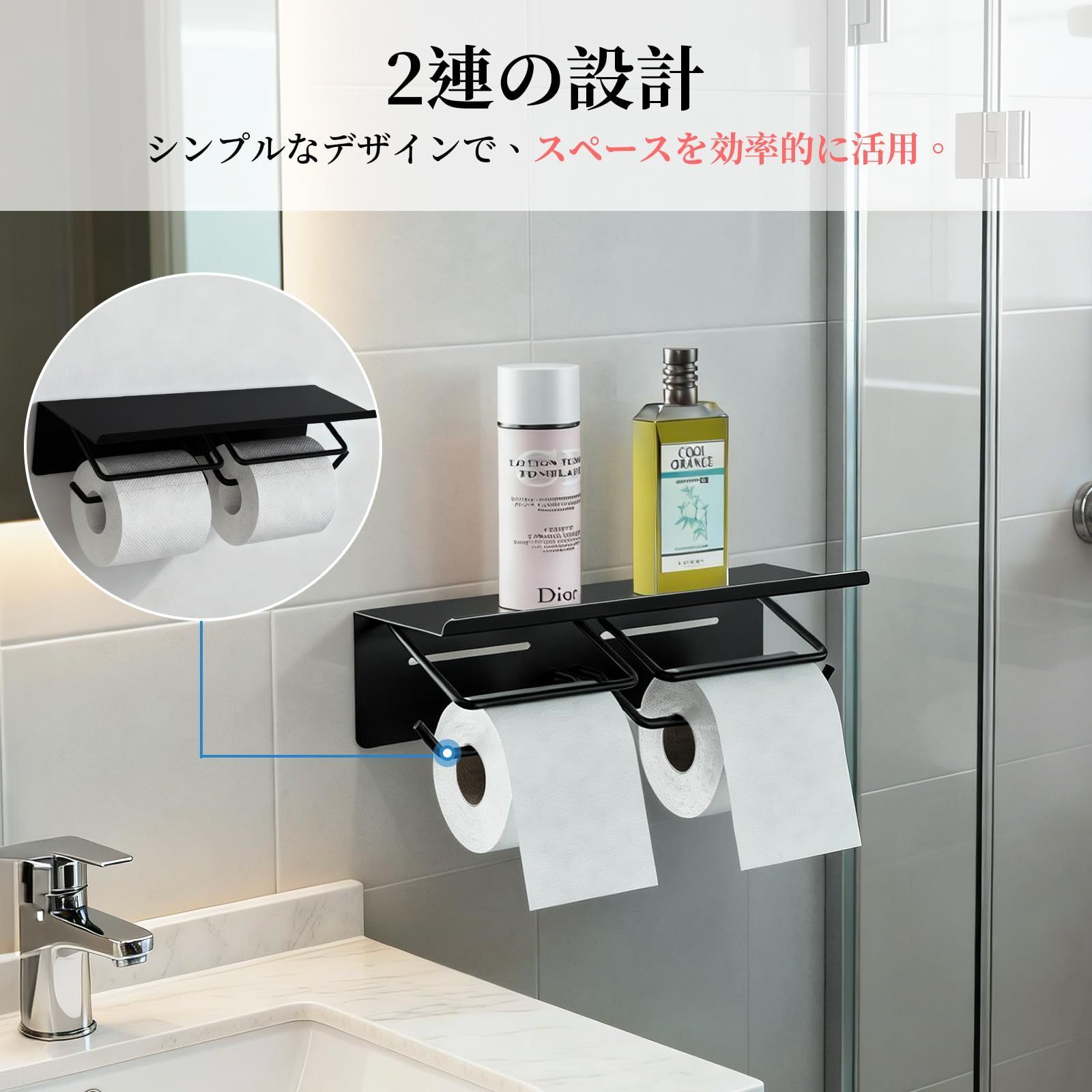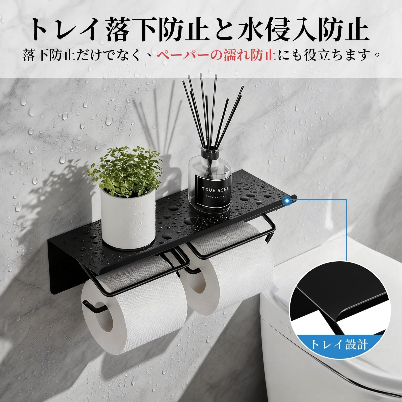 トイレペーパーホルダー 2連式 賃貸対応 おしゃれ トレイ付き 小物置き 落下防止 錆びにくい鉄製 省スペース ヴィンテージ 多機能型 簡単設置 トイレ 浴室用 洗面所 収納 ブラック
