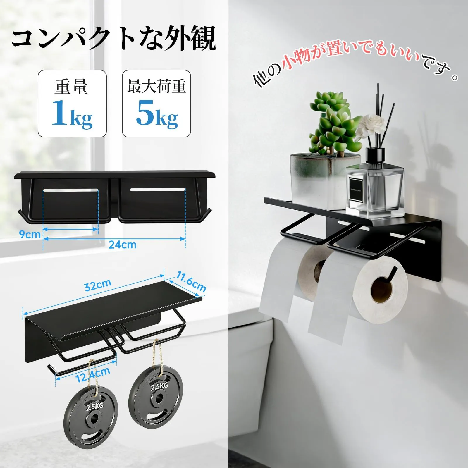 【製品のサイズ】幅32cm x 奥行12cm x 高さ9cm、最大耐荷重5kg。2巻のトイレットペーパーを同時に収納可能で、トイレットペーパーの交換の手間を軽減します。