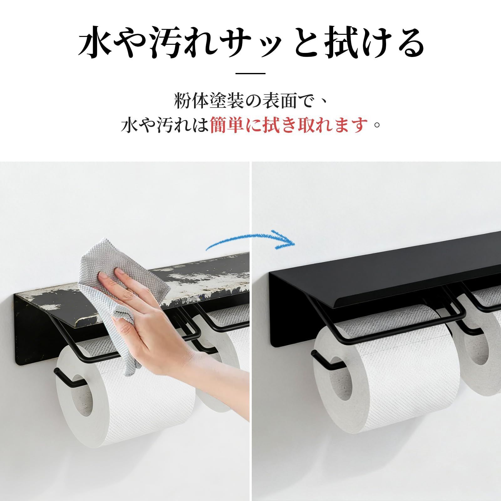 【金属製フレームと粉体塗装加工】本体フレームは金属製で、非常に頑丈で高い耐久性があります。プラスチックや木製のホルダーに比べ、カビ・変形に強く、長くご使用いただけます。金属素材に粉体塗装を施すことで、耐久性を向上させるとともに、耐水性・耐傷性・防錆性を高め、製品寿命を大幅に延ばします。