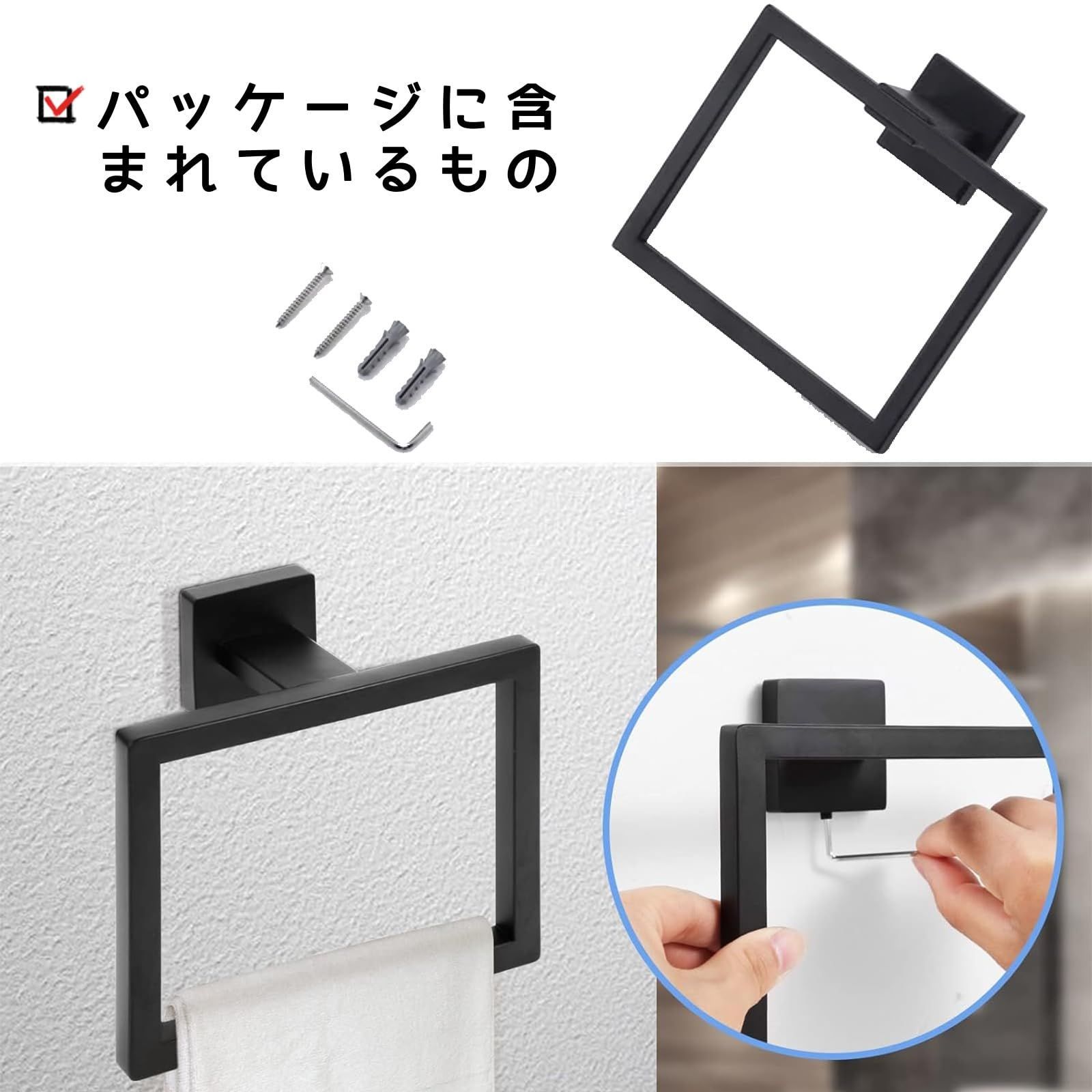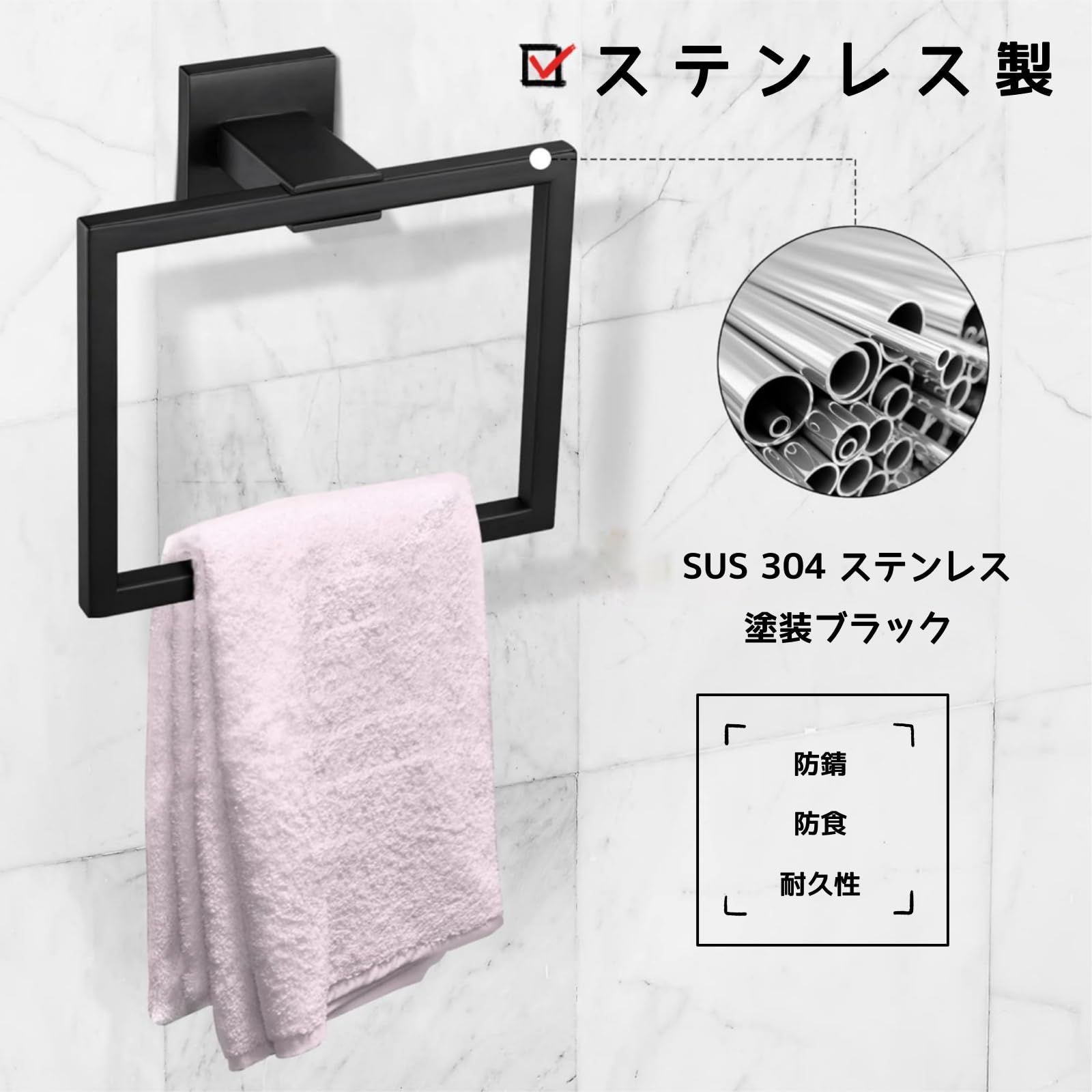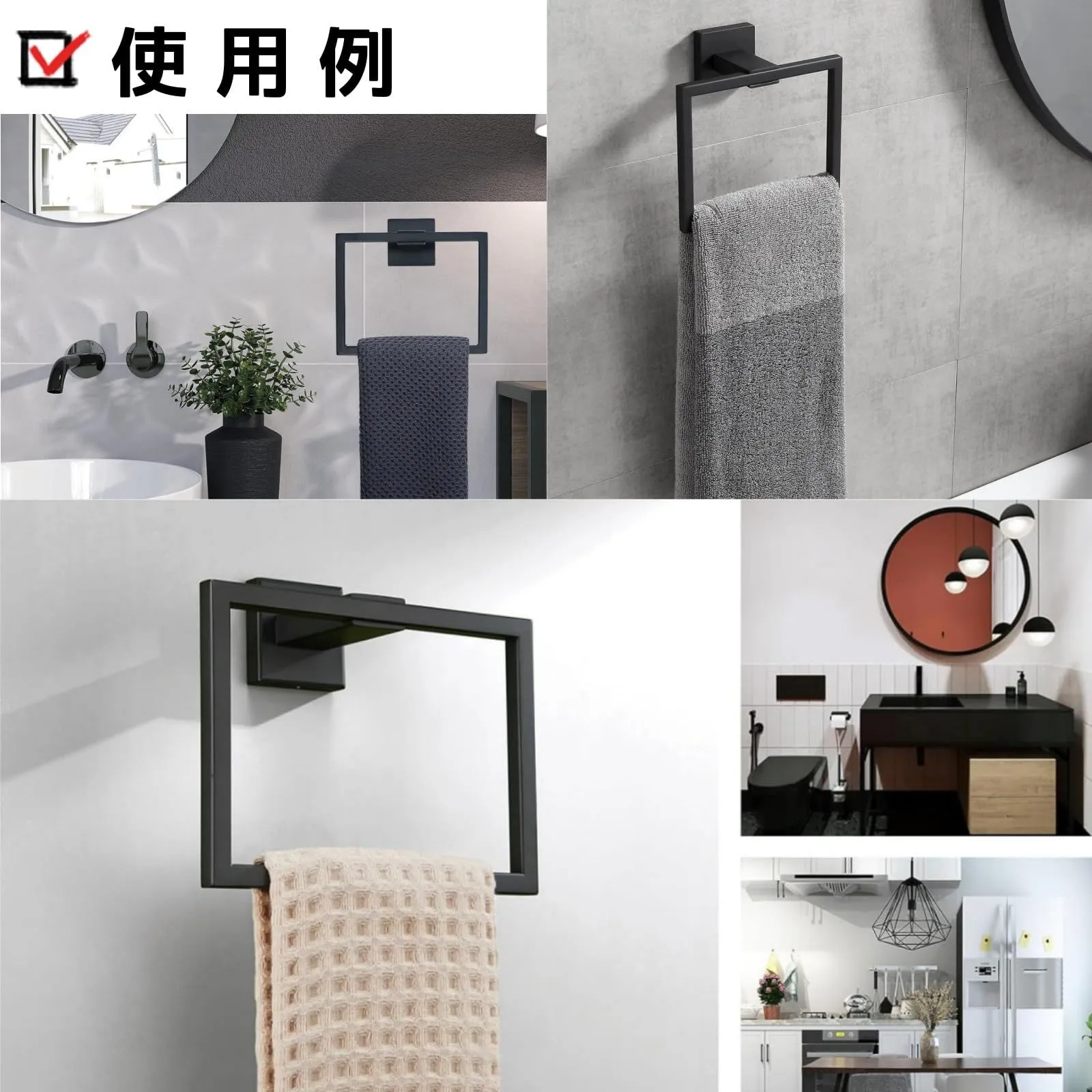 タオル掛けリング ステンレス 壁掛け タオルかけ タオルリング おしゃれ シンプルモダン タオルホルダー タオルハンガー (壁掛け ネジ付) 収納 トイレ浴室 洗面所 キッチン お風呂用 ブラック ネジ付き (四角)