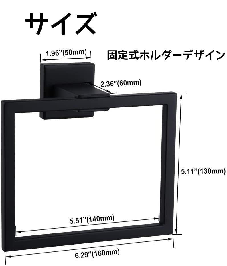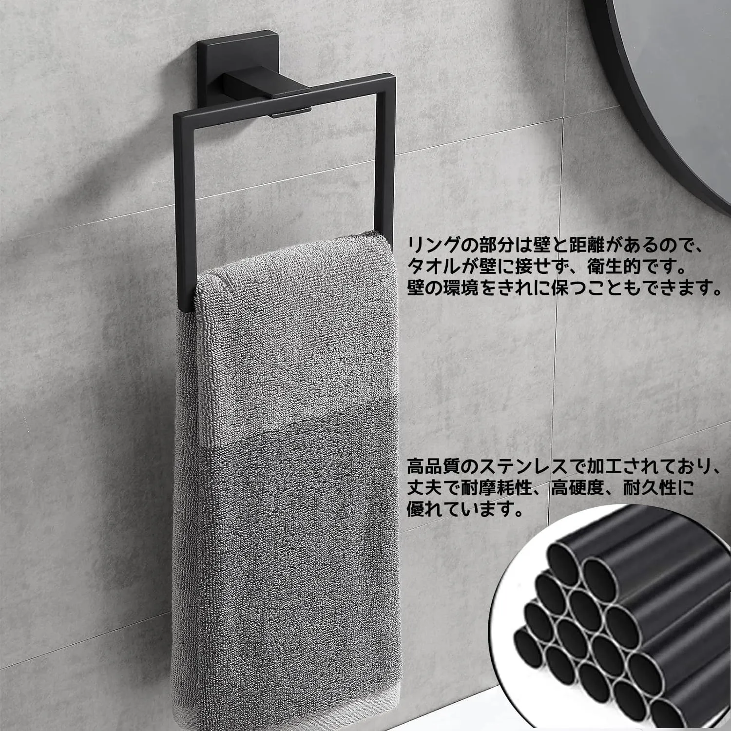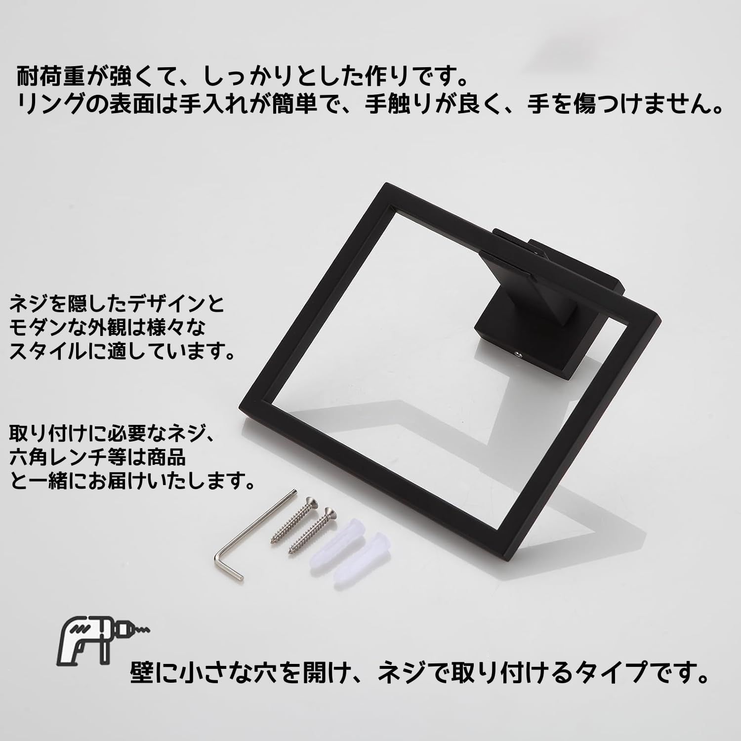 タオル掛けリング ステンレス 壁掛け タオルかけ タオルリング おしゃれ シンプルモダン タオルホルダー タオルハンガー (壁掛け ネジ付) 収納 トイレ浴室 洗面所 キッチン お風呂用 ブラック ネジ付き (四角)