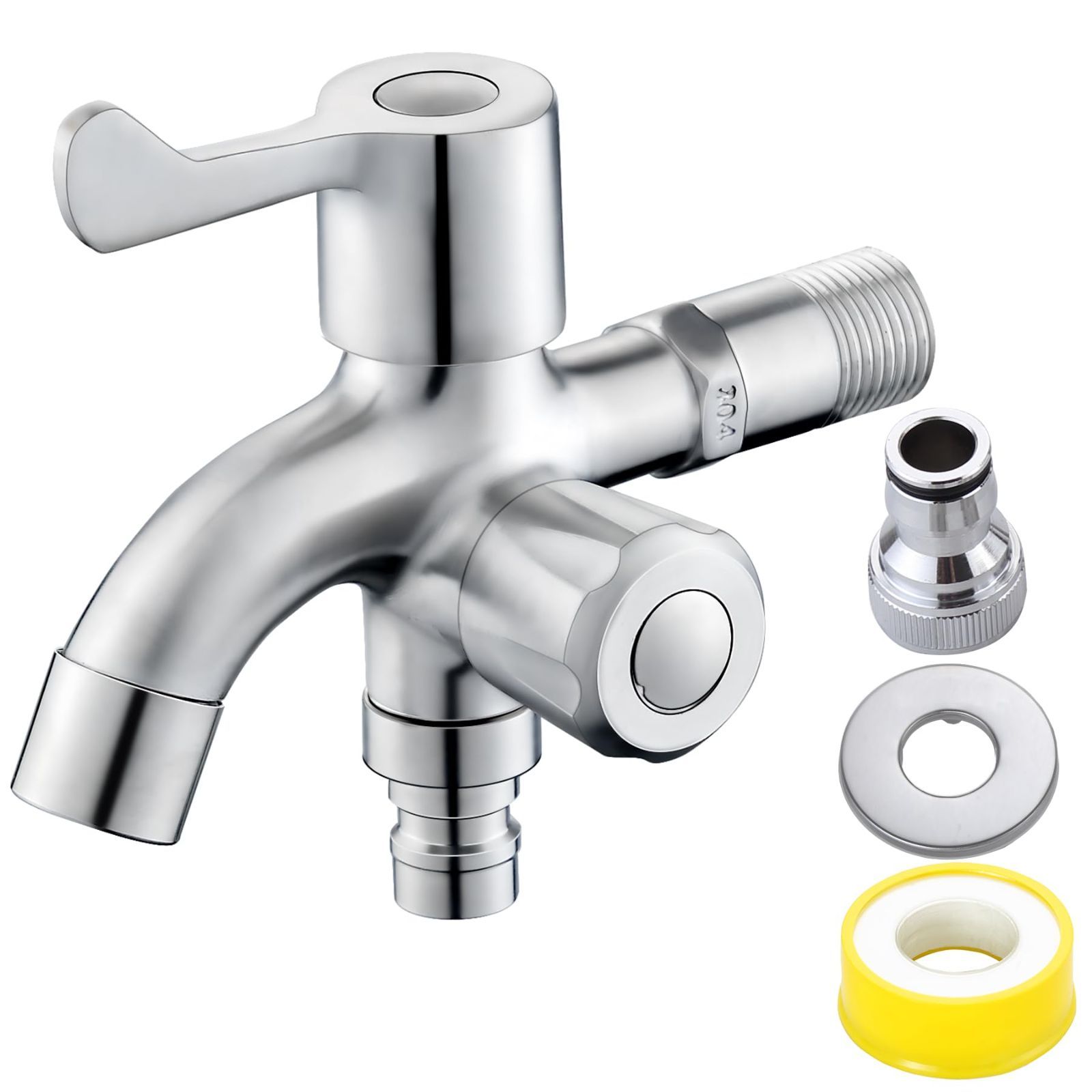 水道蛇口二股:屋外での使用のためのこの2口蛇口には2つの水分があります,洗濯機ホース接続ニップル付二股蛇口,2つの真鍮製バルブで独立制御される?吐水口?を搭載。1つは?泡沫金具?付きで?手洗い?用、もう1つは?洗濯機ニップル?を備え、?洗濯機ホース?との接続に最適化された設計です。
