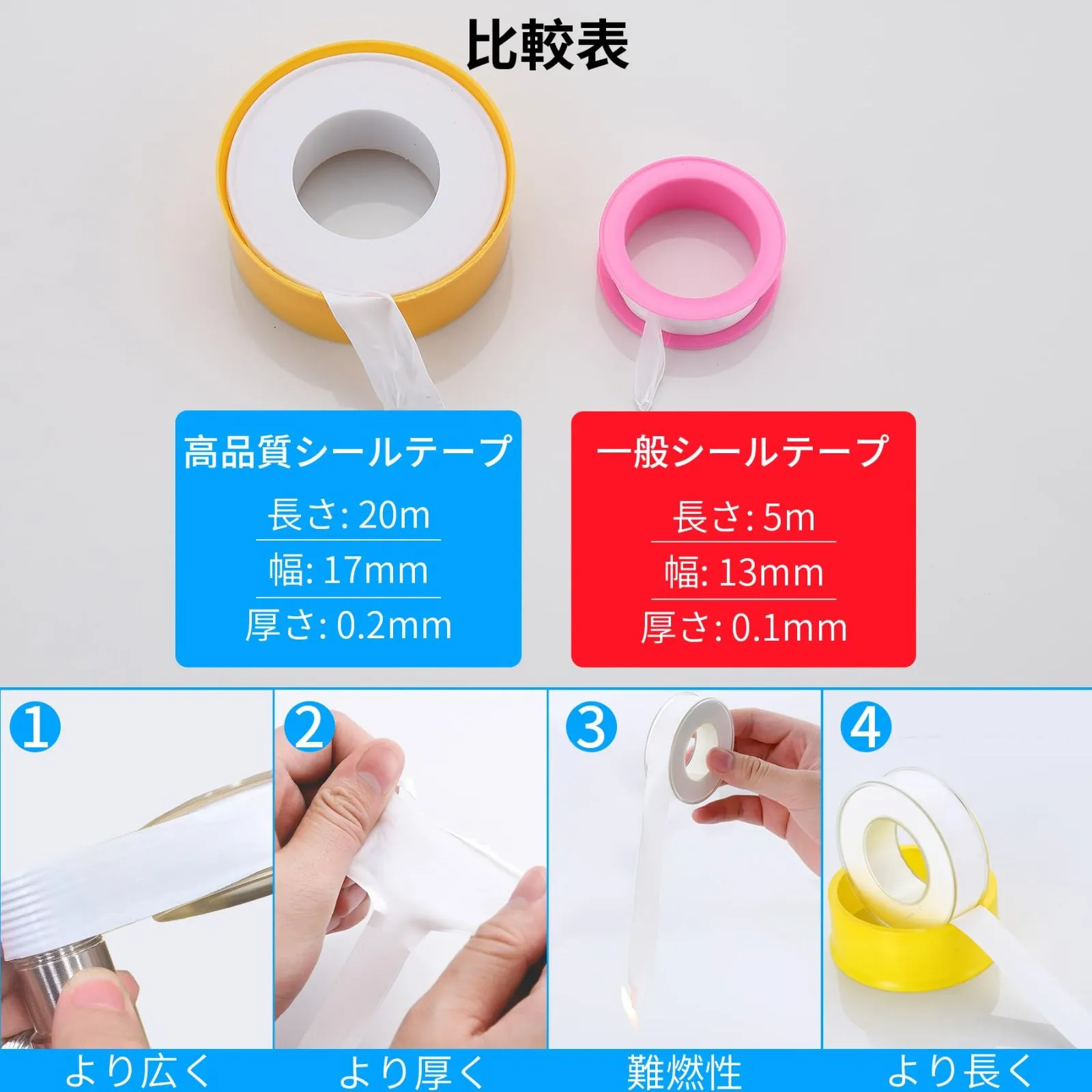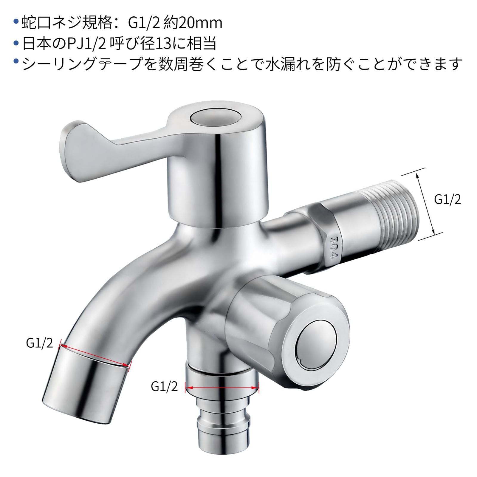 取り付け簡単:5mシールテープ付き,簡単にインストールできます,この外水栓蛇口二口は?壁付け?設置が可能。ねじ接続規格は国際基準?G1/2?、取付穴径約?20mm?,日本規格?PJ1/2?/?呼び13?に相当。既存の?パイプ?との互換接続を実現。漏水防止のコツ!取り付け前にシールテープを蛇口のねじ部分に約10回巻き付けます,全周にわたり均一な厚みを確保。