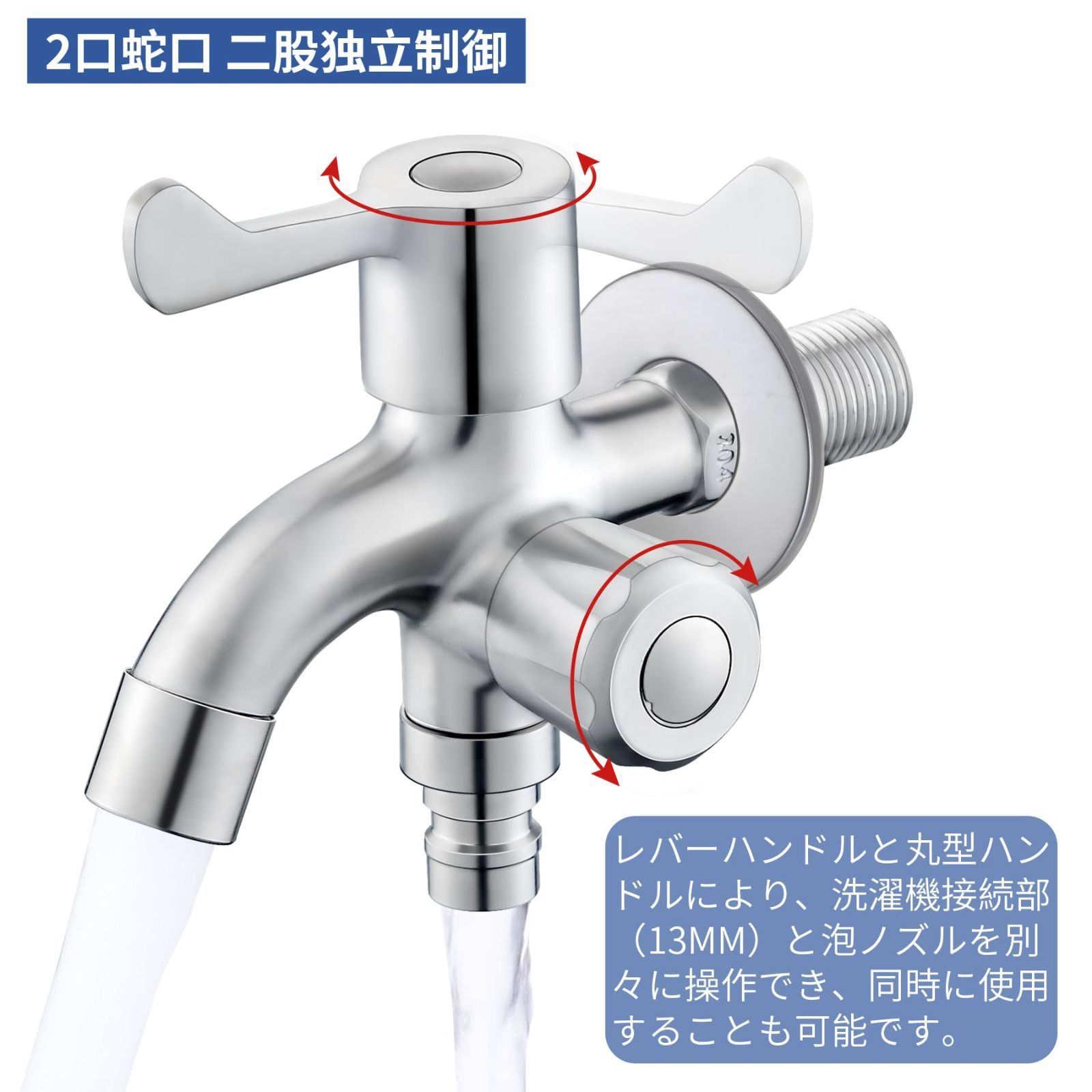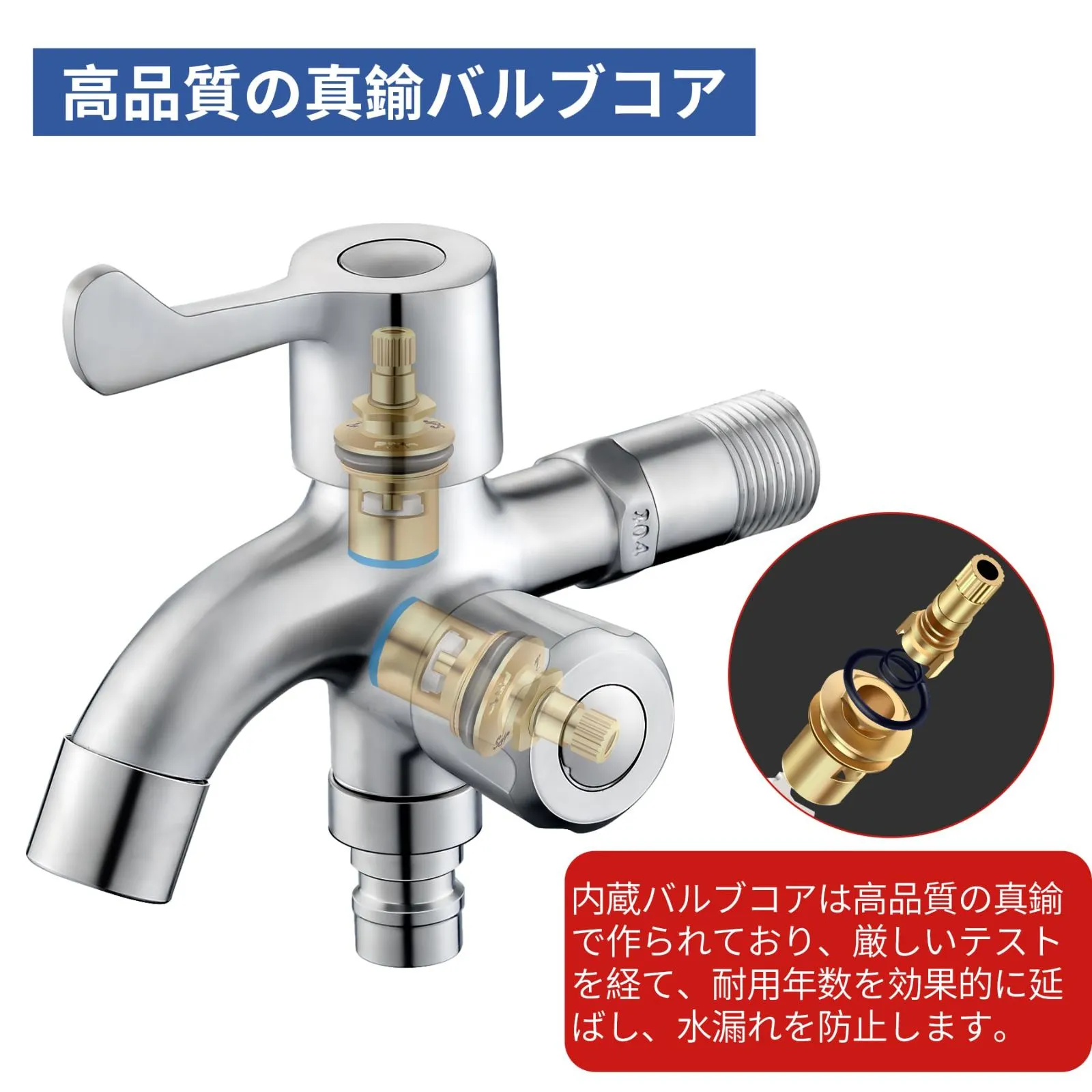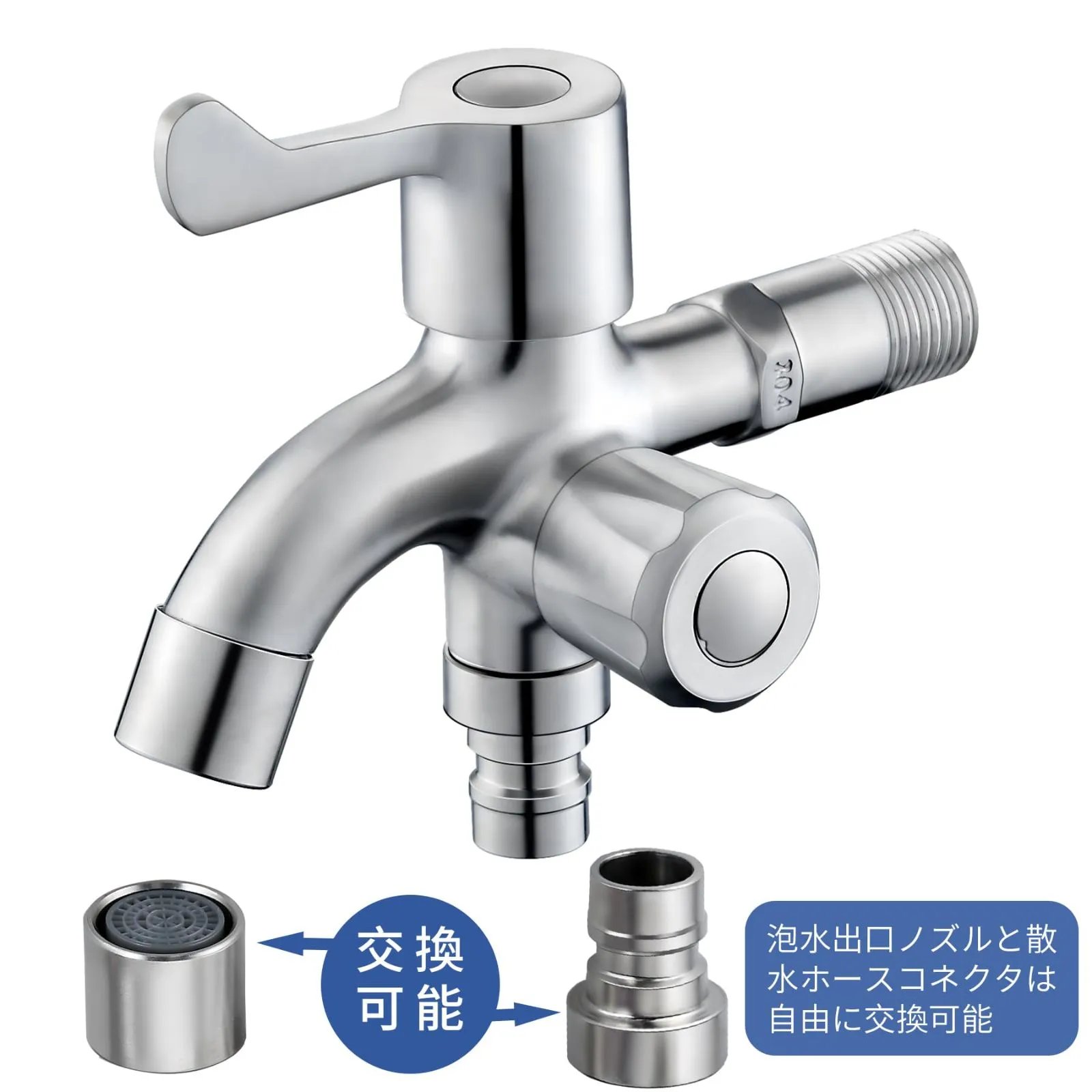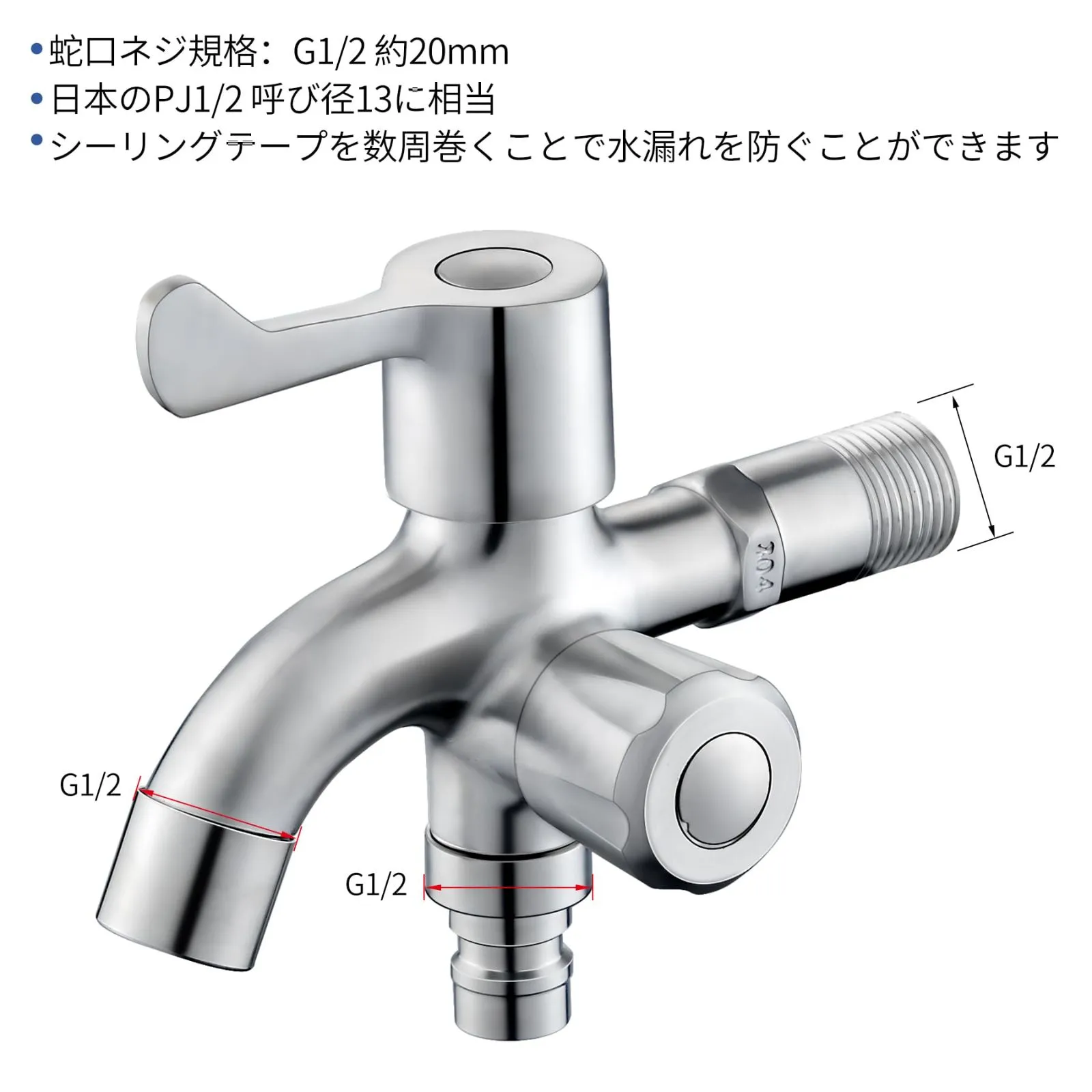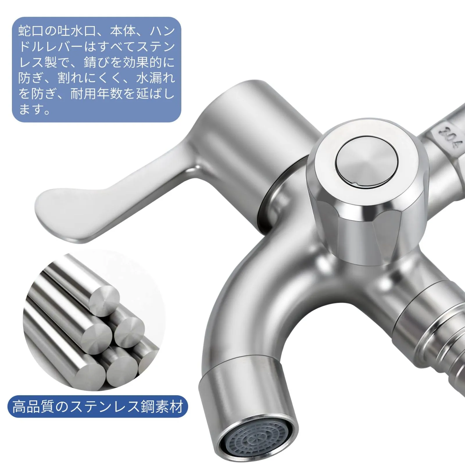 屋外立水栓柱用:この二股蛇口?本体は高品質?SUS304ステンレス鋼?を採用,屋外の設置や洗濯機に非常に適しています。高温溶解による?一体鋳造?で?継ぎ目なし?構造を実現。?パイプ壁は肉厚かつ均一?に設計され、破損しにくく、?合金蛇口?や?プラスチック蛇口?に比べ寿命が格段に長くなっています。
