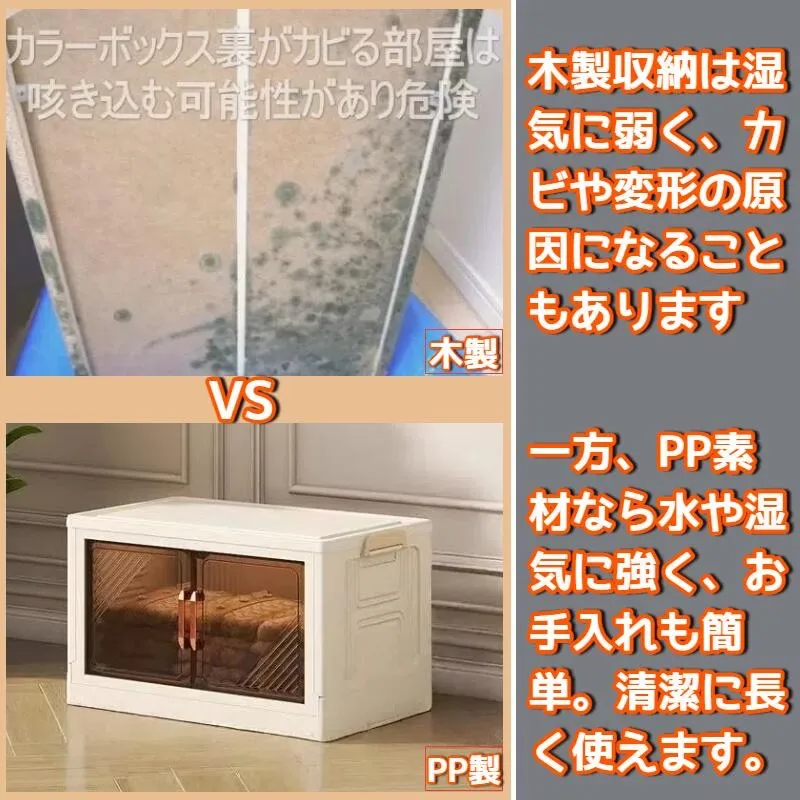 折り畳みコンテナは2つの開き方が可能です。上部の蓋を開ける方法と、前面扉から開ける方法があります。上部の蓋には大きなものでも気軽に入れたり出したりすることが便利です。前面扉にはしっかりしたマグネット設計で、易く開けます。前面扉は、引き出しや上蓋を取り外すことなく、小物を簡単に取り出せます。埃を寄せ付けません。