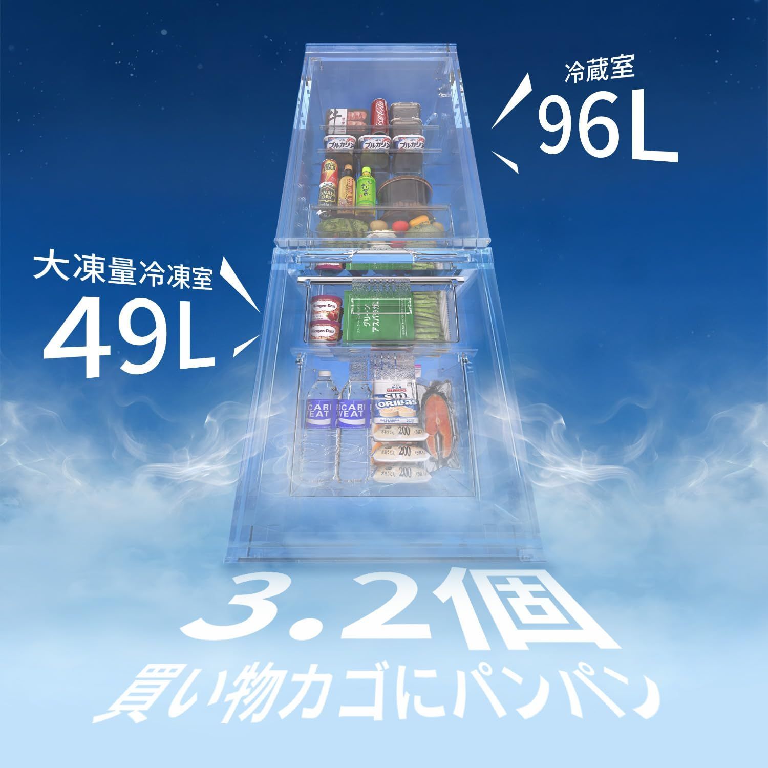 【145Lの大容量】 「一人暮らしでも、すぐに買い物に行けない…」→週一度のまとめ買いにもゆとり対応の145Lの大容量です。 冷蔵96L・冷凍49Lの絶妙なバランス設計。野菜室と冷凍室を独立させた使いやすい収納で、お一人様なら約5日分?1週間分の食材をまとめてストックできます。 ・週末に買いだめしたお肉や野菜 ・ふるさと納税の食品返礼品 ・作りおきのおかず ・常備したい冷凍食品やアイスクリーム。 食材の「買い忘れ」や「無駄な廃棄」を減らし、スマートな食生活をお手伝いします。