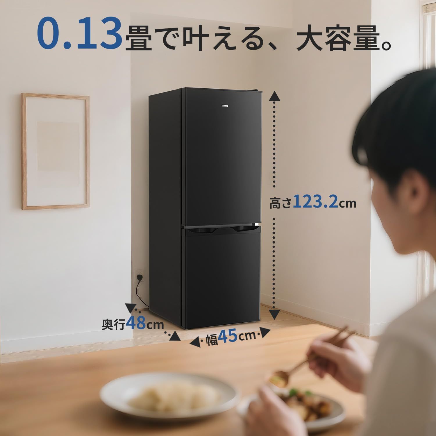 SAMKYO 冷蔵庫 145L 幅45cm 2ドア スリム 一人暮らし 右開き 大容量 家庭用 前開き 冷凍室付き ふたり暮らし 耐熱天板 静音 GU140 ブラック