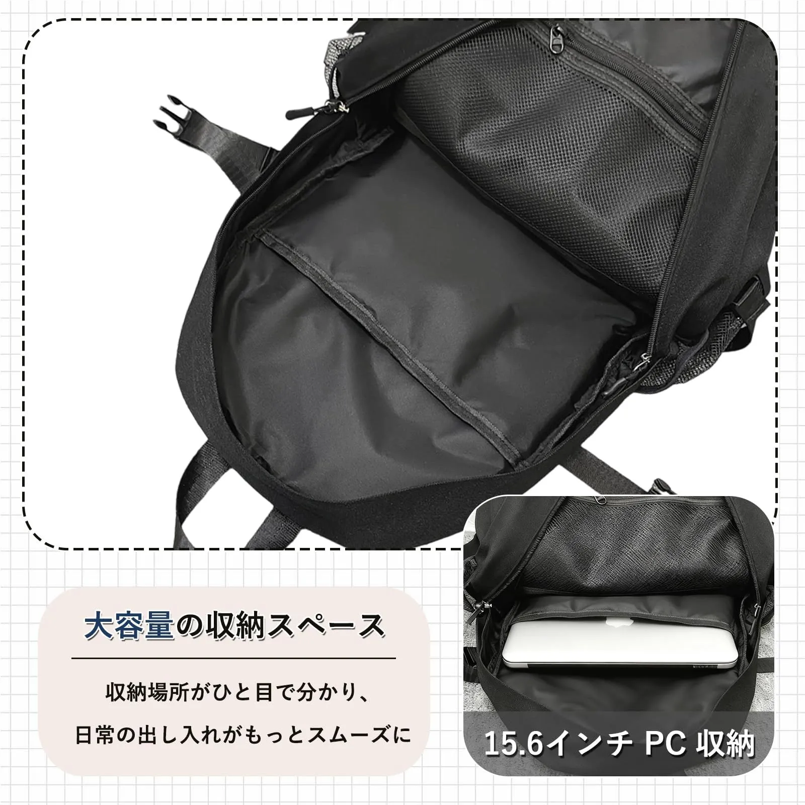 【思った以上の収納力】サイズ:38x15x49cm/0.75kg。メインポケットには耐衝撃仕様でクッションのPC専用ポケットがあり、15.6インチノートパソコン、A4サイズの書類、水筒、折りたたみ傘、充電器、手帳、1~2日分の生活用品などたっぷりと入る可能です。副ポケットにはペン、ノート、財布、携帯などの小物をきちんと分類して収納する組み合わせポケットもあります。フロントに小さなポケットがいくつもついているので、小物の収納はまったく心配ありません。(画像はイメージ図です。本体には動物ペンダントが含まれていません)。