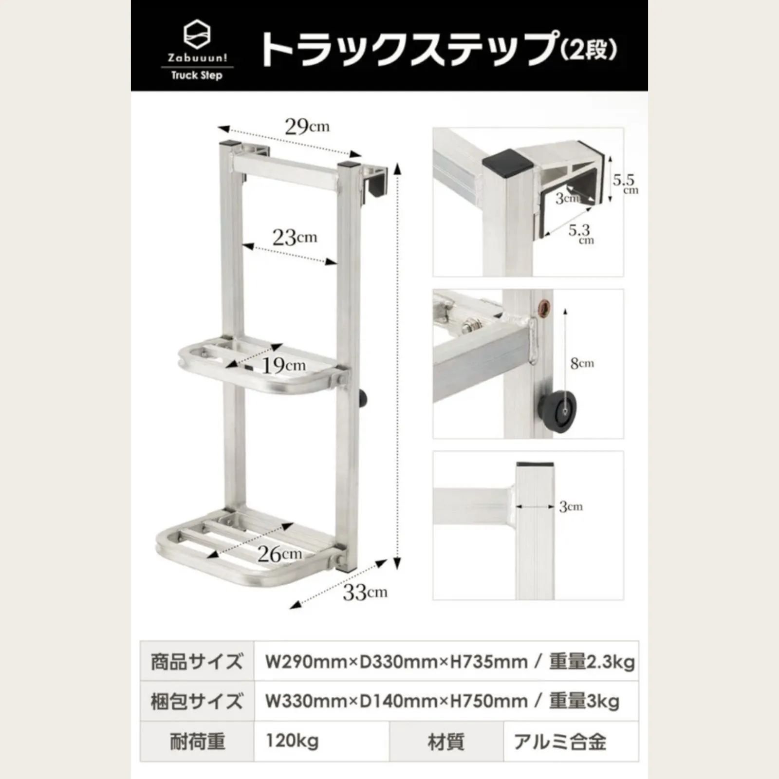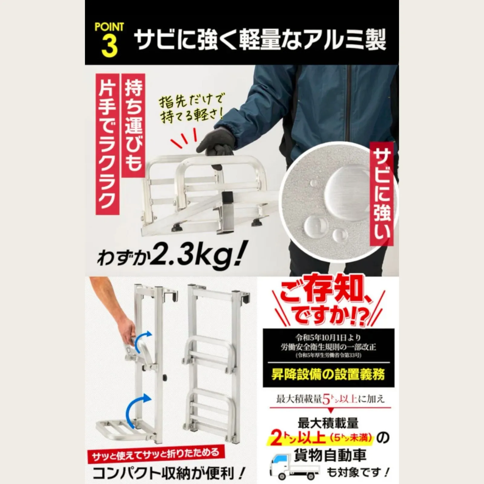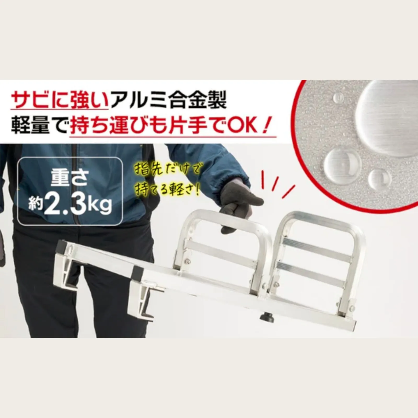 【アルミ合金製】サビに強いアルミ合金を採用しています。トラックステップは耐荷重120kgで、アルミ合金は強度が高く、弾力性にも優れているため安心して使用できます。軽量設計(約2.3kg)なので持ち運びや取扱が非常に楽です。錆びにくいので平ボディでの荷台保管など、屋外使用にも最適です。