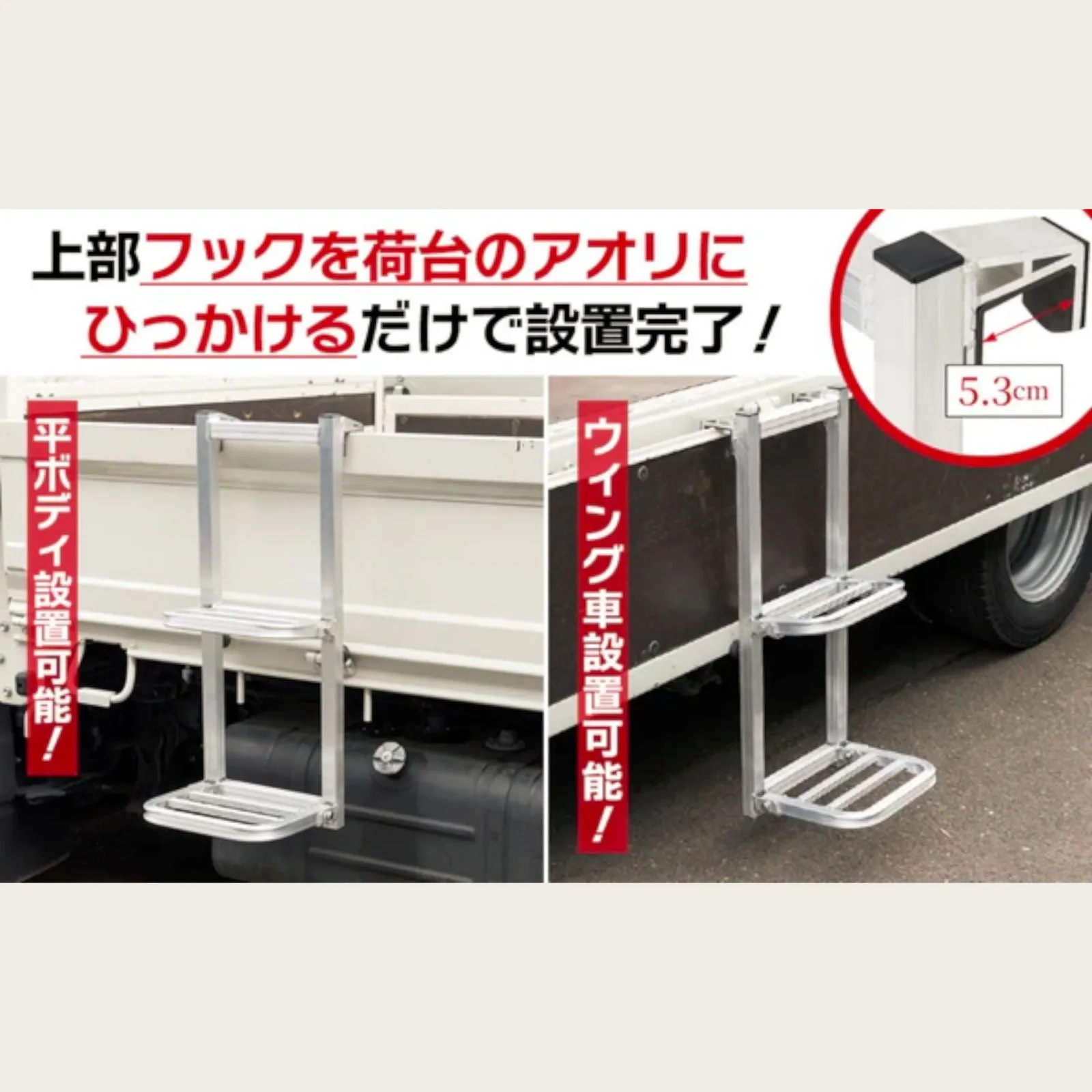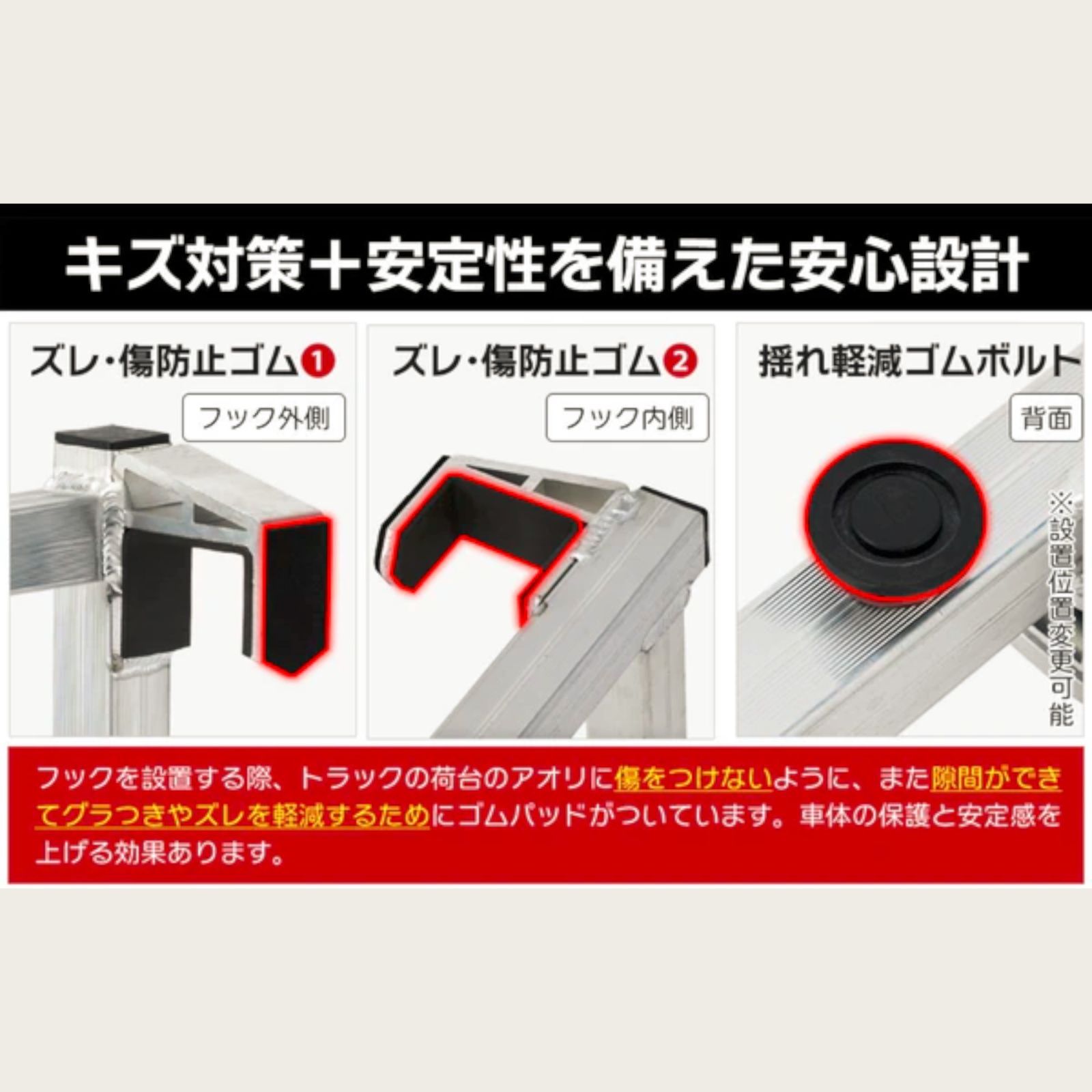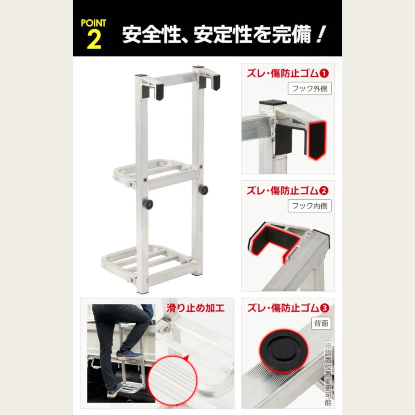 【滑り止め、ズレ・傷防止】ステップの表面に加工されている溝が滑りを軽減します。本体裏面には滑り止めゴムボルトが取り付けてあり、2段階で調整可能です。また、フックの内側にスポンジマットが付いていますので使用中のズレやあおりへの傷を防ぎます。また。フック外側にもスポンジマットが付いておりますので、ウイング車等あおりを下した状態での設置でも車体への傷を防ぎます。