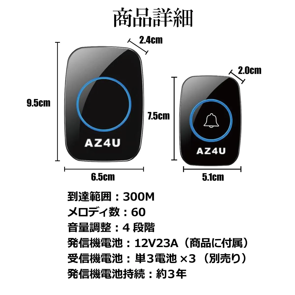 商品名:AZ4Uワイヤレスチャイム | お勧め利用法:無線転送距離:最大300M | メロディ:全60メロディ | 音量:音量調節可能 4段階音量調整 | カラー:ブラック/ホワイト | 給電方式:発信機-12V23A電池(付属)(試供品となります。早めにご交換ください。新品の電池の場合は3年ほど持続する仕様ですが、環境によって1年程度になる事もございます。)受信機-単3電池×3(別売り) | 防水:IPX4級防水 | 発信機の取付:両面テープ/ネジ固定 | 音声通話機能無し|