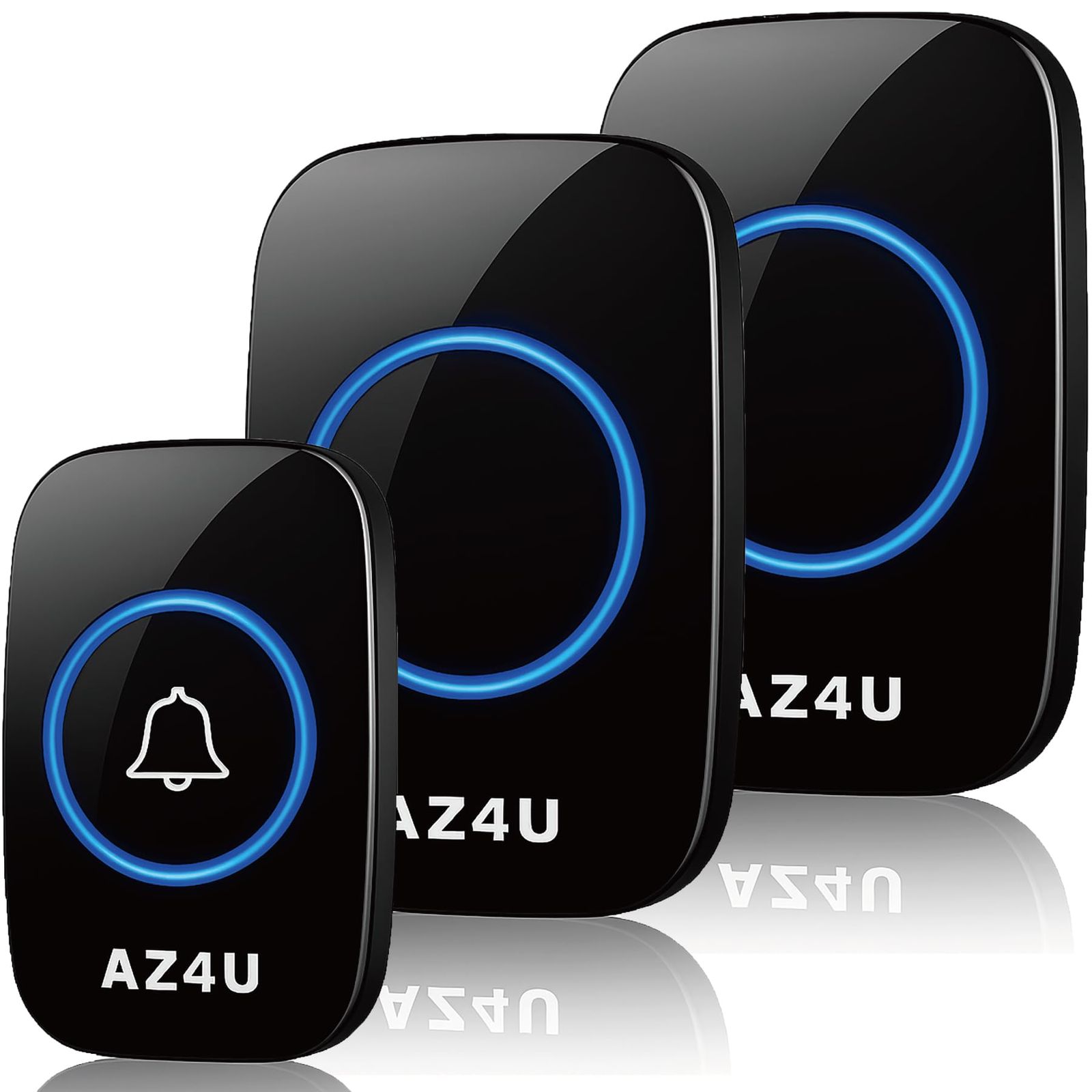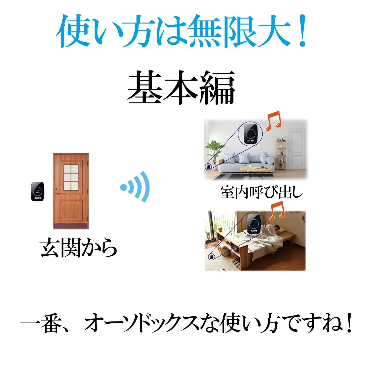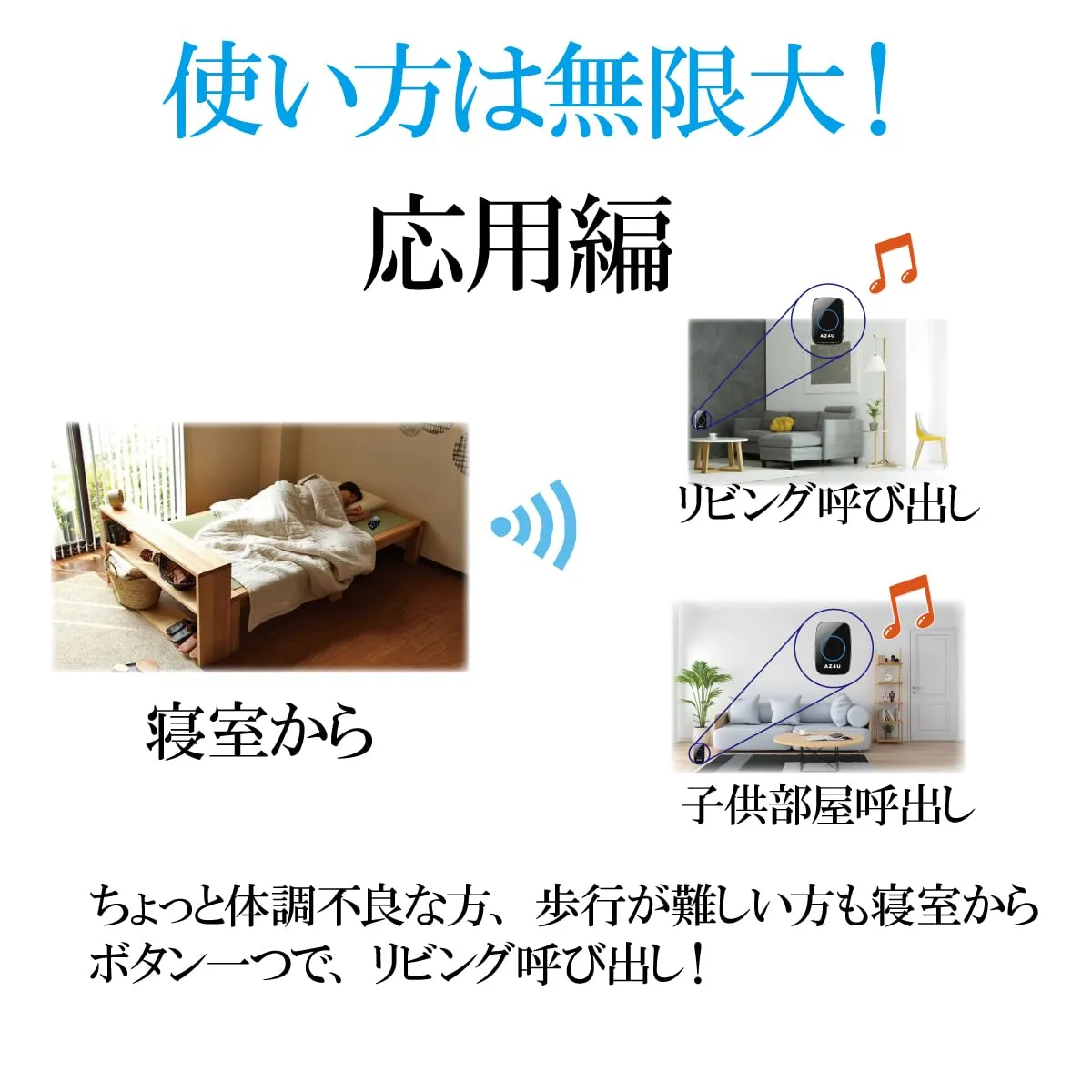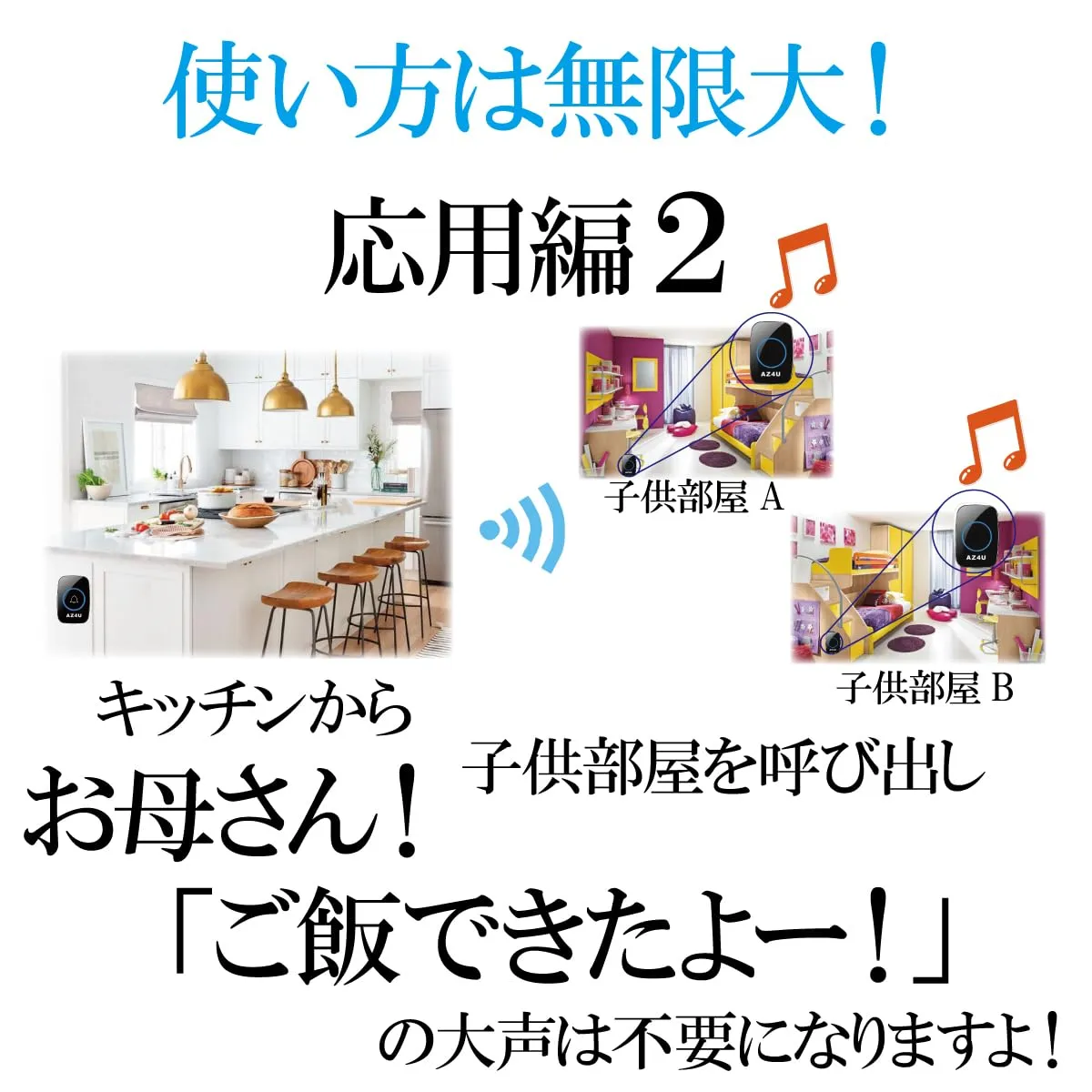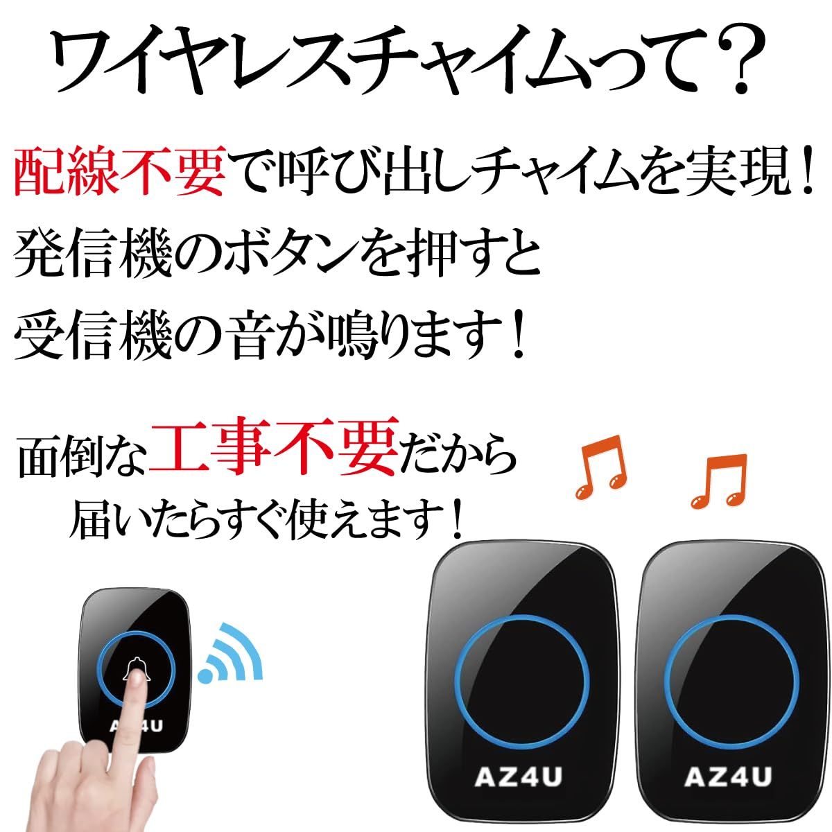 AZ4U ワイヤレスチャイム インターホン 電池式 ドアベルキット 技適マーク取得済み 工事不要 防水 玄関 介護 呼び出し (ブラック 受信機2個)