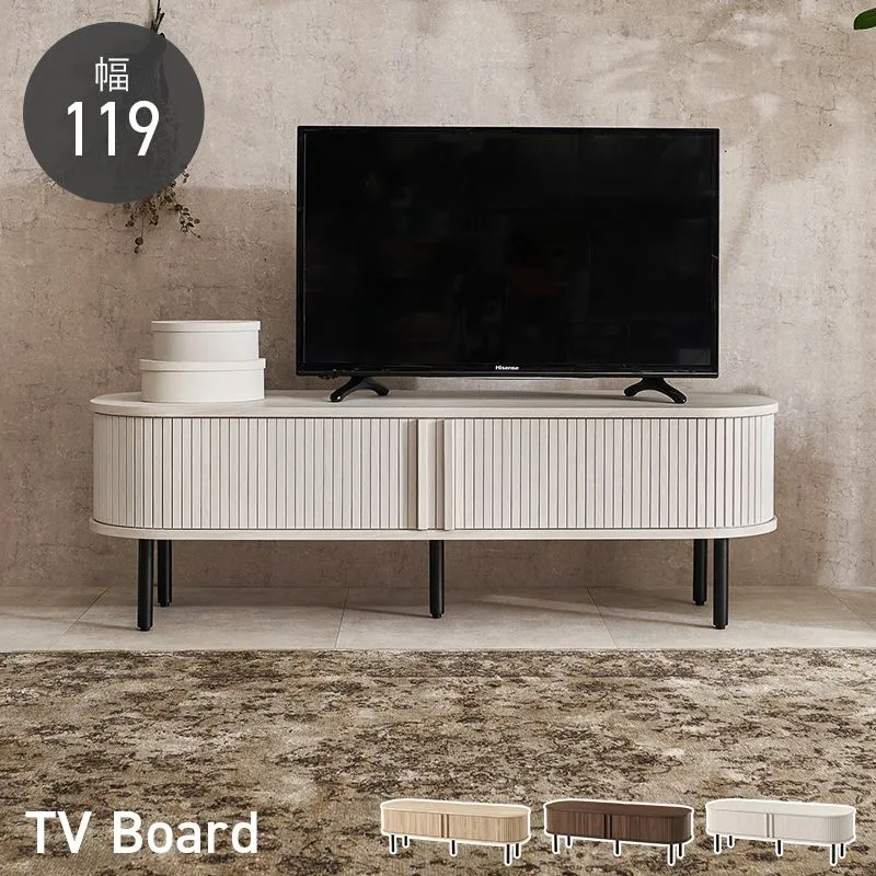 縦のラインとサイドの曲線が美しいタンブール扉のテレビ台。扉の開閉に場所を取らず、すっきりとした脚高デザインもポイントです。ローボードとしても使用可能