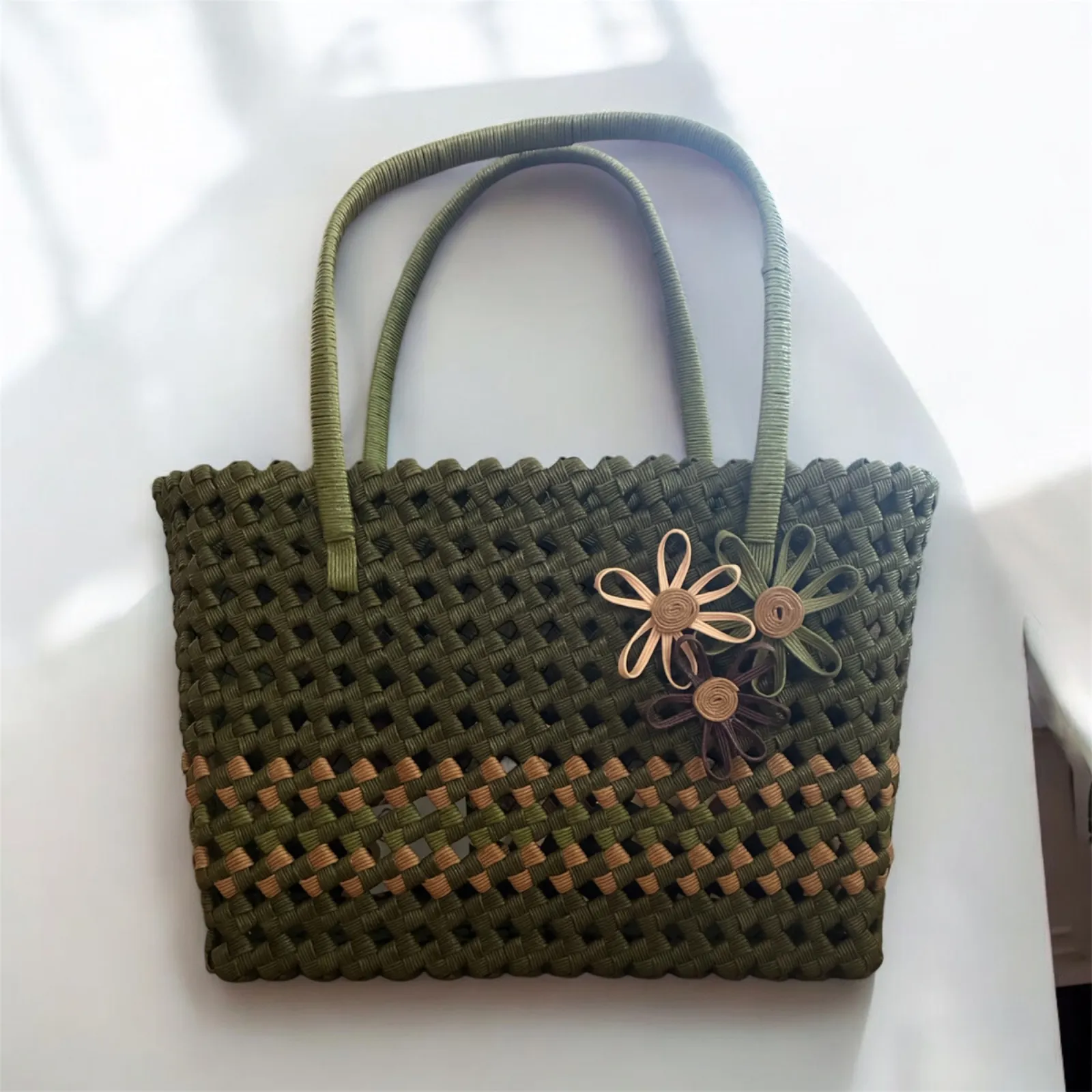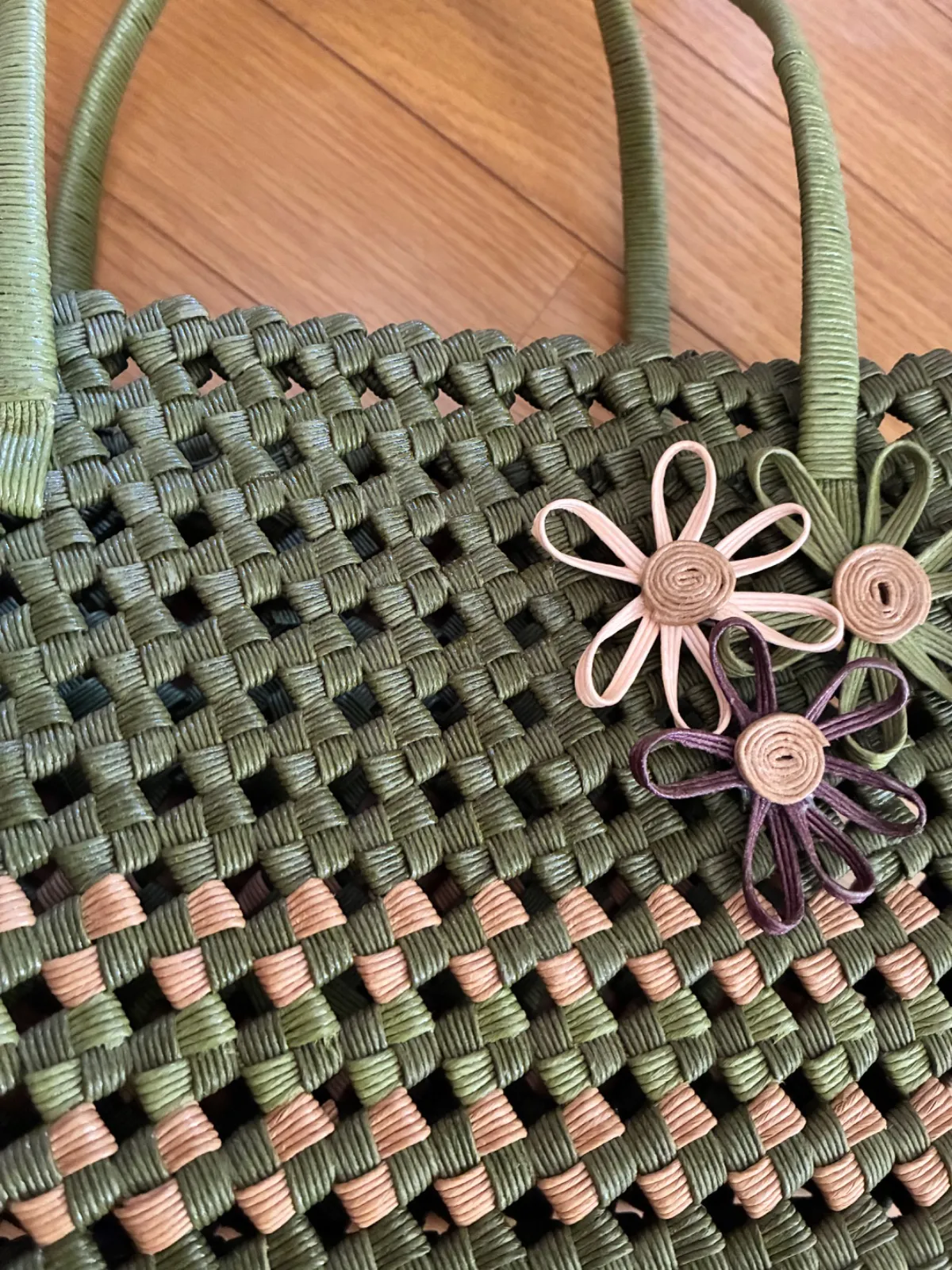 深みのあるカーキカラーに、 さりげない編み模様のアクセント。 エコクラフトで仕立てた 落ち着きのあるかごバッグです。 甘くなりすぎない配色に、 小さなフラワーモチーフを添えて 大人の遊び心をプラスしました。 軽くて持ちやすく、 しっかりとした編みで安心感も◎ 普段使いからちょっとしたお出かけまで 幅広く活躍してくれます。 ナチュラルだけど個性は欲しい、 そんな方に手に取っていただきたい一点です。