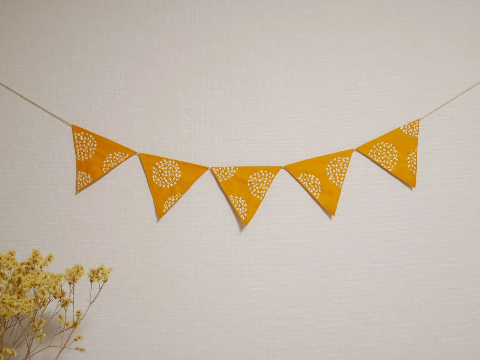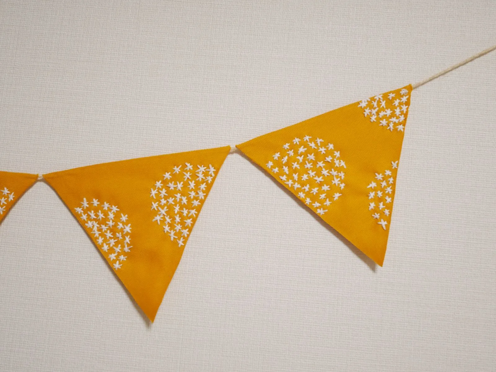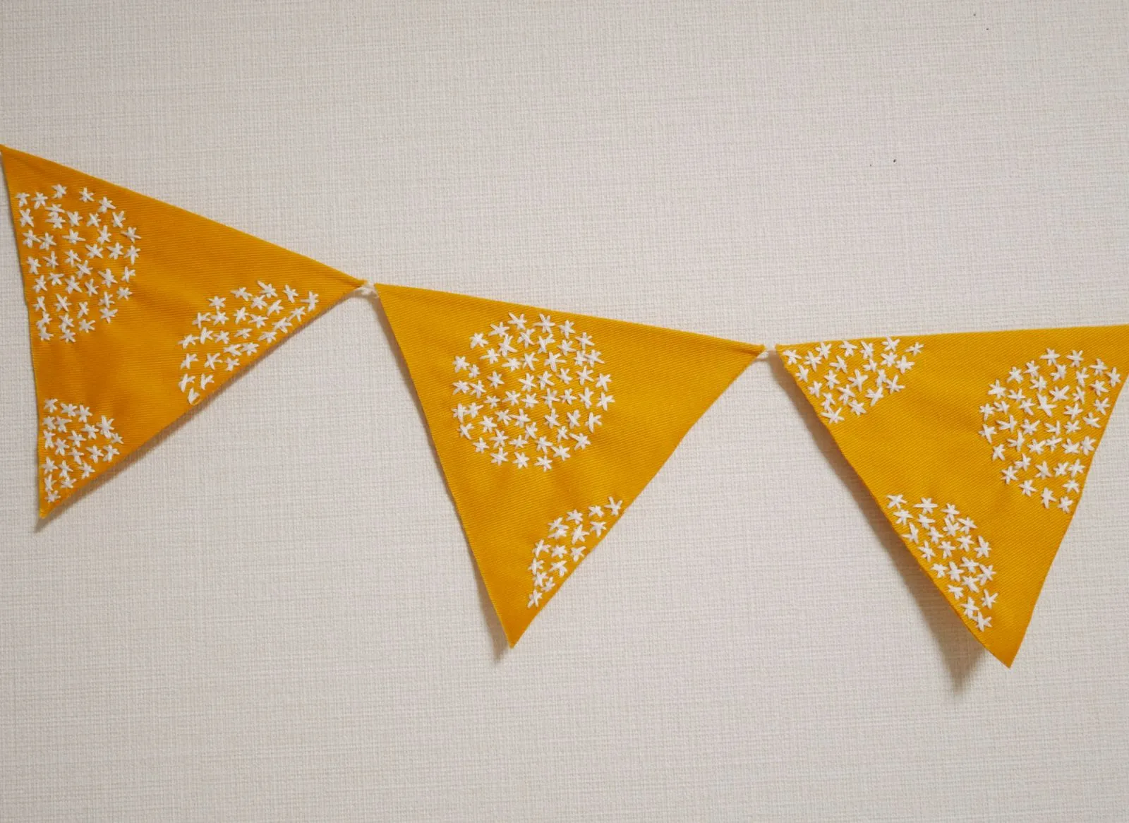 お子様の記念日の記念撮影やお部屋のインテリア等にお使い頂けるガーランドです* 北欧風のサークルフラワーを刺繍しています。 刺繍は片面のみです。 *ガーランドのサイズ ガーランド1枚の大きさ→たて11㎝×よこ12㎝ 約110㎝の麻紐に5枚並んでいます。 キッズ ベビー 記念日 飾り マンスリーフォト ハーフバースデー バースデー パーティー ハンドメイド 刺繍 サークルフラワー 北欧風 ガーランド インテリア