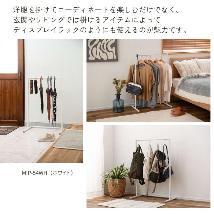 ●高さは90cmと162cmの2タイプ。  洋服を掛けてコーディネートを楽しむだけでなく、  玄関やリビングでは掛けるアイテムによって  ディスプレイラックのようにも使えるのが魅力です。