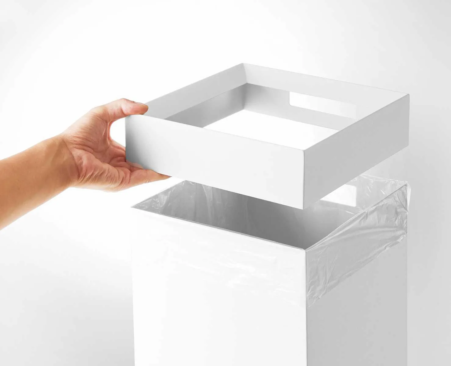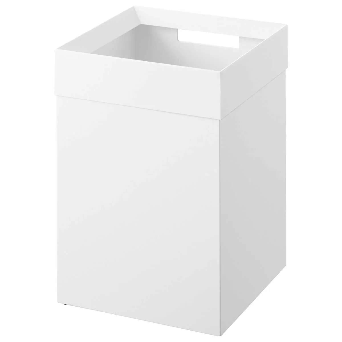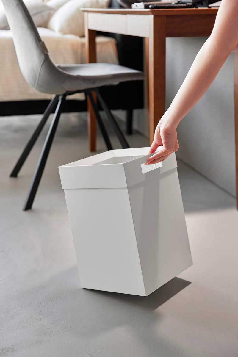 フチカバーと持ち手付きのスクエア型のゴミ箱。中にセットしたポリ袋の折り返し部分をフチカバーが覆い隠す仕様なので、とてもスタイリッシュな外観です。持ち手が付いているので移動がスムーズにできます。袋の交換時はフチカバーを外して取り替えるだけと簡単です。トラッシュカンの容量は14Lで、20Lのポリ袋をセットして使用できます。