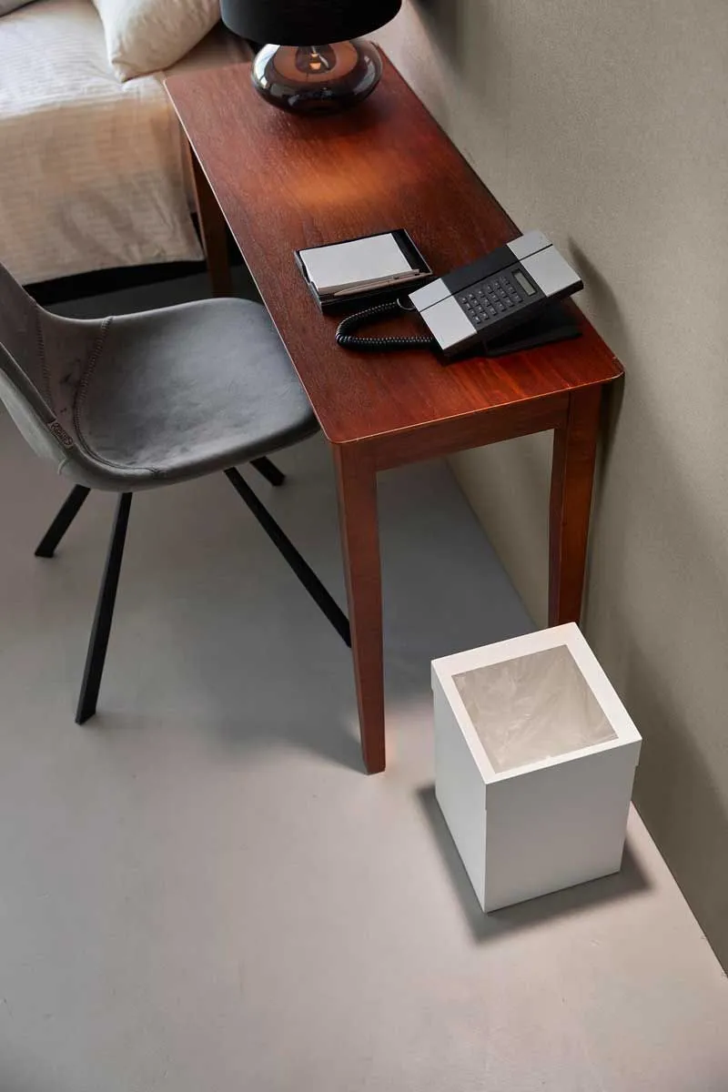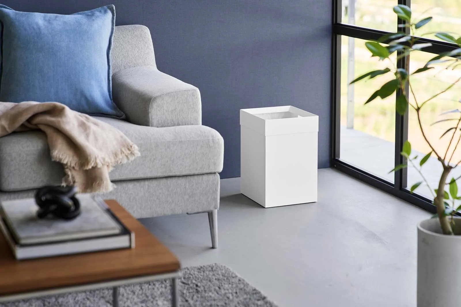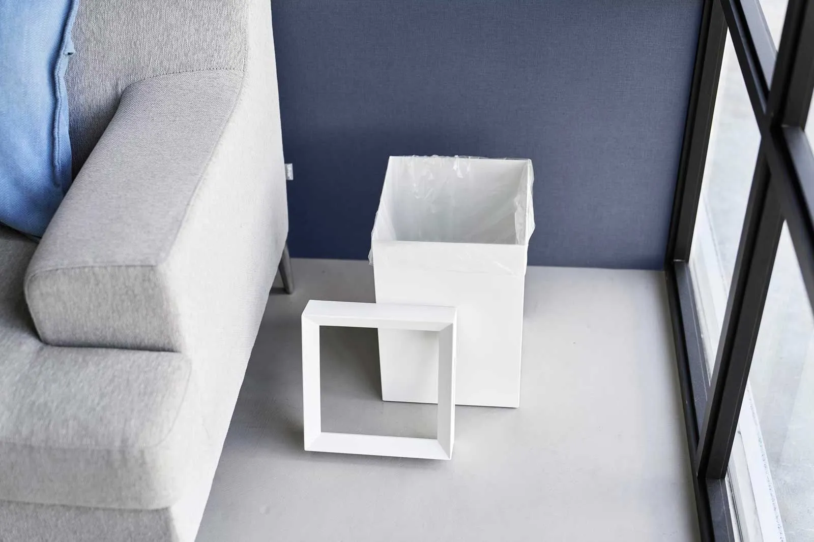 フチカバーと持ち手付きのスクエア型のゴミ箱。中にセットしたポリ袋の折り返し部分をフチカバーが覆い隠す仕様なので、とてもスタイリッシュな外観です。持ち手が付いているので移動がスムーズにできます。袋の交換時はフチカバーを外して取り替えるだけと簡単です。トラッシュカンの容量は14Lで、20Lのポリ袋をセットして使用できます。
