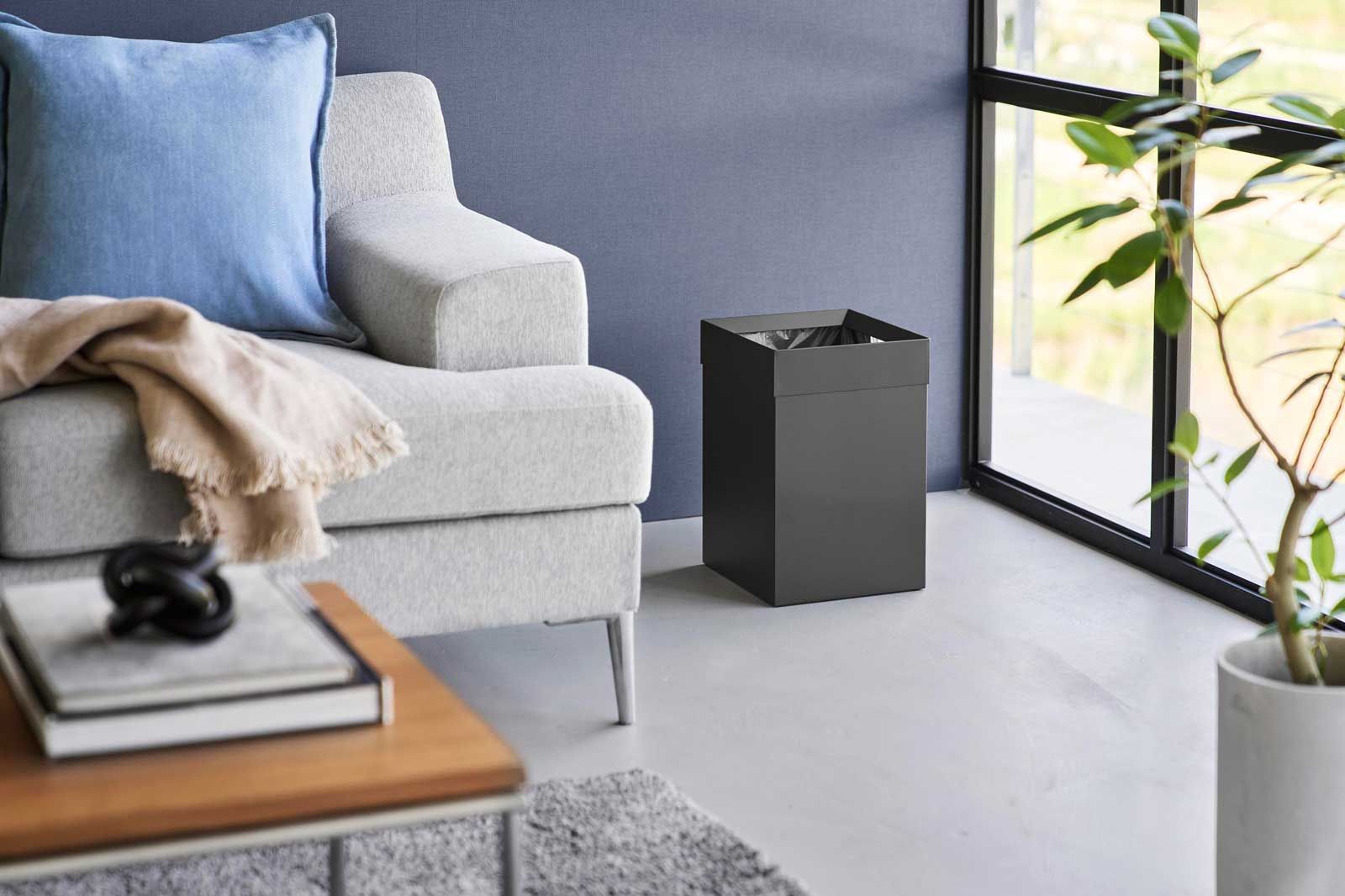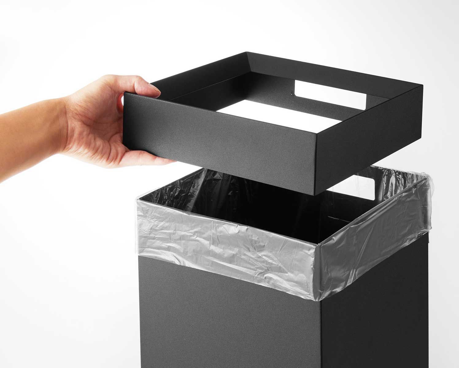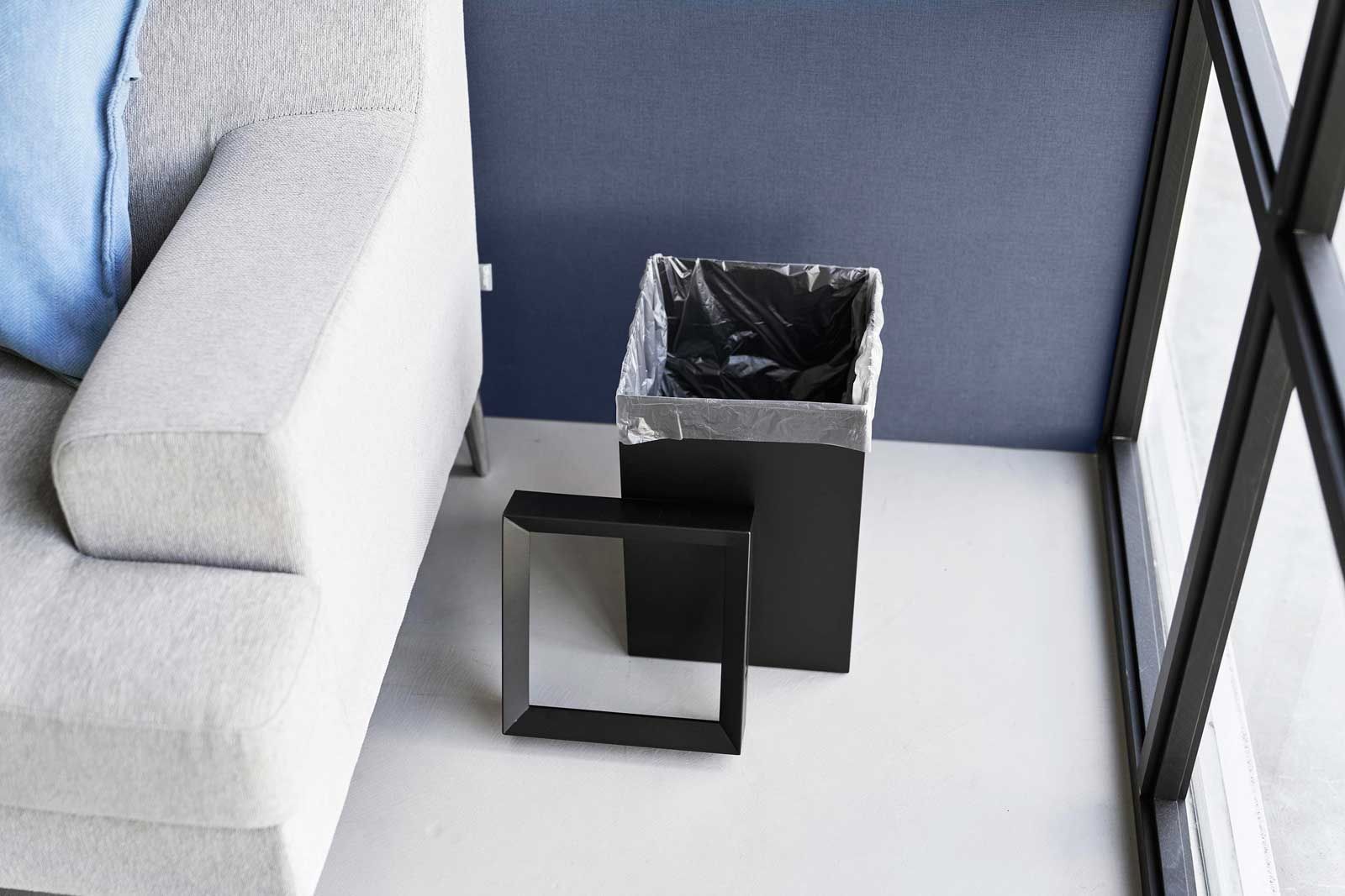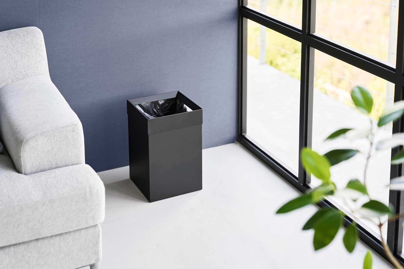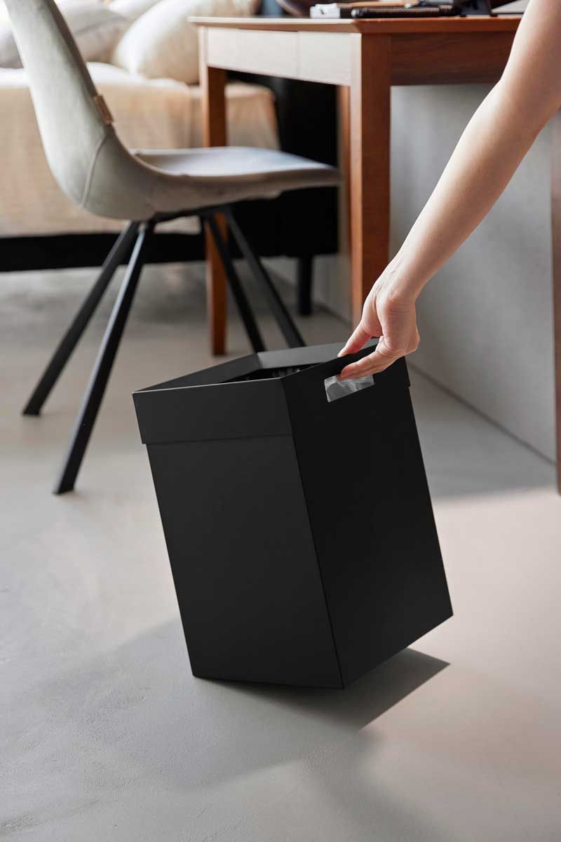 フチカバーと持ち手付きのスクエア型のゴミ箱。中にセットしたポリ袋の折り返し部分をフチカバーが覆い隠す仕様なので、とてもスタイリッシュな外観です。持ち手が付いているので移動がスムーズにできます。袋の交換時はフチカバーを外して取り替えるだけと簡単です。トラッシュカンの容量は14Lで、20Lのポリ袋をセットして使用できます。
