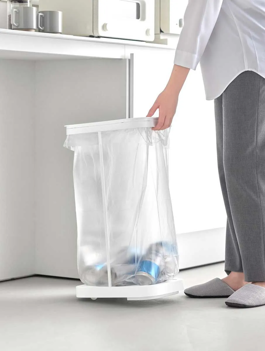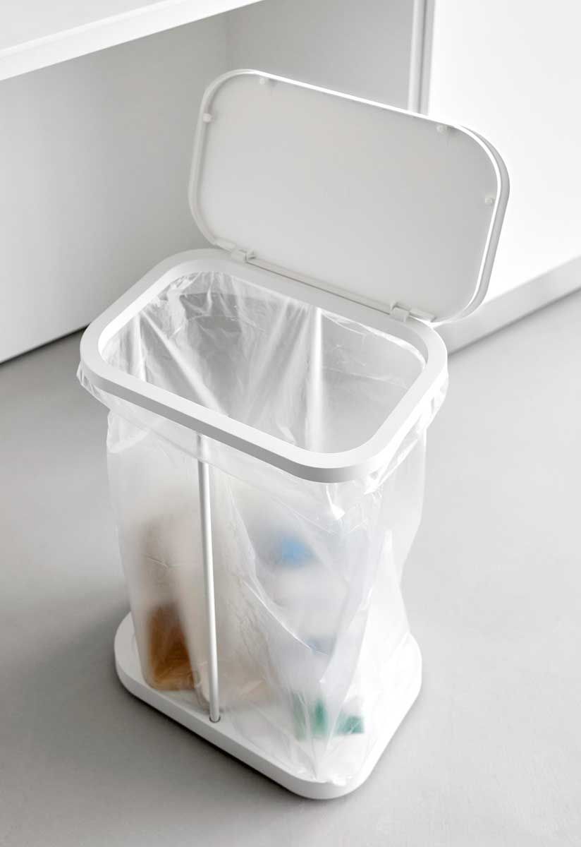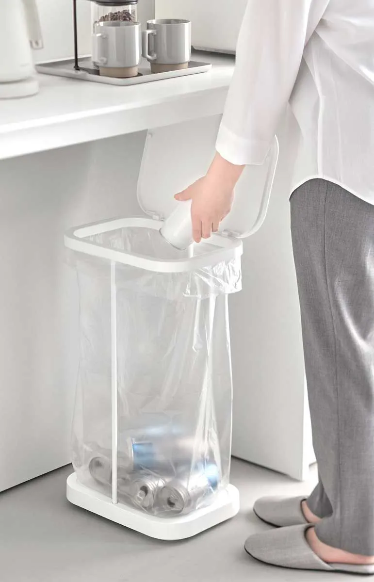 スチールフレームと蓋、台座で構成された、シンプルなゴミ袋ホルダーです。中身が見えにくく臭いも軽減できる蓋付き。外枠の制限がないので、ゴミ袋の容量いっぱいにゴミを入れられます。複数並べて使えば、ペットボトル・空き缶・資源ゴミなどの分別にも最適です。