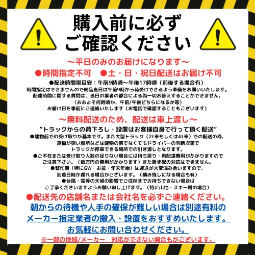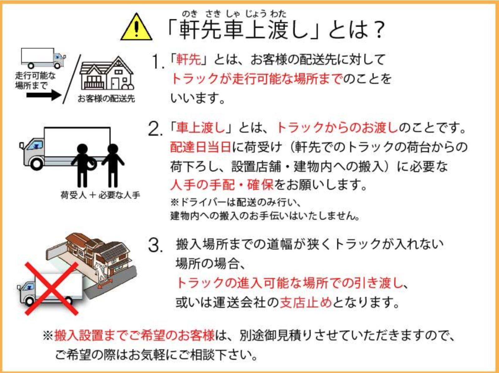 ★配送は車上渡し(トラックからの荷下ろし・設置はお客様自身で行って頂く)です。人手の確保をお願いします。