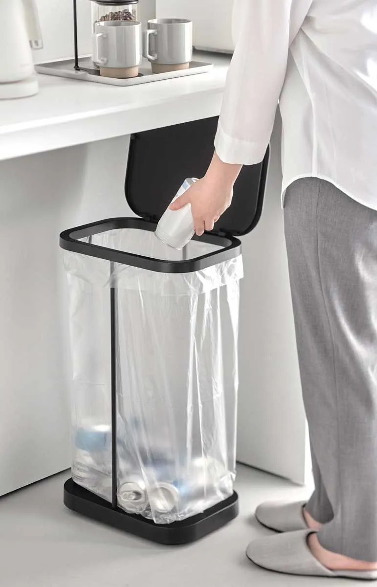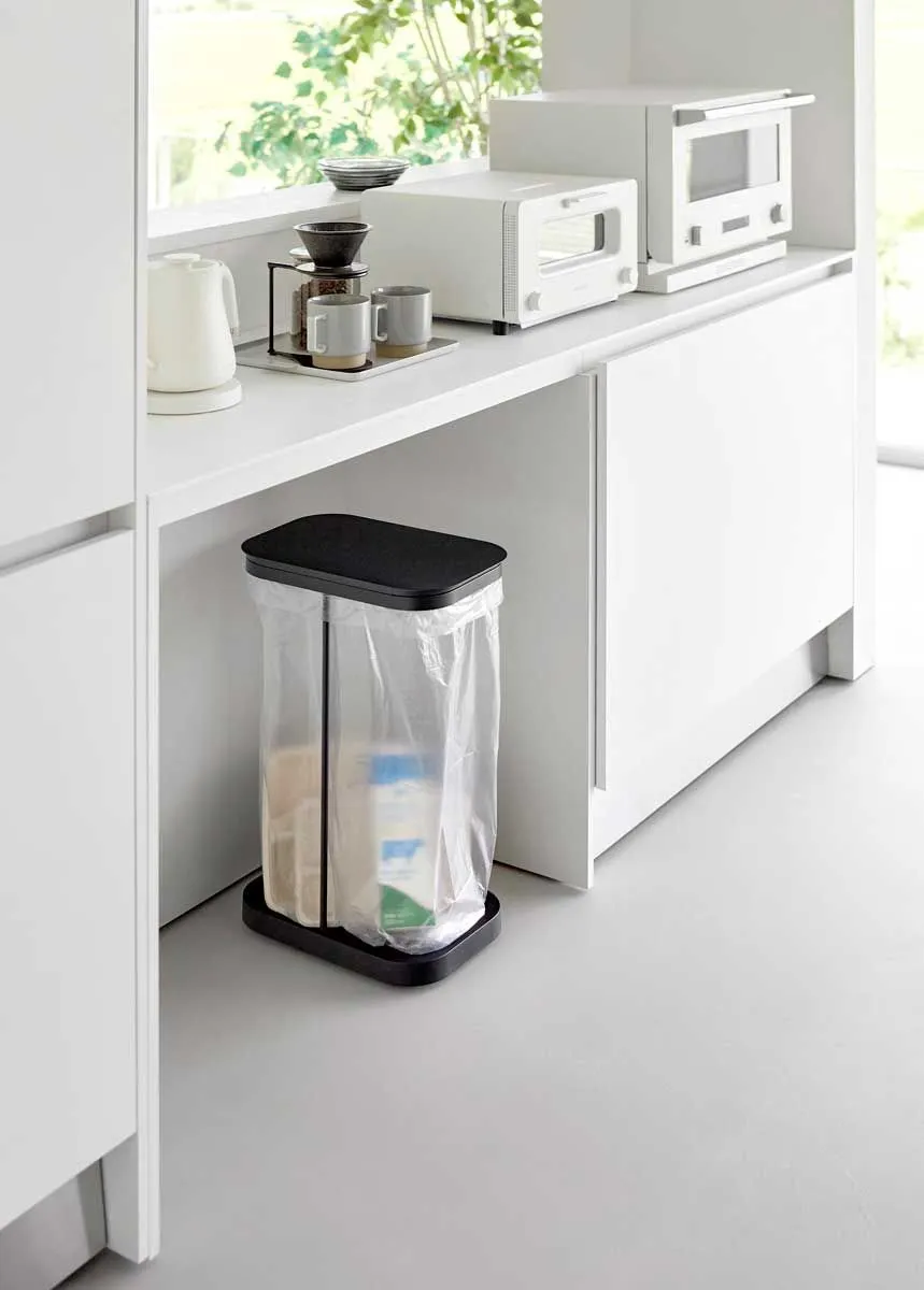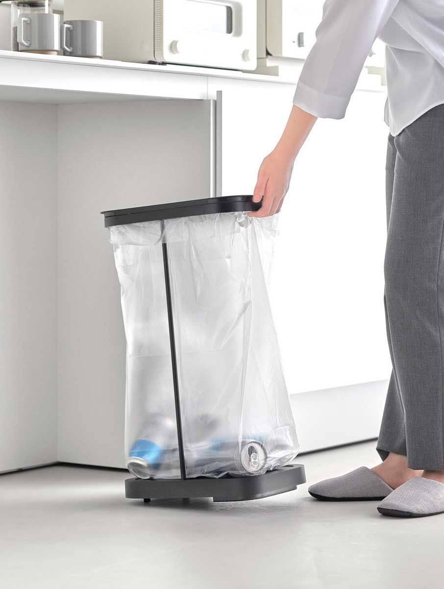 当ショップは国内正規品(新品)のみ取り扱いのため、安心してお買い求め頂けます。 スチールフレームと蓋、台座で構成された、シンプルなゴミ袋ホルダーです。中身が見えにくく臭いも軽減できる蓋付き。外枠の制限がないので、ゴミ袋の容量いっぱいにゴミを入れられます。複数並べて使えば、ペットボトル・空き缶・資源ゴミなどの分別にも最適です。 蓋は横開き仕様で、棚下に収納したままでも開閉しやすく、左右どちら開きにも対応しています。台座はキャスター付きで移動もラクラク。ゴミ袋の交換は、蓋を外して手前から引き抜くだけなので、重くなった袋を持ち上げる必要はありません。