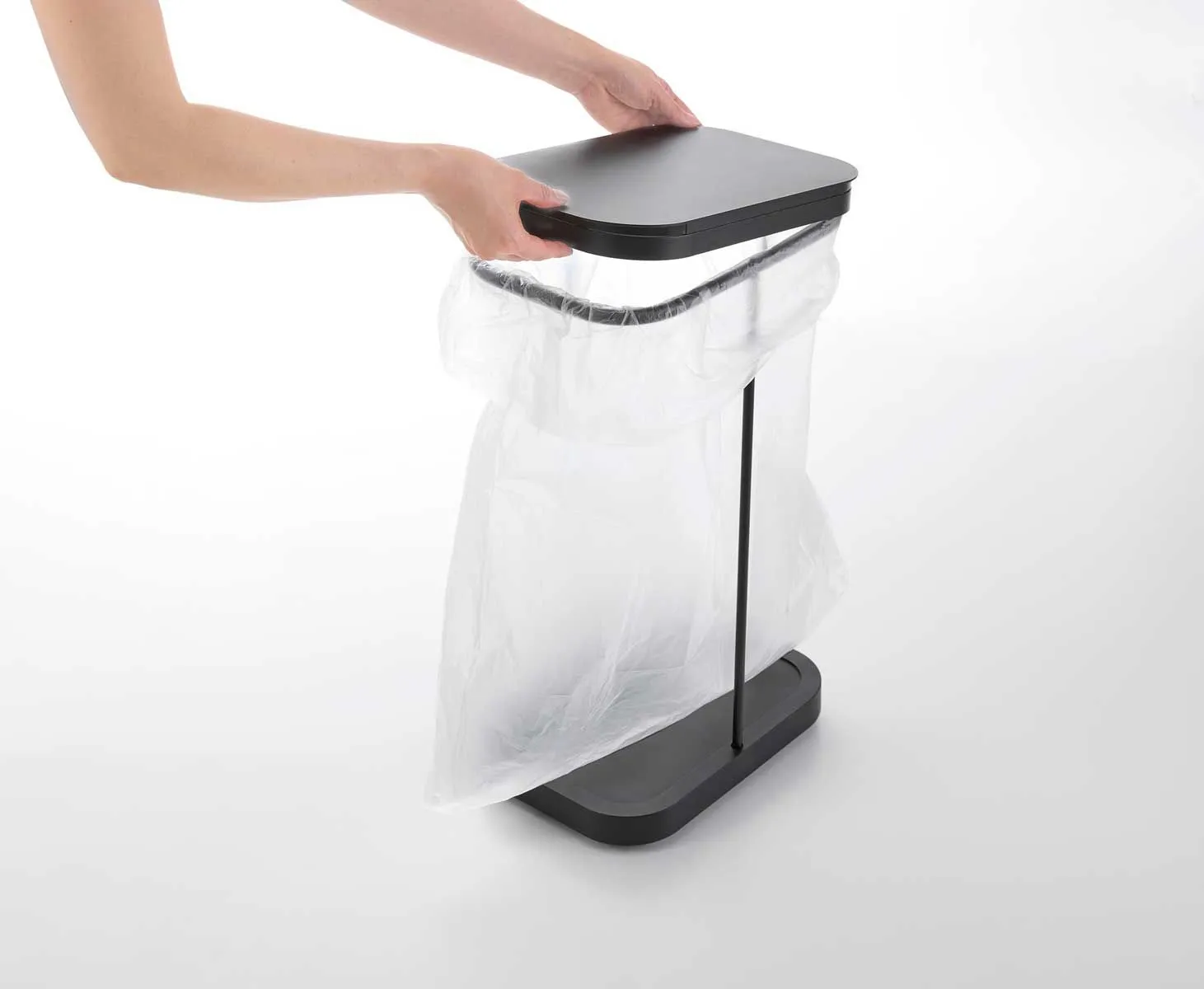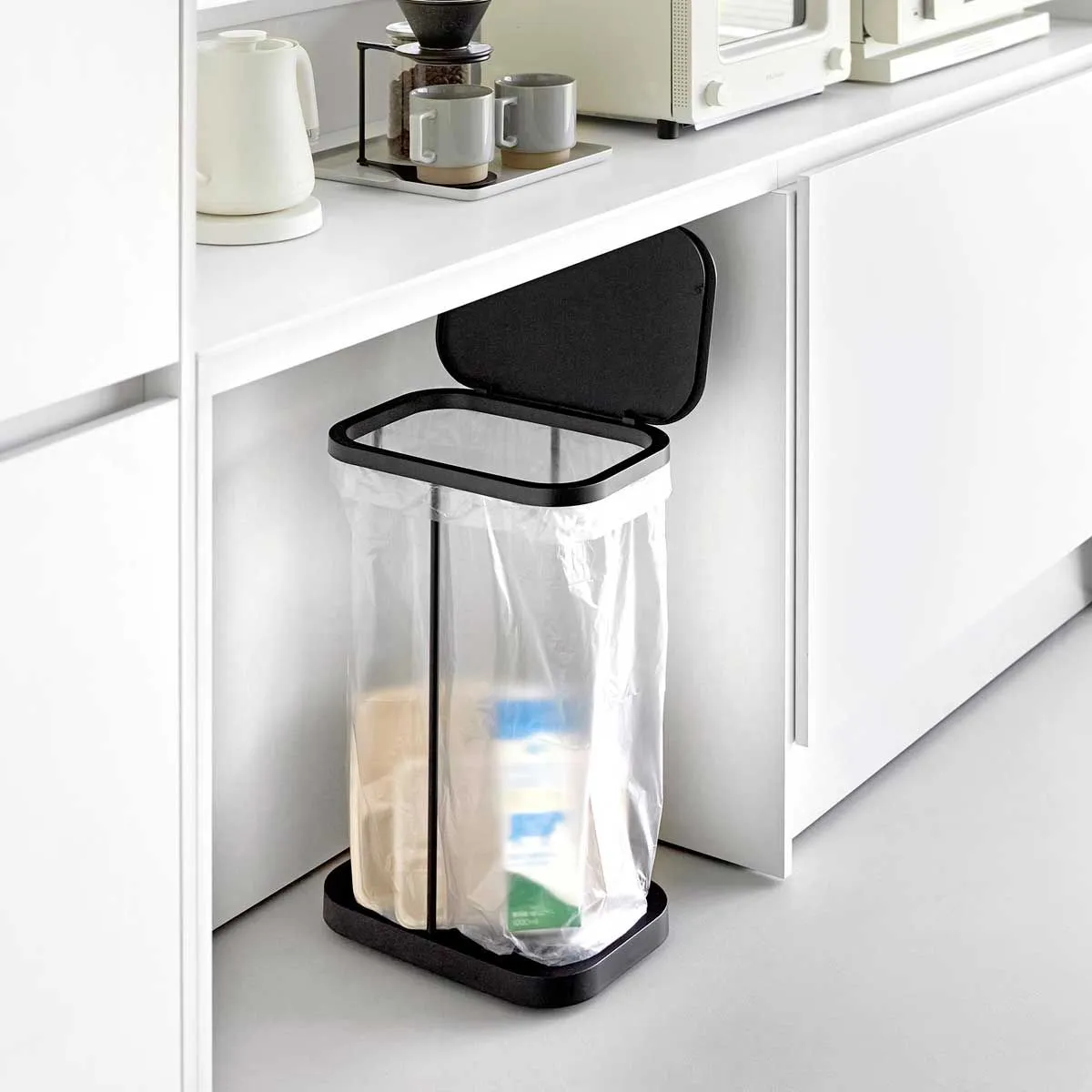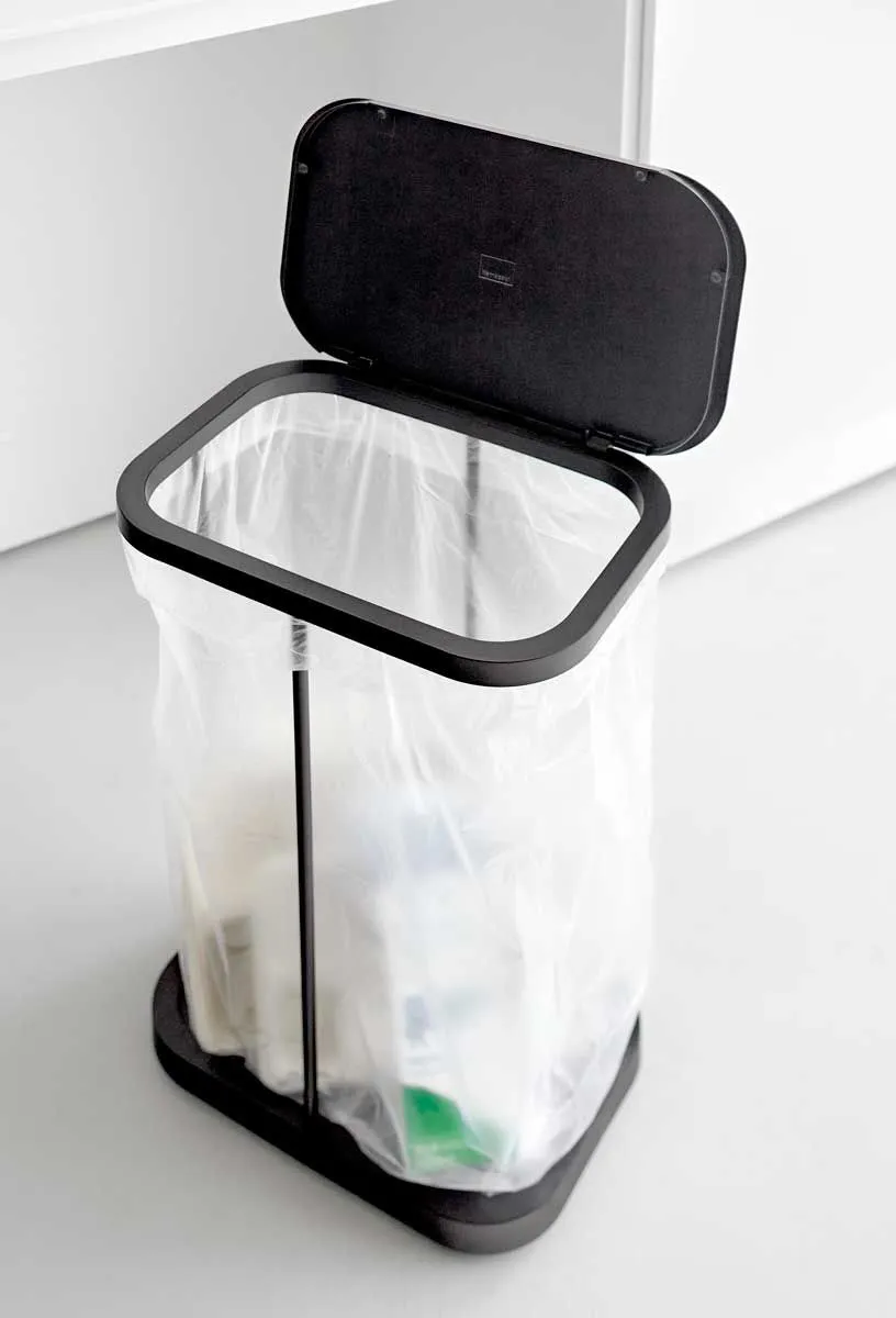 当ショップは国内正規品(新品)のみ取り扱いのため、安心してお買い求め頂けます。 スチールフレームと蓋、台座で構成された、シンプルなゴミ袋ホルダーです。中身が見えにくく臭いも軽減できる蓋付き。外枠の制限がないので、ゴミ袋の容量いっぱいにゴミを入れられます。複数並べて使えば、ペットボトル・空き缶・資源ゴミなどの分別にも最適です。 蓋は横開き仕様で、棚下に収納したままでも開閉しやすく、左右どちら開きにも対応しています。台座はキャスター付きで移動もラクラク。ゴミ袋の交換は、蓋を外して手前から引き抜くだけなので、重くなった袋を持ち上げる必要はありません。