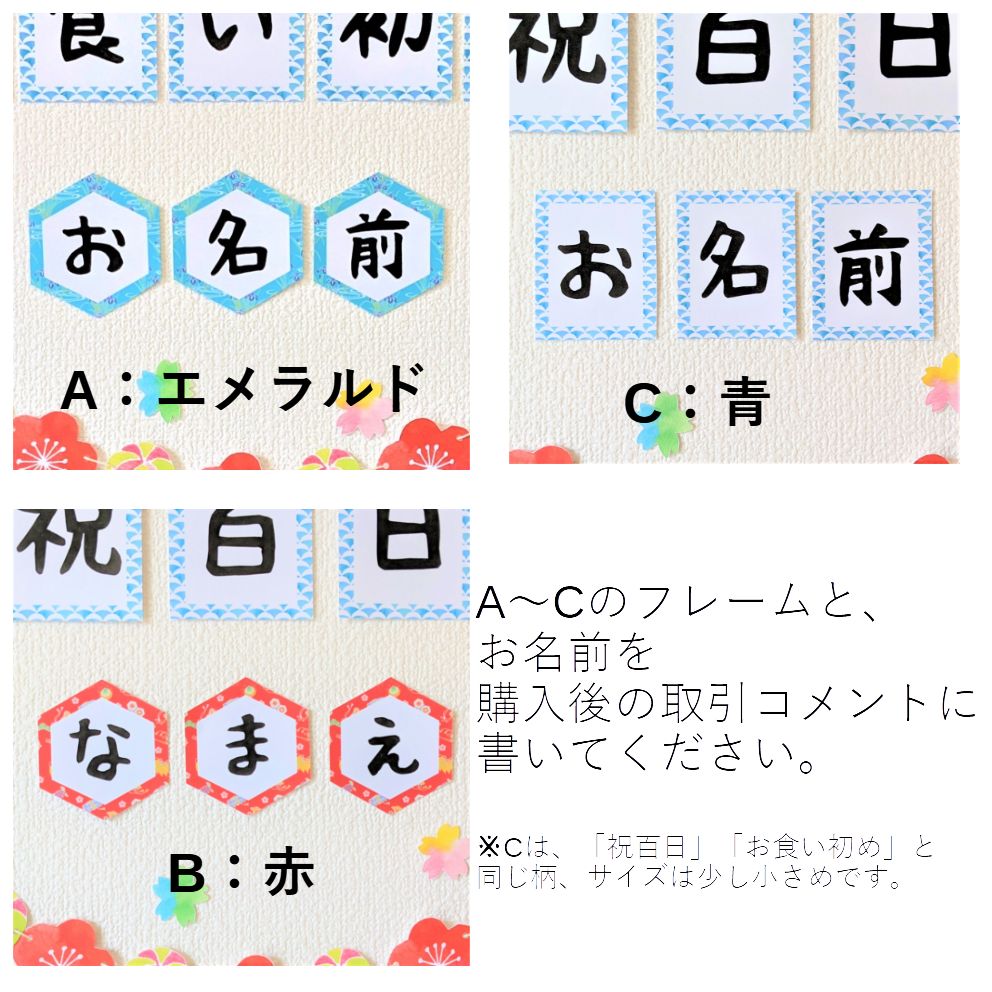 ・ご購入後のコメント欄に「商品写真にあるお名前フレームA~Cから、ご希望のものを1つ」と、「お名前(4文字以内)」をお書きください。漢字、ひらがな、カタカナOK。ただし、漢字で正しい変換が出ないときは 作成前にひらがなでの表記をご提案させていただきます。