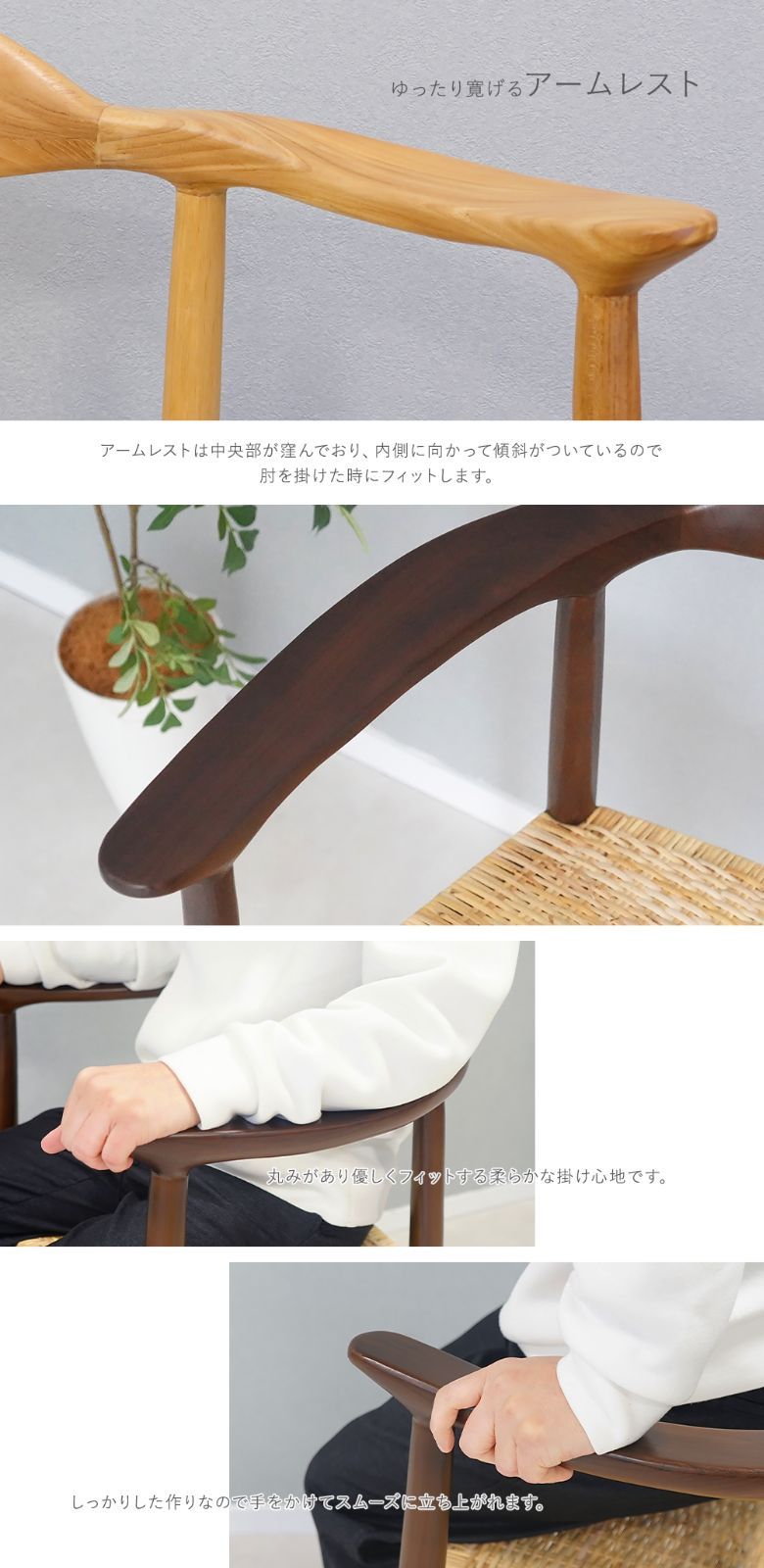 ●背もたれから伸びたアームレストは、ちょうどよい位置で腕にフィットします。