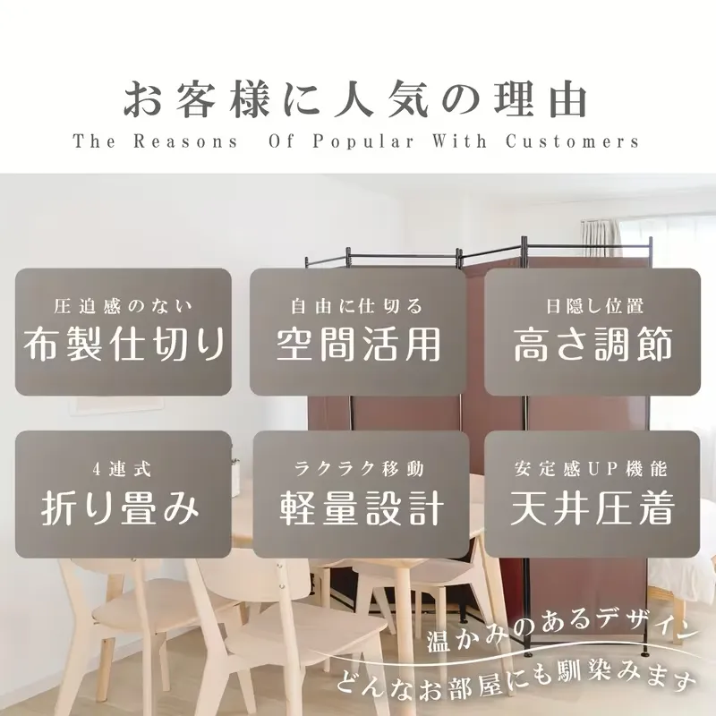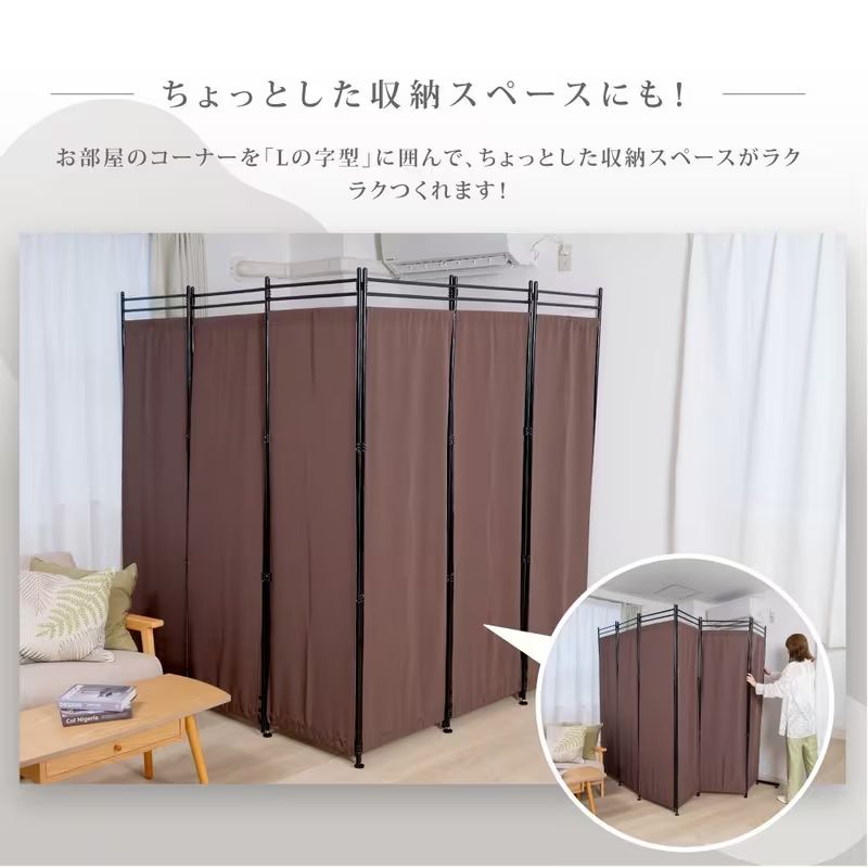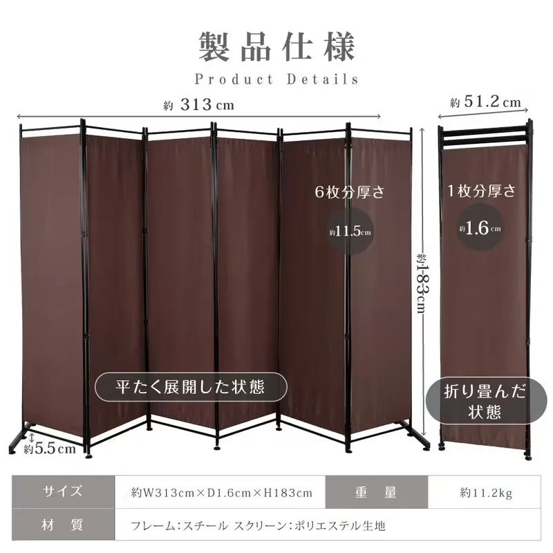 サイズ クロースパーテーション本体 : (約)幅313cm×高さ181cm(6枚全開にした場合) ※1枚辺りの幅52cm 6連タイプ 6枚で個室も作れる。長さがあるので使い方自由自在