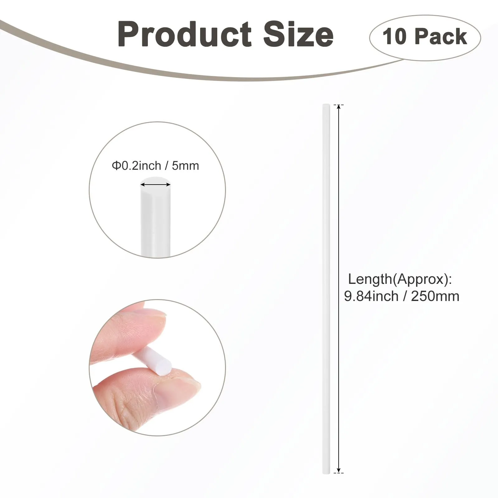 [サイズ&パッケージ] - 断面形状:丸い、表面:スムース、幅5mm/0.2インチ、長さ:250mm/9.84インチ、パッケージに含まれるもの:10パックのAB Sプラスチックロッド