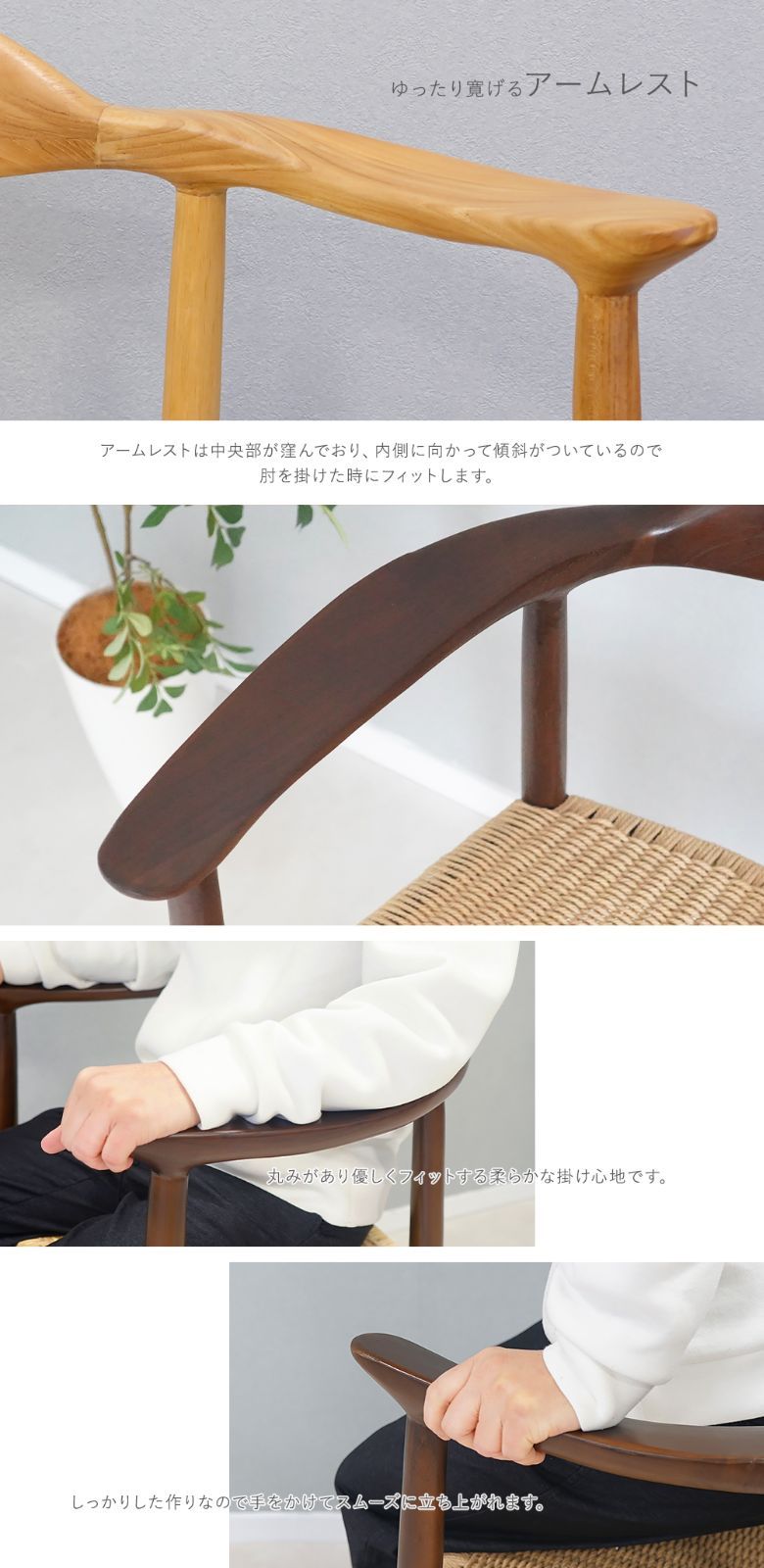 ●背もたれから伸びたアームレストは、ちょうどよい位置で腕にフィットします。