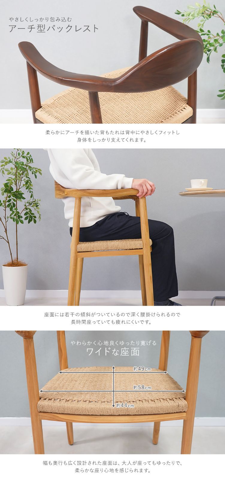 ●アーチ型の背もたれは、背中にやさしくフィットし、体をしっかり支えてくれます。