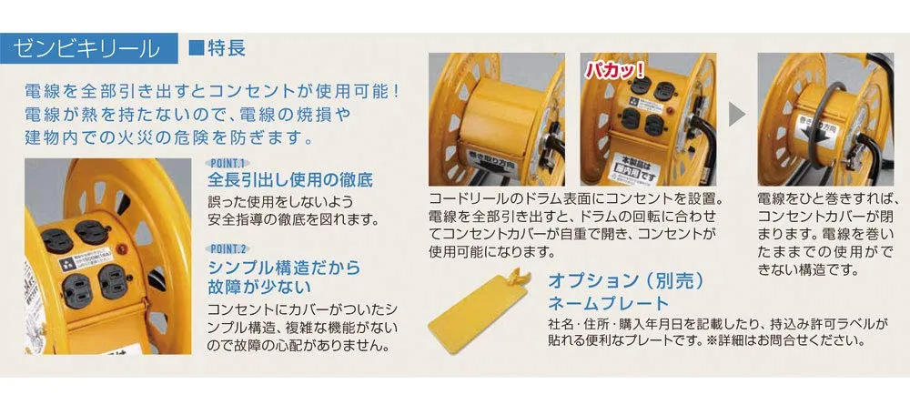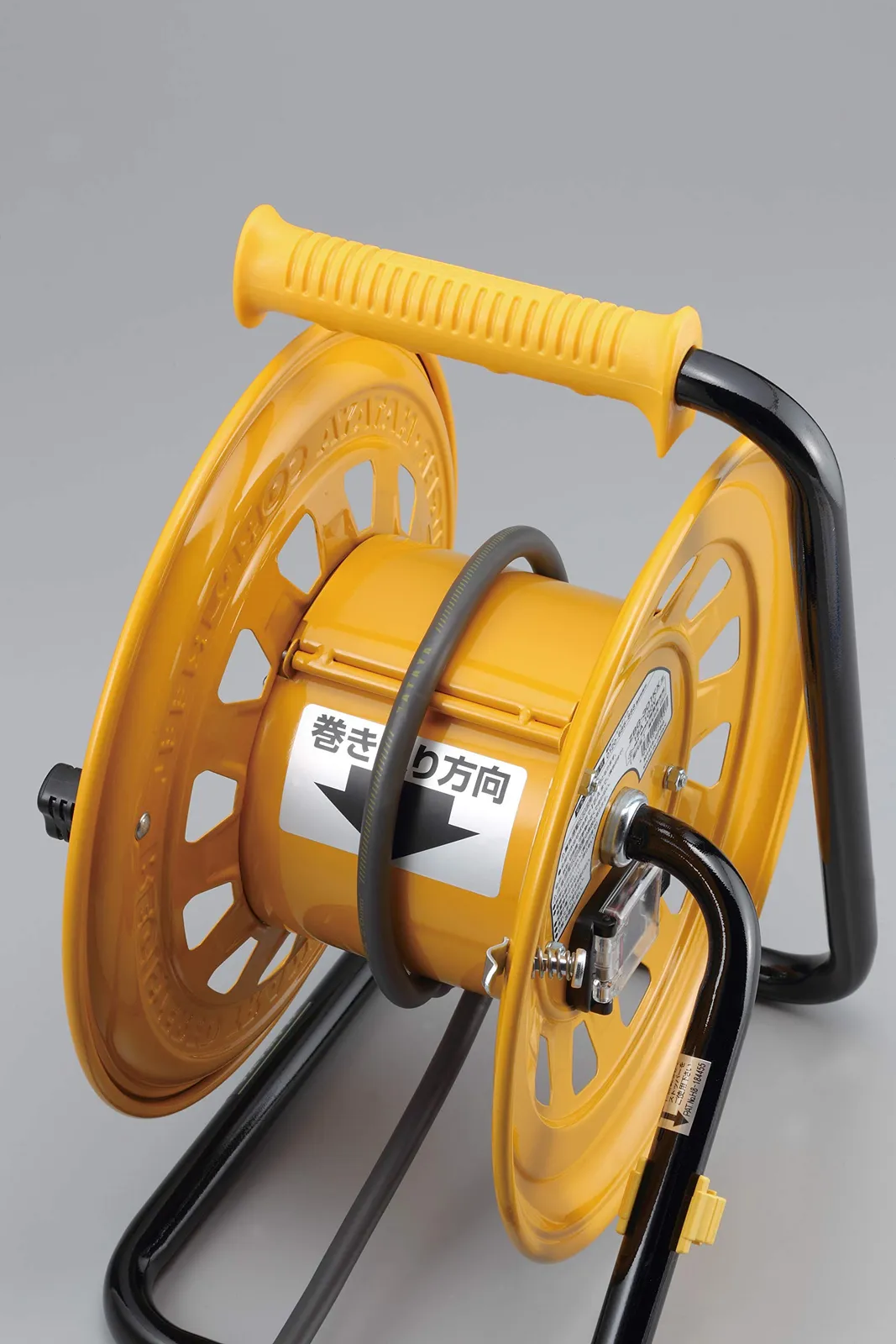 その他特長:漏電遮断器(過負荷短絡保護兼用型)、コンセント防塵シャッター、2P/2P接地付兼用ニュートビプラグ、パイロットランプ内蔵、ドラム空転止め(ブレーキストッパー)