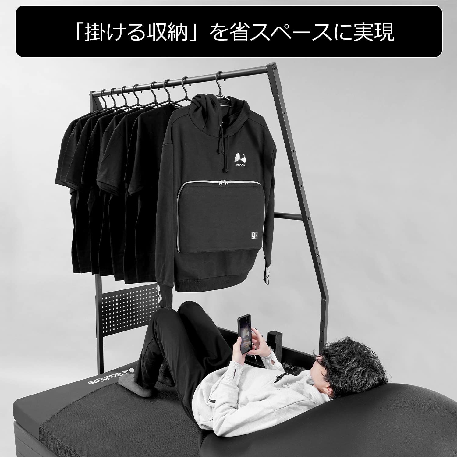 ベッド上空のデッドスペースを活用して「掛ける収納」を実現する、“ものぐさ民のためのハンガーラックが登場です。