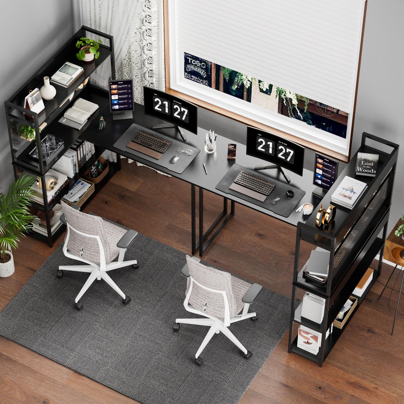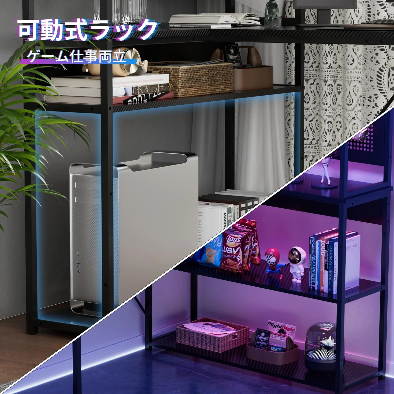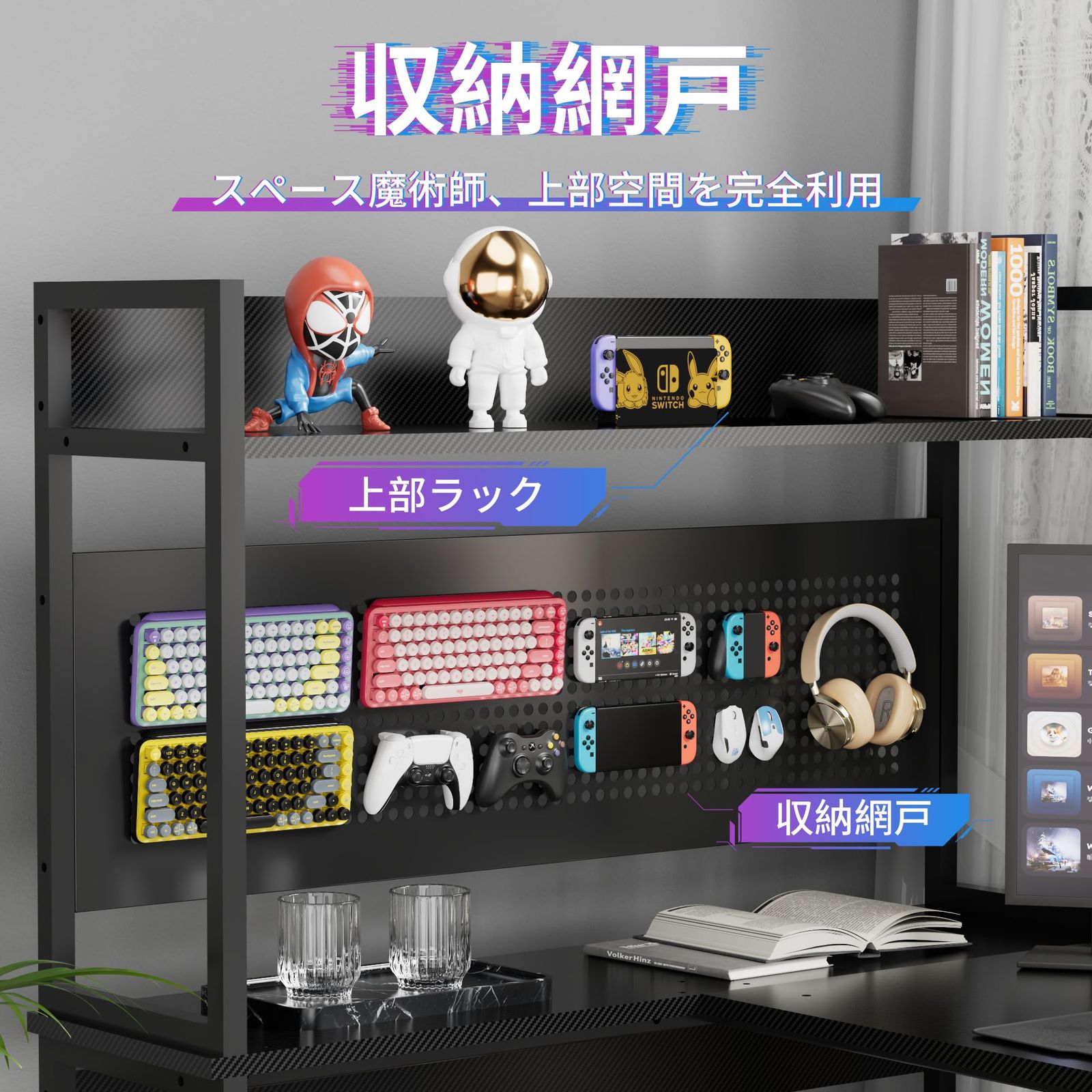 「空間魔術師収納ラック」限りがあるスペースで、最も大きい収納空間を探す。そらが本製品の設計理念である。Alebertラック付きL字デスク約90*25cmの収納ラックを四段階を提供し、上部空間を更に開発のため、収納網も付いている、飾りもフックも、お好みならなんでもかけられる。