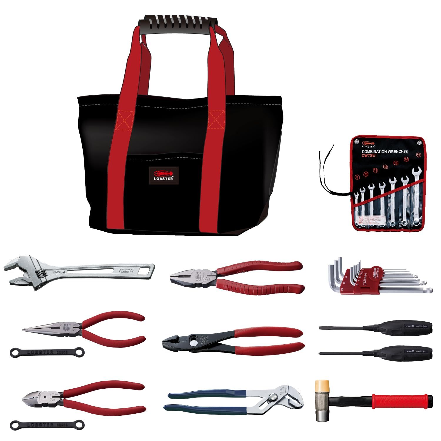 ●セット内容:ハイブリッドモンキレンチ(YM36XG)、ネジアンギラストリグリッププライヤタイプ(TG200NA)、コンボネーションレンチセット(CW7SET)、ペンチ(J175P)、強力ニッパ―(J150KNG)、ラジオペンチ(J1150RG)、ウォーターポンププライヤ(WP250H)、六角棒レンチセット(BWM9S)、ドライバー(JBDP-2、JBDM-60)、片手ハンマー(CH-10LT)、ツールバッグ