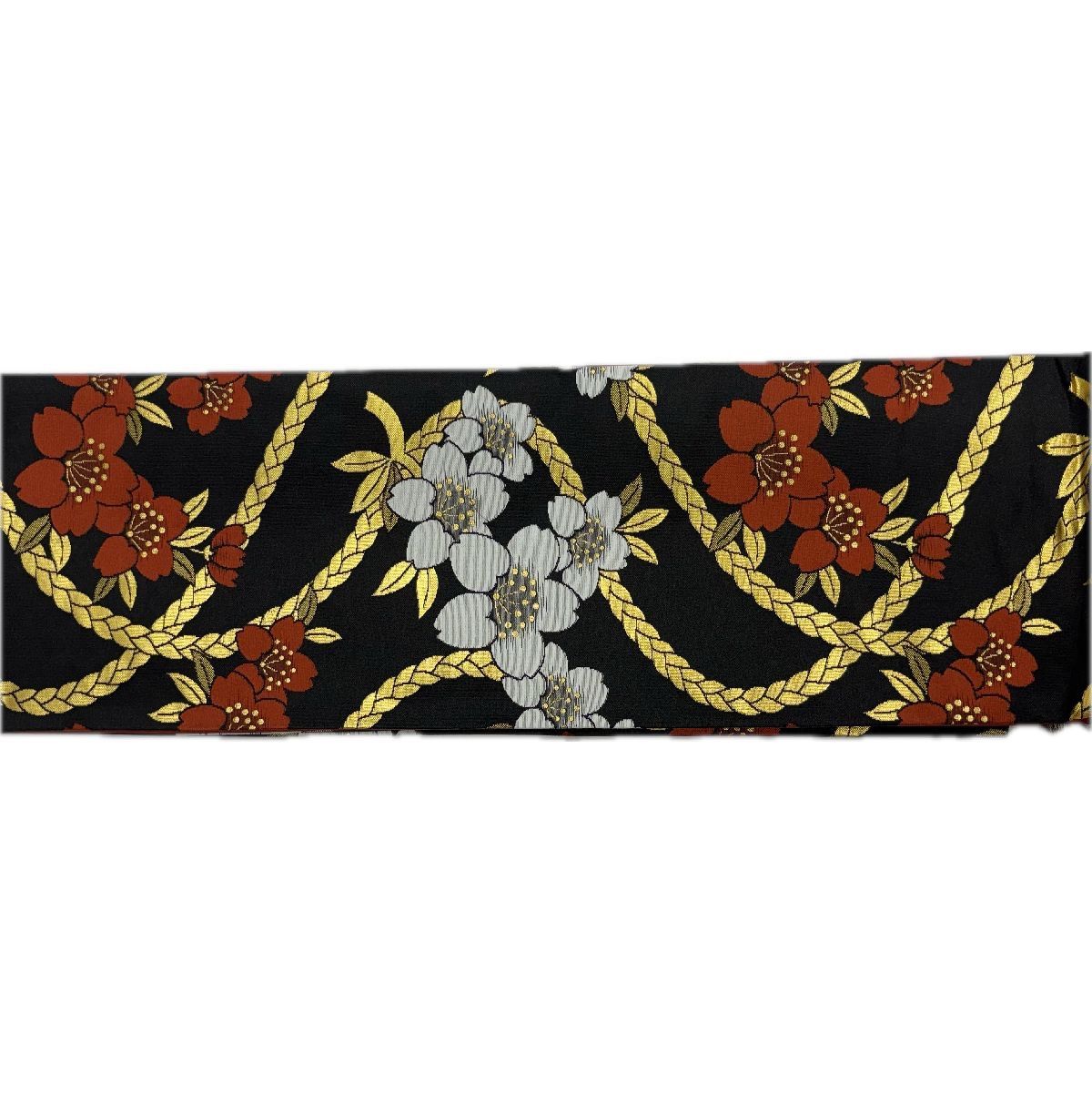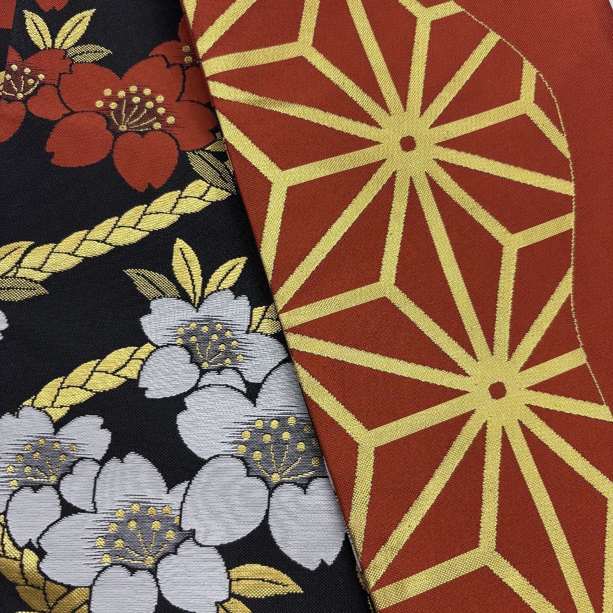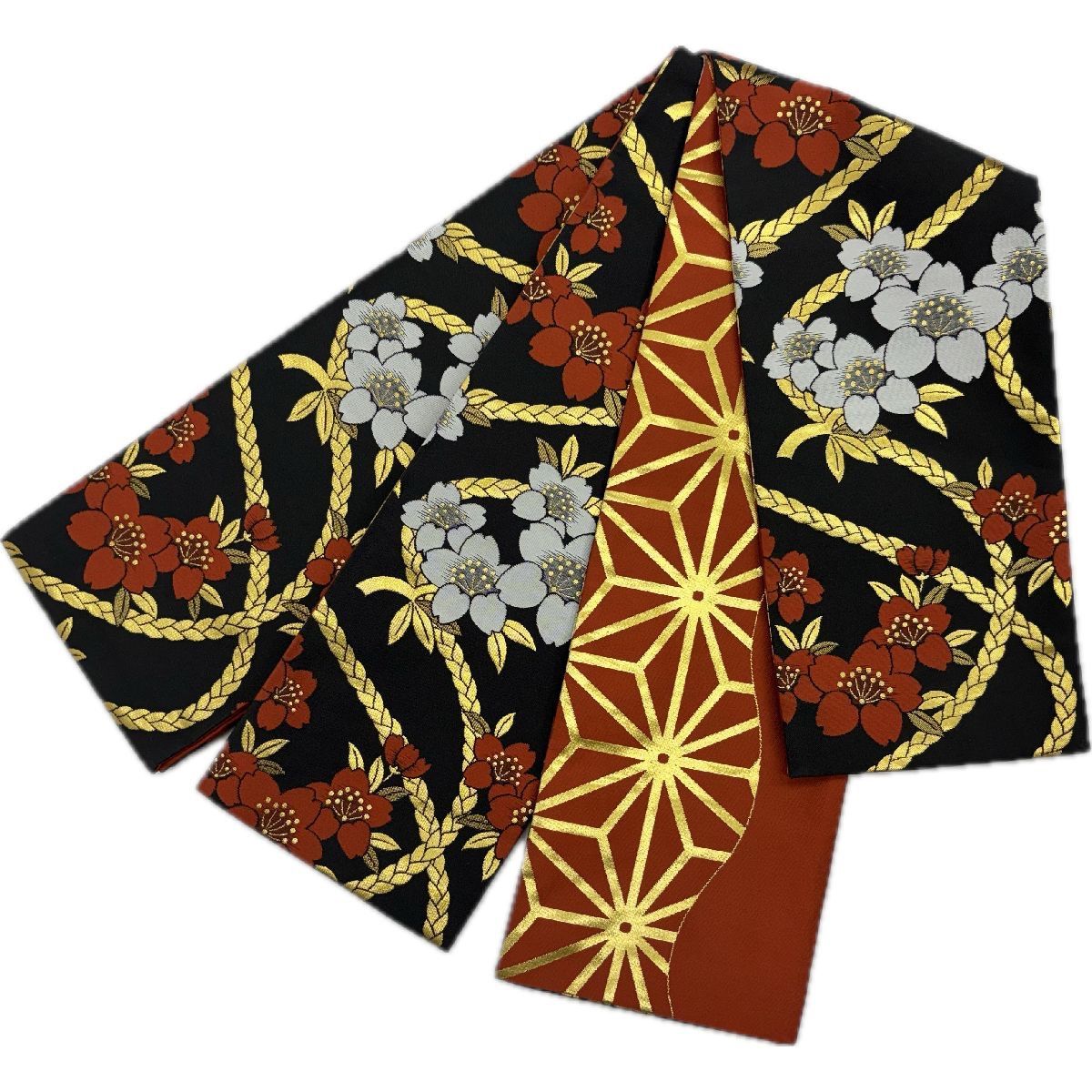 【色柄】 表柄 地色黒 金蘭 桜 さくら サクラ 裏柄 地色海老茶色 麻の葉 日本舞踊 日舞 踊り衣装 舞台衣装 演劇衣装 祭り衣装 歌舞伎 和装 アニメ コスプレ イベント KIMONO きもの おどり帯 ブラック 桜 花びら