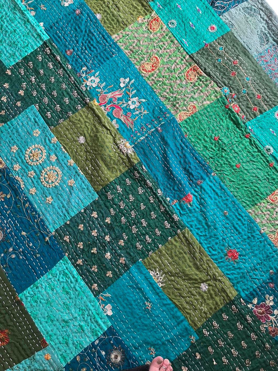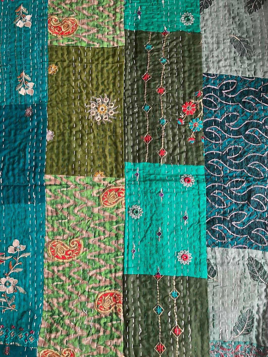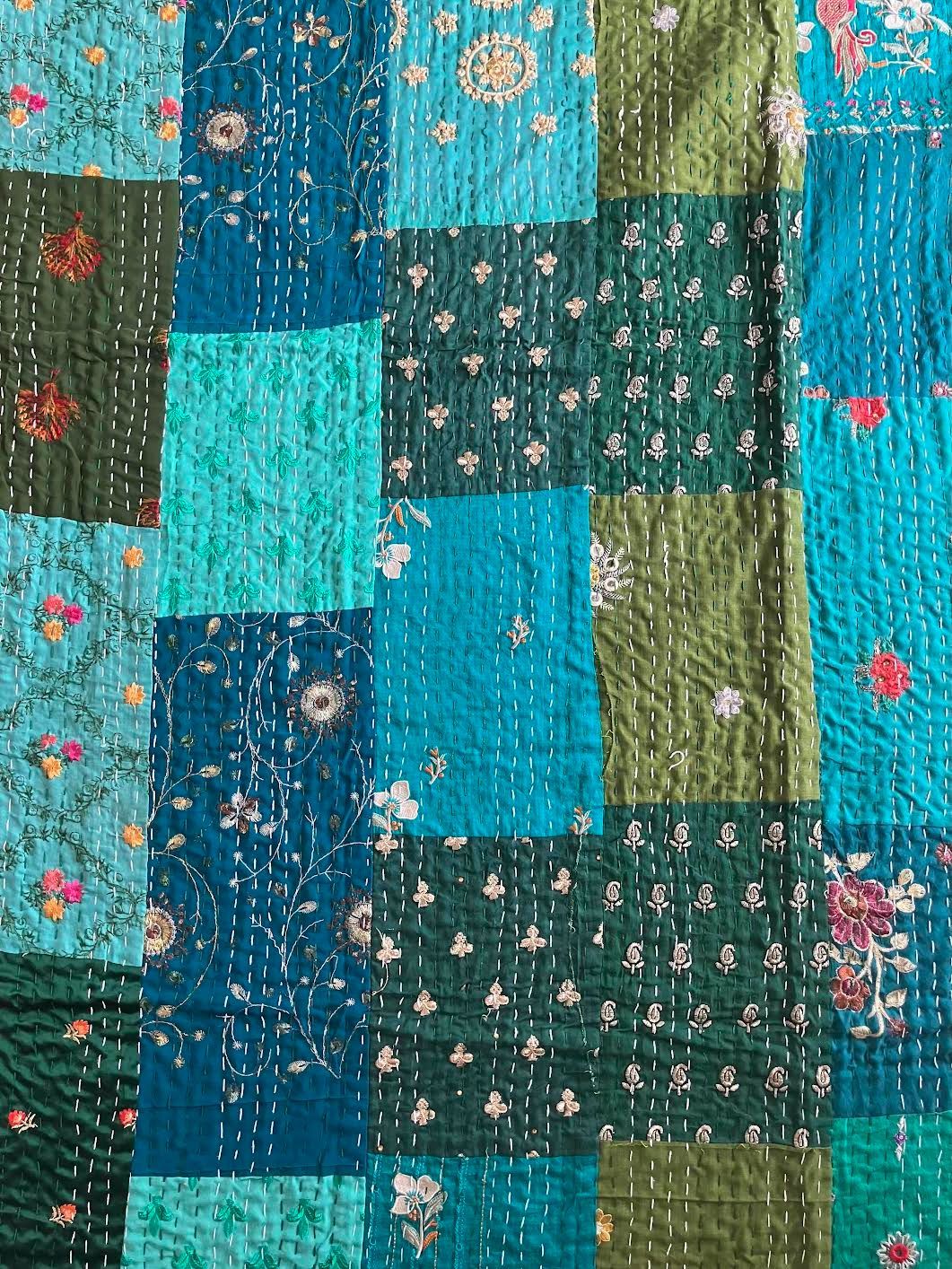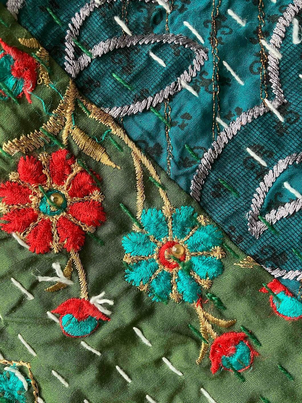 表面生地はインドの伝統衣装のサリーのビンテージ生地を何種類も使用してパッチワークで一枚の布を作っています。裏面生地はしっかりしたコットン生地で、緑色無地です。2枚の生地を重ねてから手刺繍でライン状に丁寧に仕上げています。