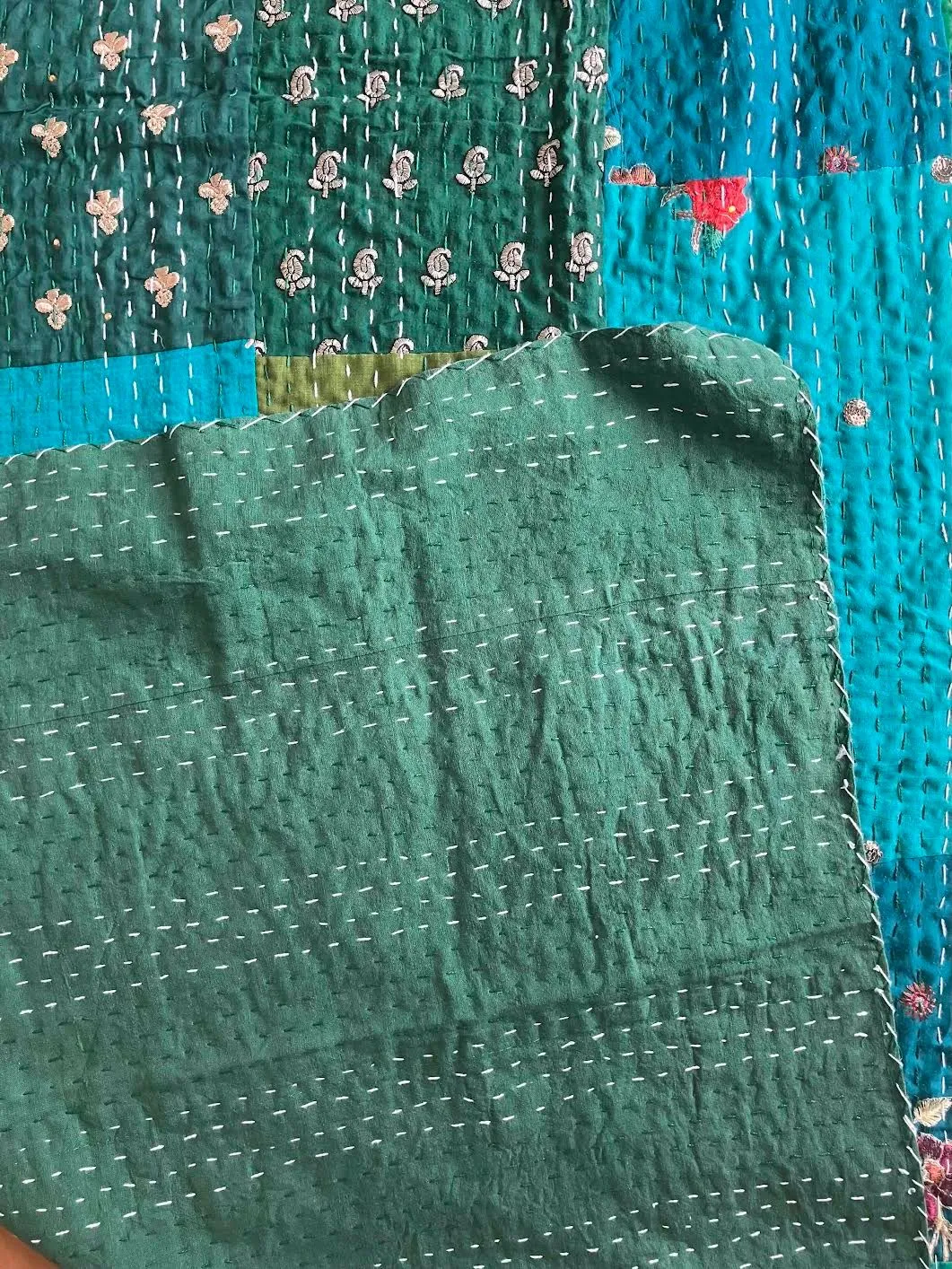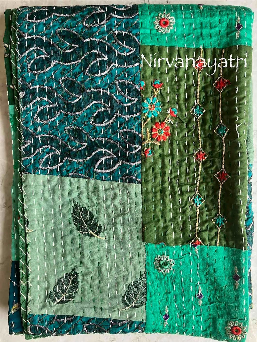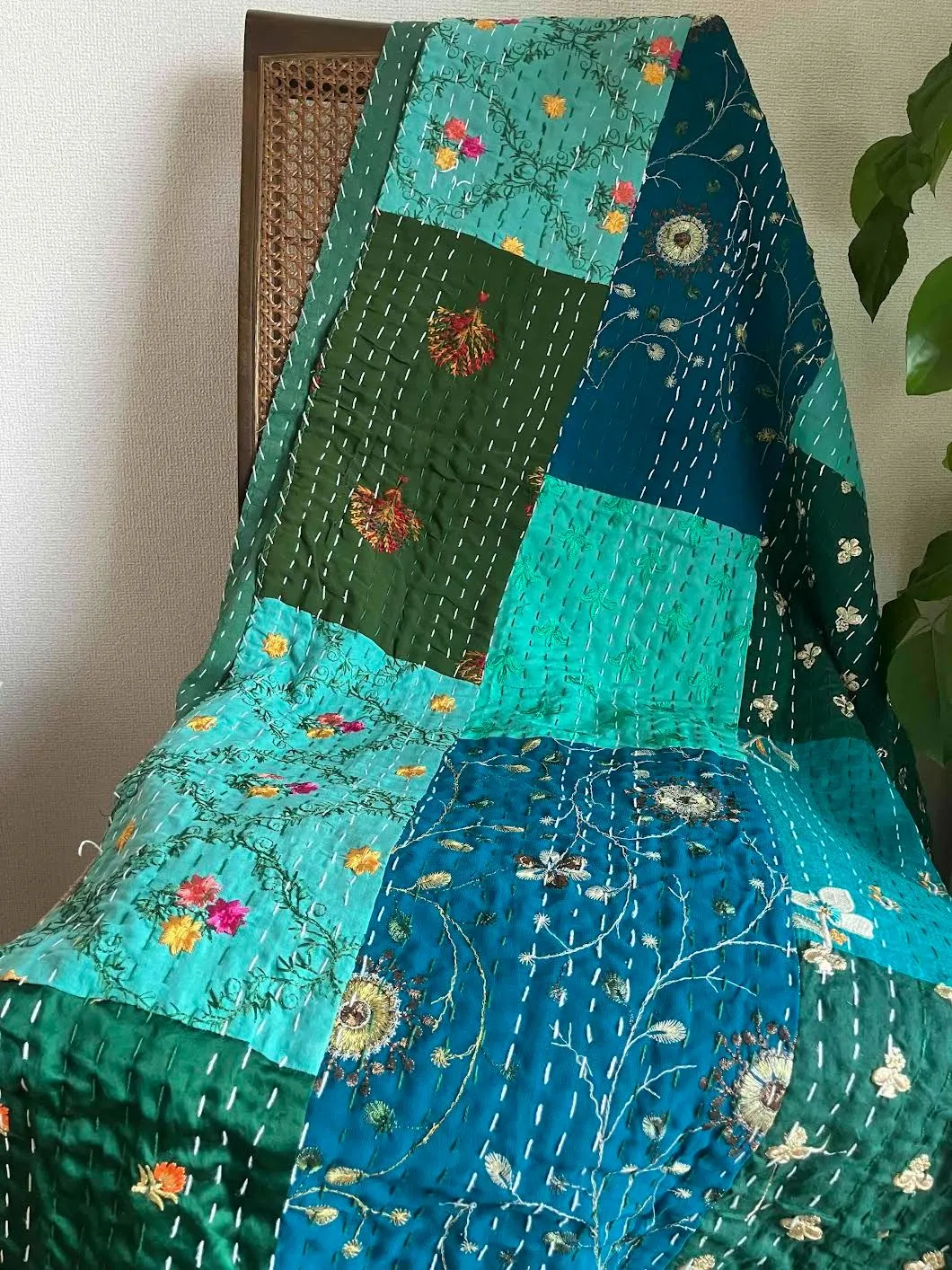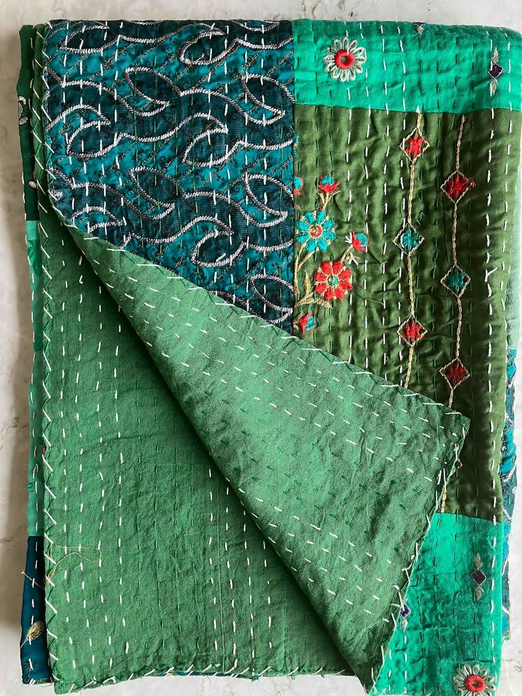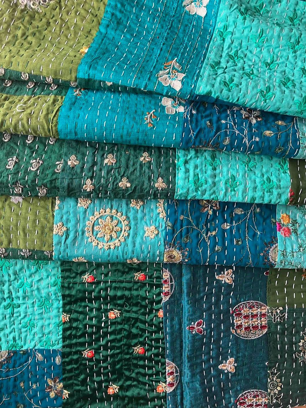表面生地はインドの伝統衣装のサリーのビンテージ生地を何種類も使用してパッチワークで一枚の布を作っています。裏面生地はしっかりしたコットン生地で、緑色無地です。2枚の生地を重ねてから手刺繍でライン状に丁寧に仕上げています。