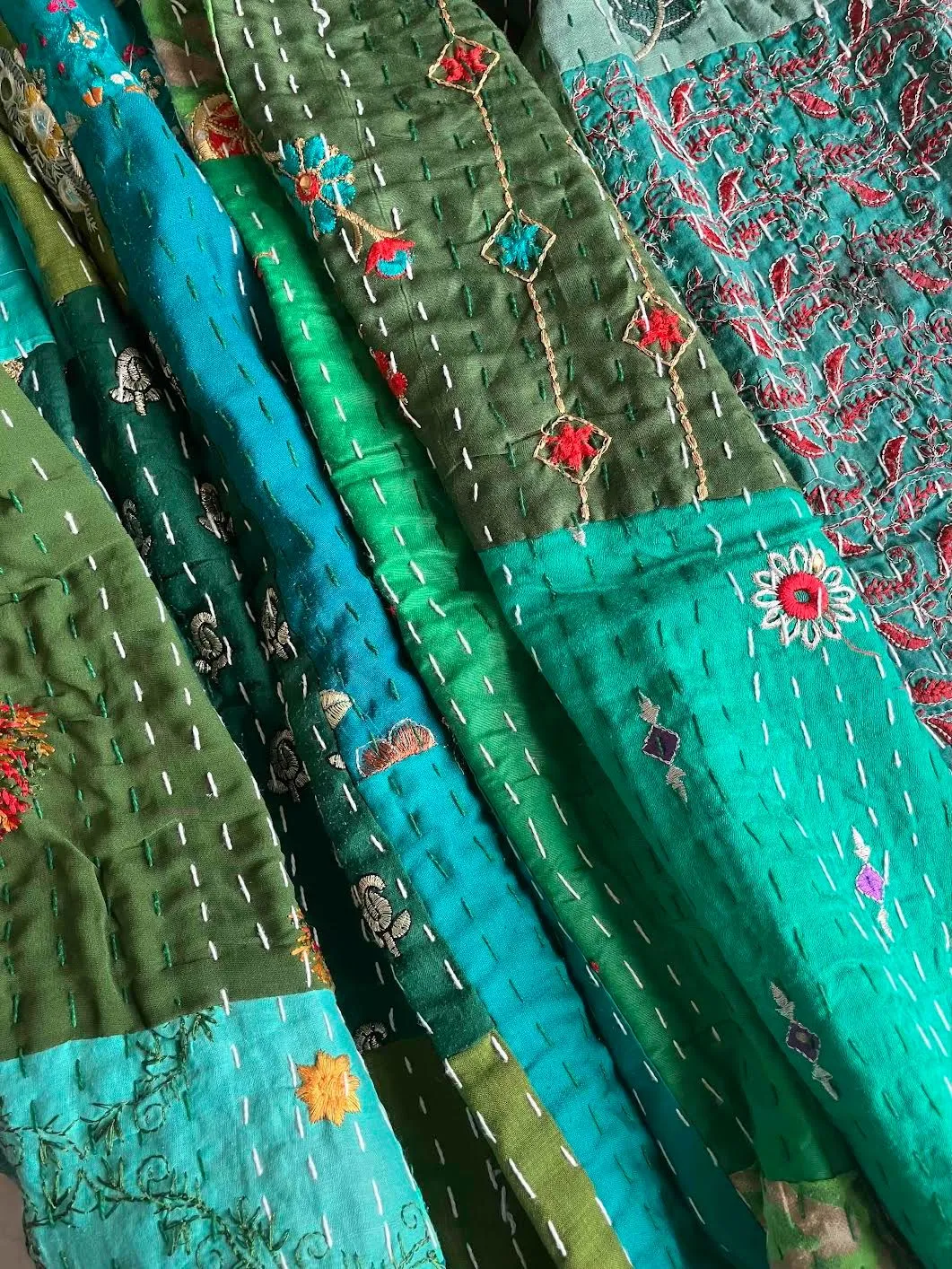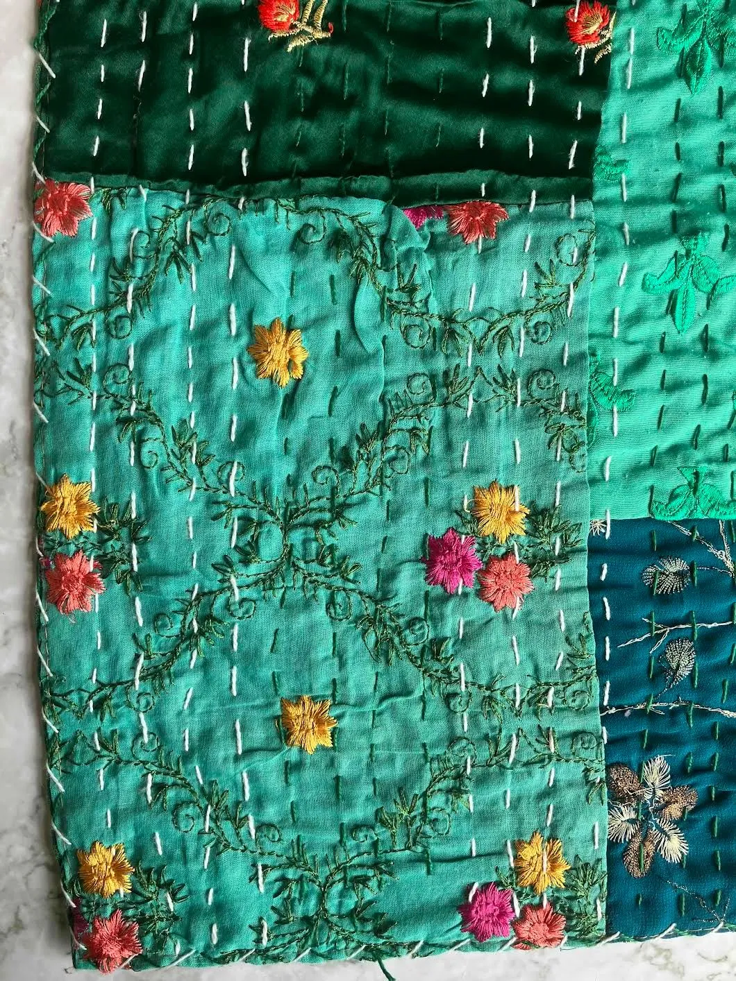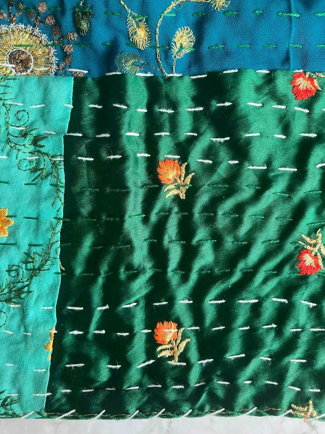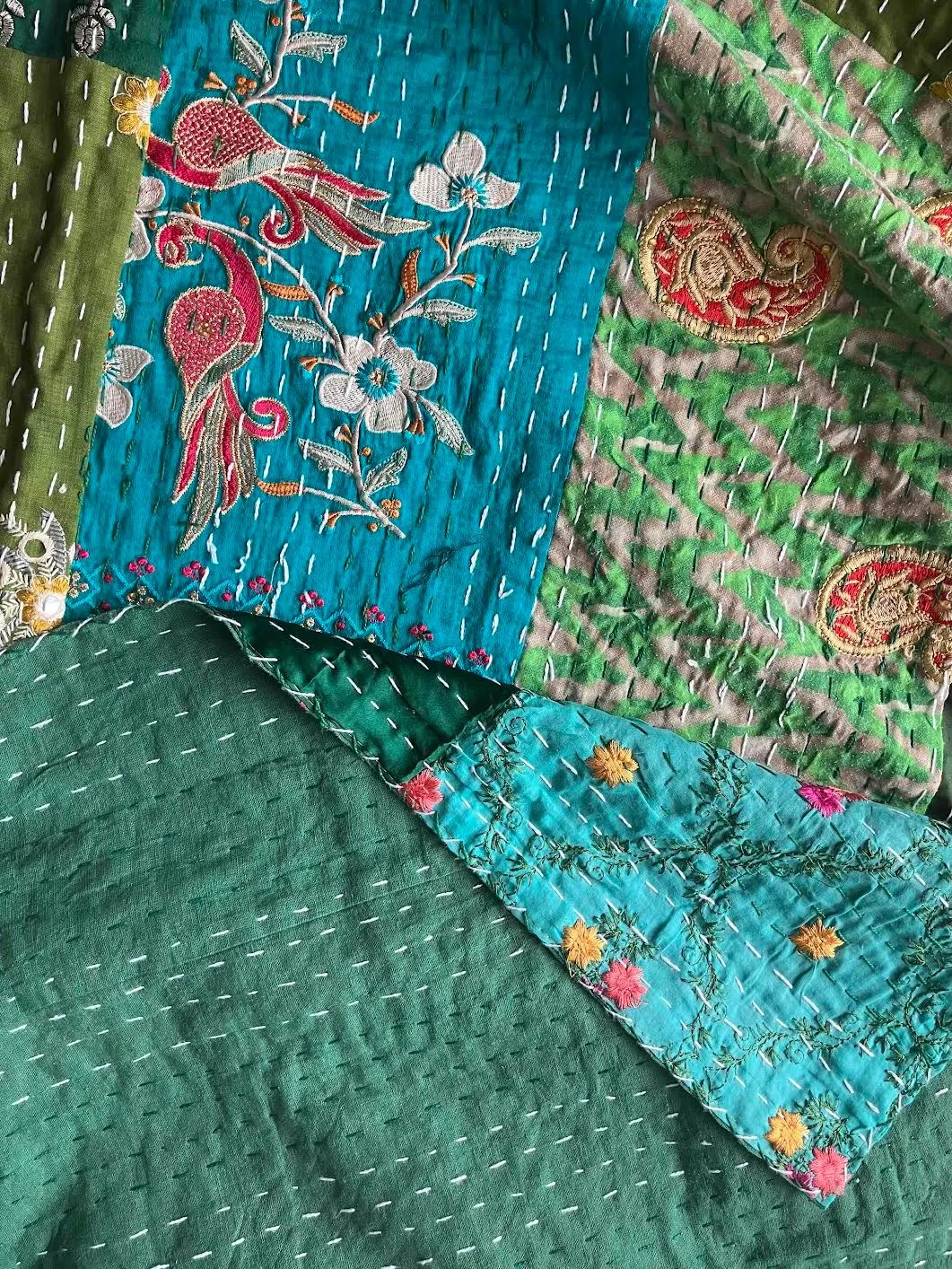 表面生地はインドの伝統衣装のサリーのビンテージ生地を何種類も使用してパッチワークで一枚の布を作っています。裏面生地はしっかりしたコットン生地で、緑色無地です。2枚の生地を重ねてから手刺繍でライン状に丁寧に仕上げています。