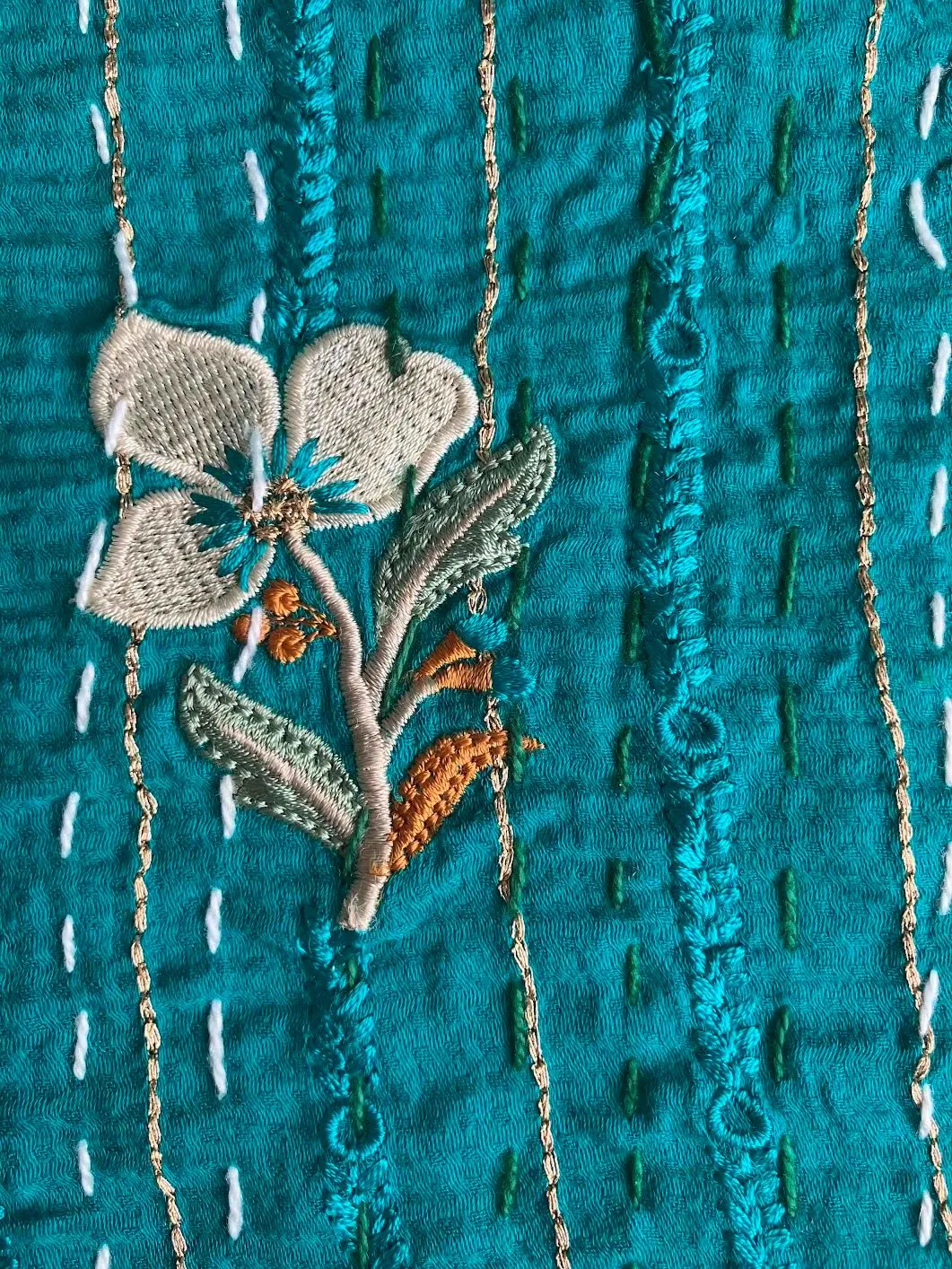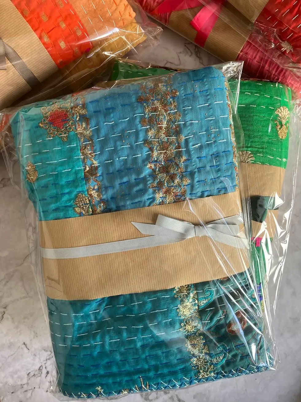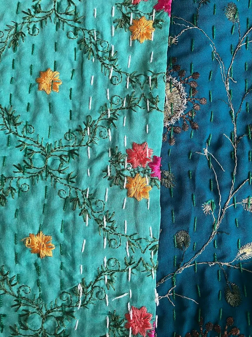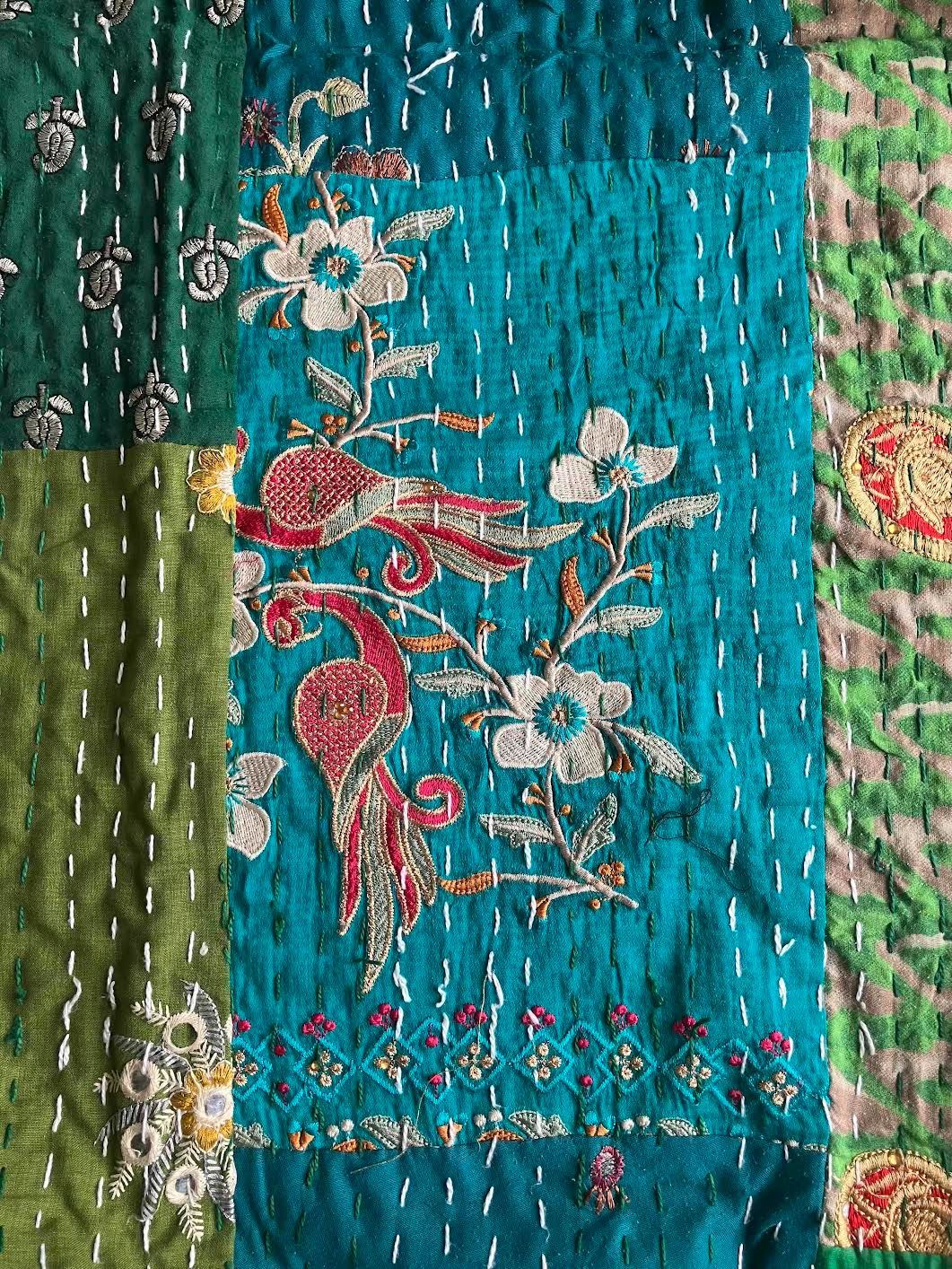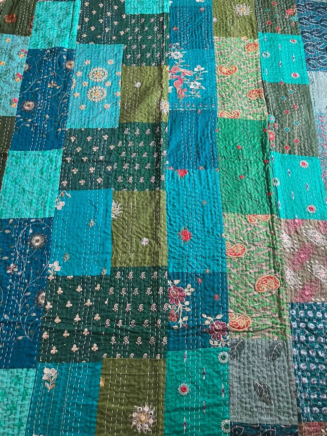 表面生地はインドの伝統衣装のサリーのビンテージ生地を何種類も使用してパッチワークで一枚の布を作っています。裏面生地はしっかりしたコットン生地で、緑色無地です。2枚の生地を重ねてから手刺繍でライン状に丁寧に仕上げています。