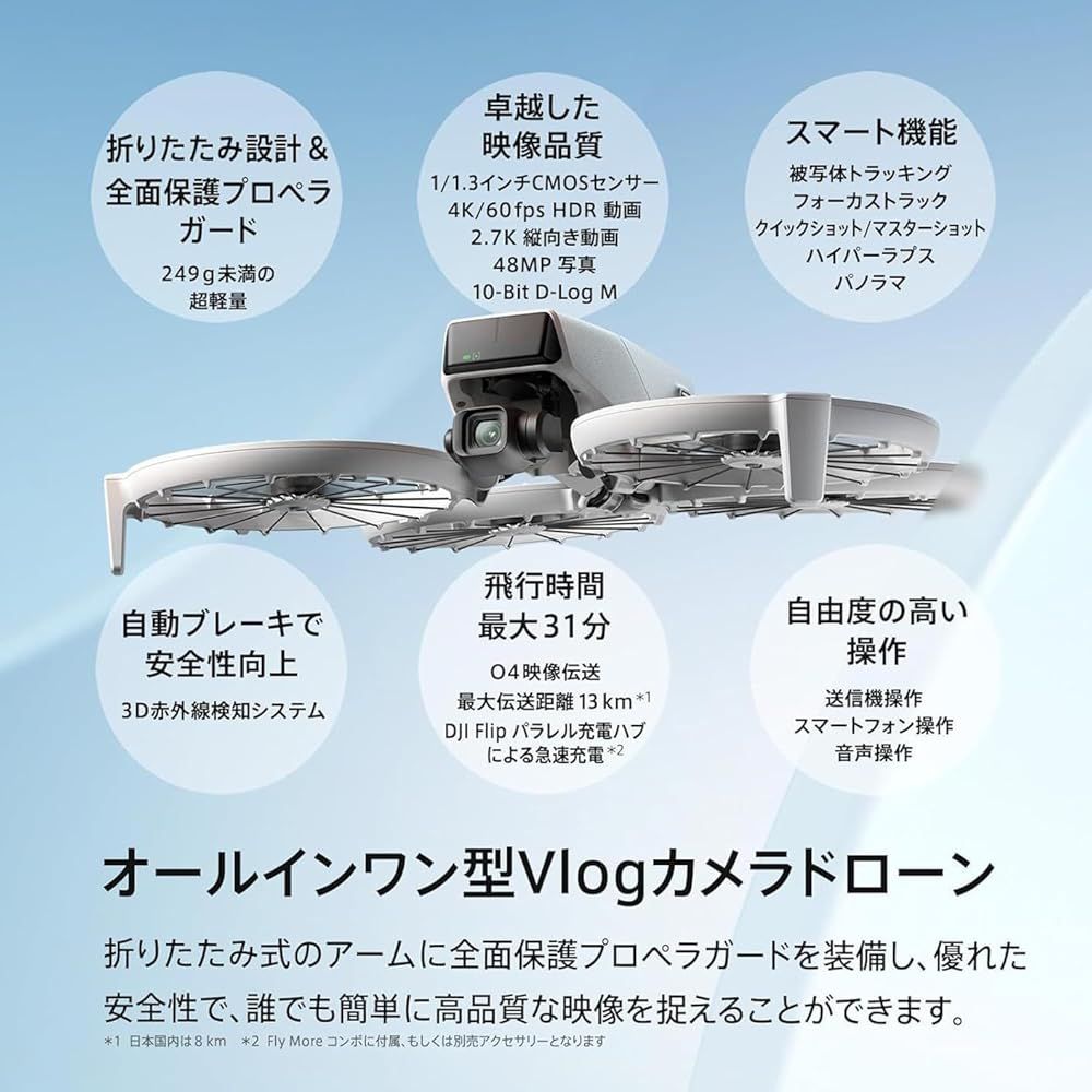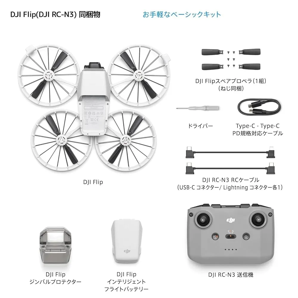DJI Flip、DJI RC-N3送信機、インテリジェント フライトバッテリー(1個)、その他が含まれています。初心者に最適です。