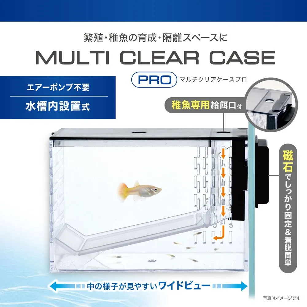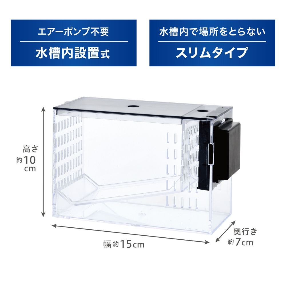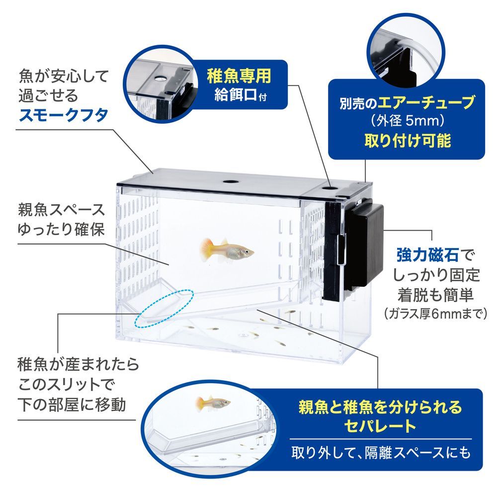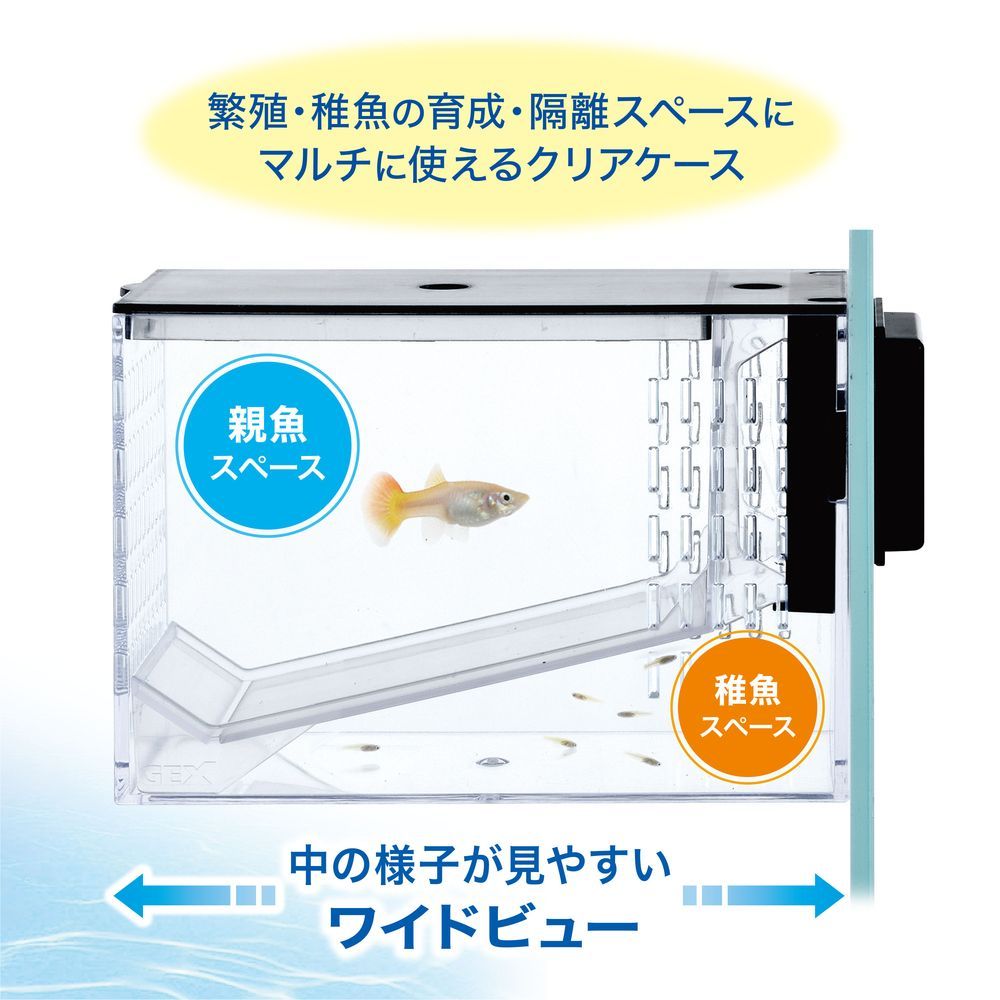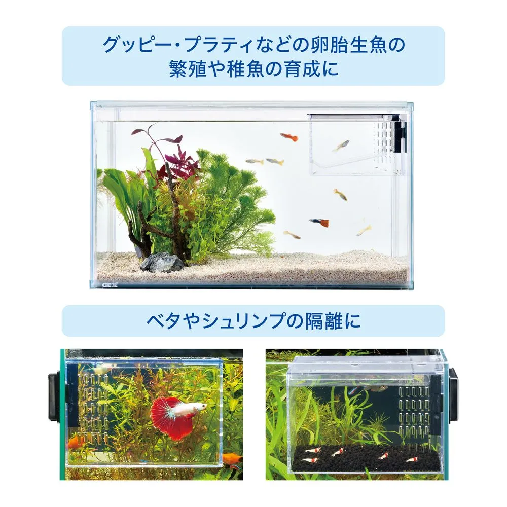 熱帯魚や卵胎生魚の繁殖・稚魚の育成・隔離スペースに!親魚と稚魚を分けられるセパレート&稚魚専用給餌口付きなので、元気に育てられる。グッピー・プラティなどの卵胎生魚の繁殖や稚魚の育成、ベタやシュリンプの隔離など、マルチに使用可!淡水・海水両用。