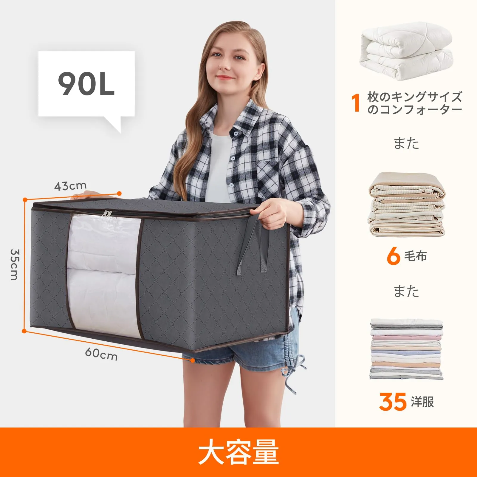 大容量:この掛布団収納バッグは、23.6インチ(60cm)×16.9インチ(43cm)×13.7インチ(35cm)のサイズで、90L収納可能です。掛布団、毛布、枕、ぬいぐるみ、ジャケット、または他の衣類を収納するのに十分な広さがあります。