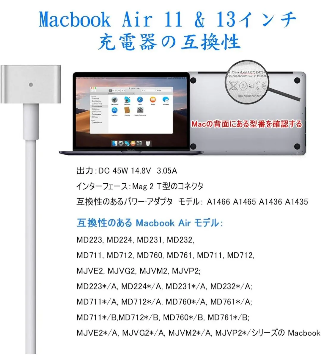 【85W T型電源アダプタ】アダプタは2012 中期以降に発売されるアップル Macbook Pro 13/15/17 インチに適用します。モデル番号: A1424 A1398 A1435 A1502 A1811 A1436 A1466 A1465。※注意:2017年以降に生産されたどのmacbookモデルとも互換性がありません。 購入する前に、ラップトップモデルが適用可能かどうかを確認してください。