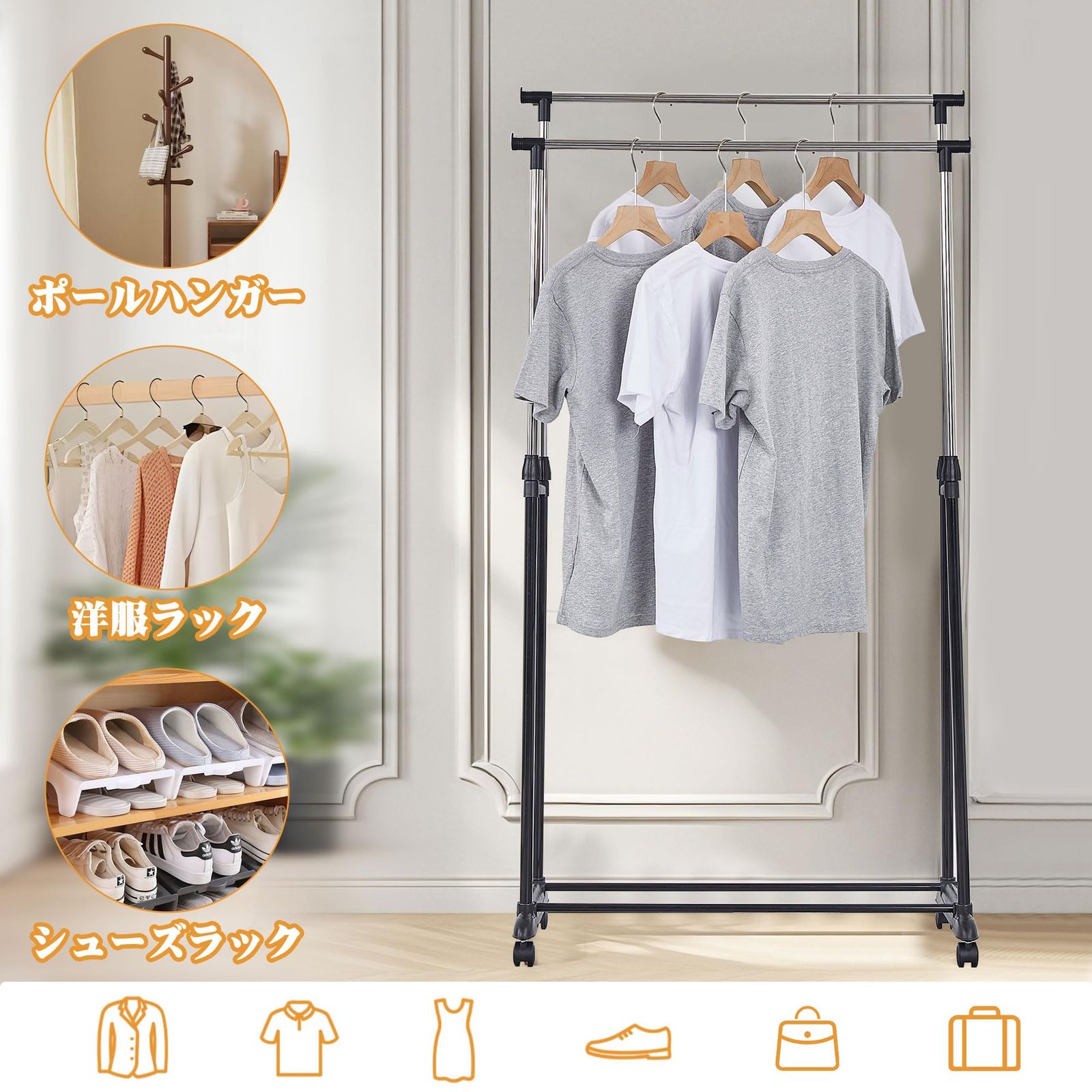 ハンガーラックは衣類だけでなく、帽子やカバンなども収納でき、スペースを最大限に活用できます。キャスター付き、高さ調節が可能なので、自分のニーズに合わせてご自由にお使いください。