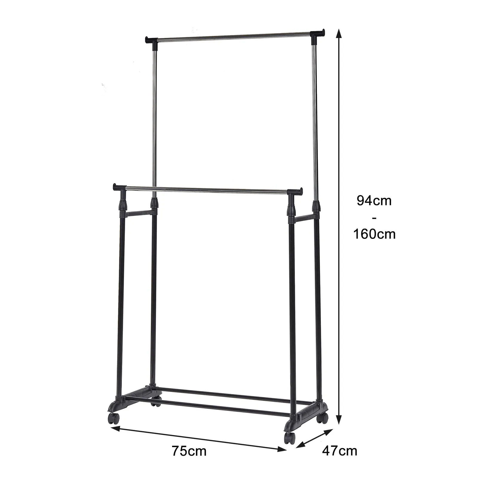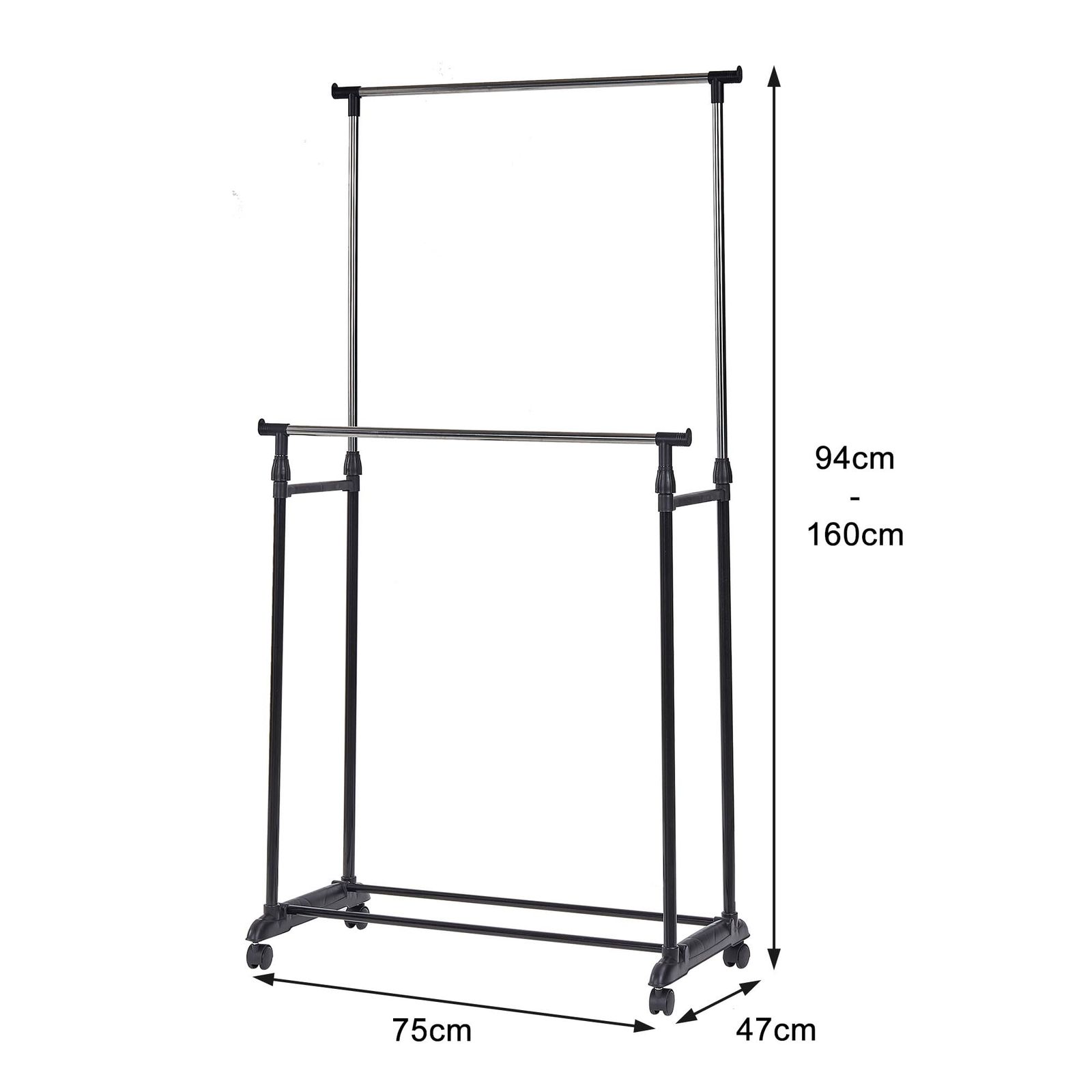 VECELO ハンガーラック ダブルパイプ コートハンガー 幅75×奥行47×高さ160cm 2段 高さ伸縮パイプ ポールハンガー 組み立て簡単 キャスター付き スリム 洋服掛け 帽子掛け 衣類収納 省スペース 高さ調節可能 スタンド コンパクト シンプル ブラック