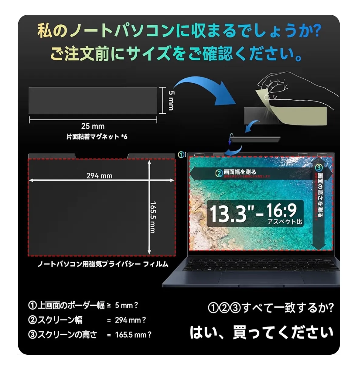 【対応デバイス】画面の表示可能画像領域が以下のパラメータを満たすノートパソコンにのみ適しています。ご注文の前に、ノートパソコン画面の表示可能画像領域の値を測定して確認してください。幅:294mm、高さ:166mm、対角線:13.3インチ(337.8mm)。HP、Lenovo、Dell、Acer、Asus、Samsung、Envy、Toshiba、その他の13.3インチ16:9アスペクト比のノートパソコンブランドと互換性があります。